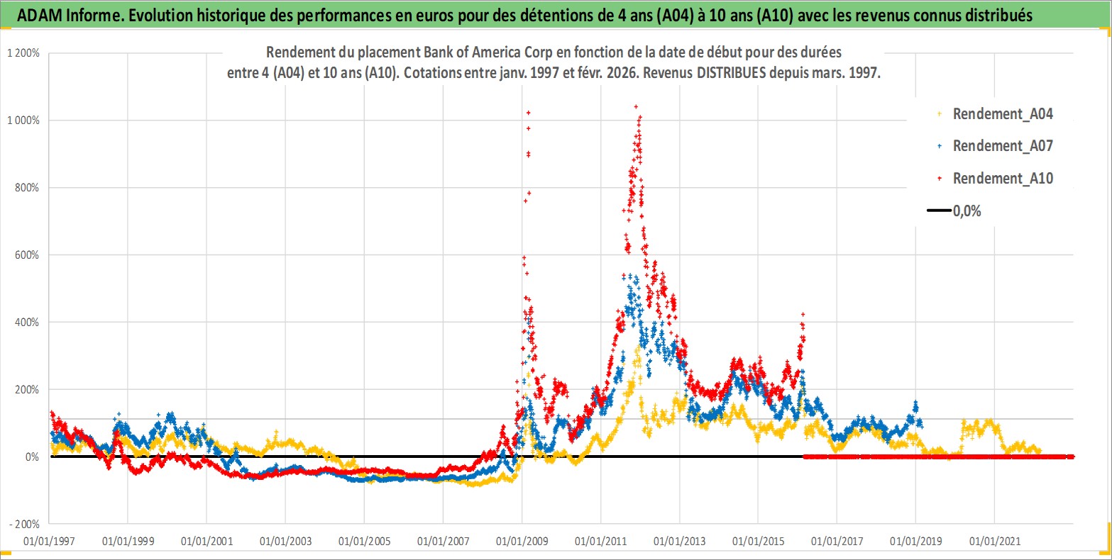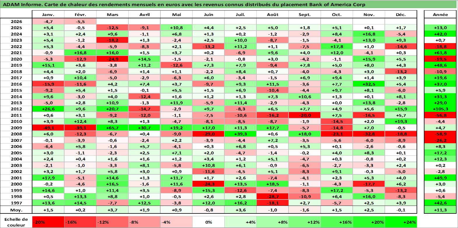 Site dédié aux investisseursPage dédiée sur site financeAnalyse des valorisations hebdomadaires de l'action Bank of America Corp. Cet actif est cote en USD. Les valorisations sont en contrevaleur EURO et couvrent les semaines 1997W01 a 2026W09. Les revenus de cet actif financier sont pris en compte depuis la semaine 1997W10. La note globale ESG de cet actif est estimee a 7.0 (apres rebasage entre 0 et 20).