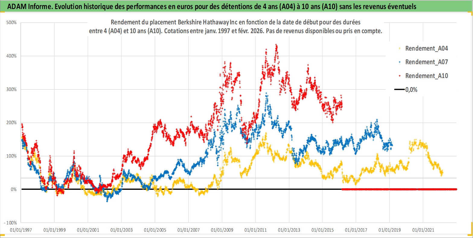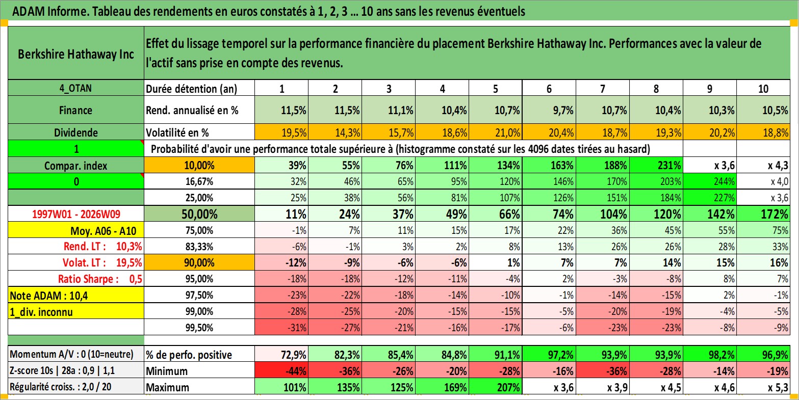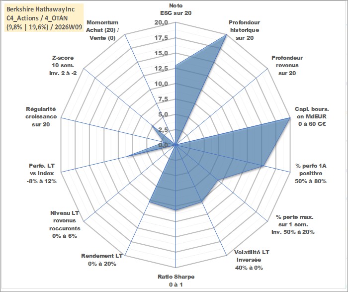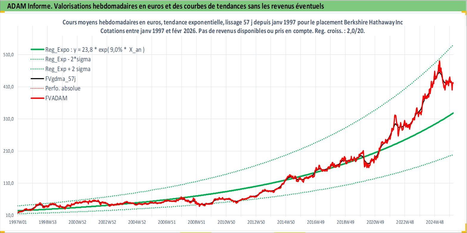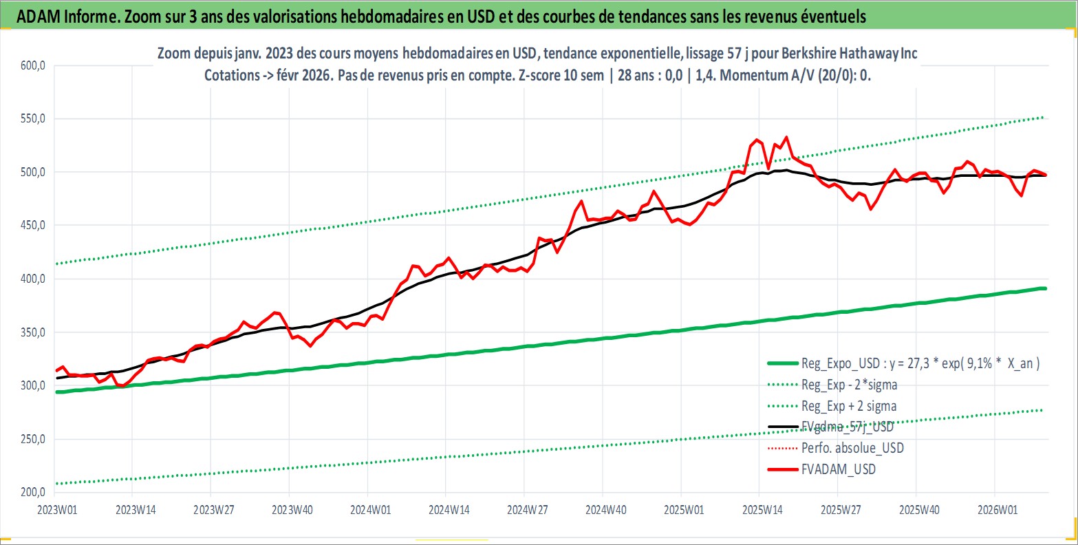 Site dédié aux investisseursPage dédiée sur site financeAnalyse des valorisations hebdomadaires de l'action Berkshire Hathaway Inc. Cet actif est cote en USD. Les valorisations sont en contrevaleur EURO et couvrent les semaines 1997W01 a 2026W09. Les revenus de cet actif financier ne sont pas connus car non existants ou non disponibles sur le site Yahoo Finance. La note globale ESG de cet actif est estimee a 13.0 (apres rebasage entre 0 et 20).