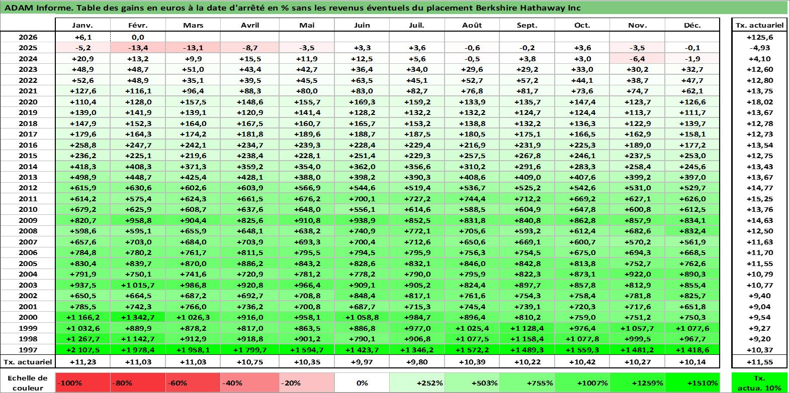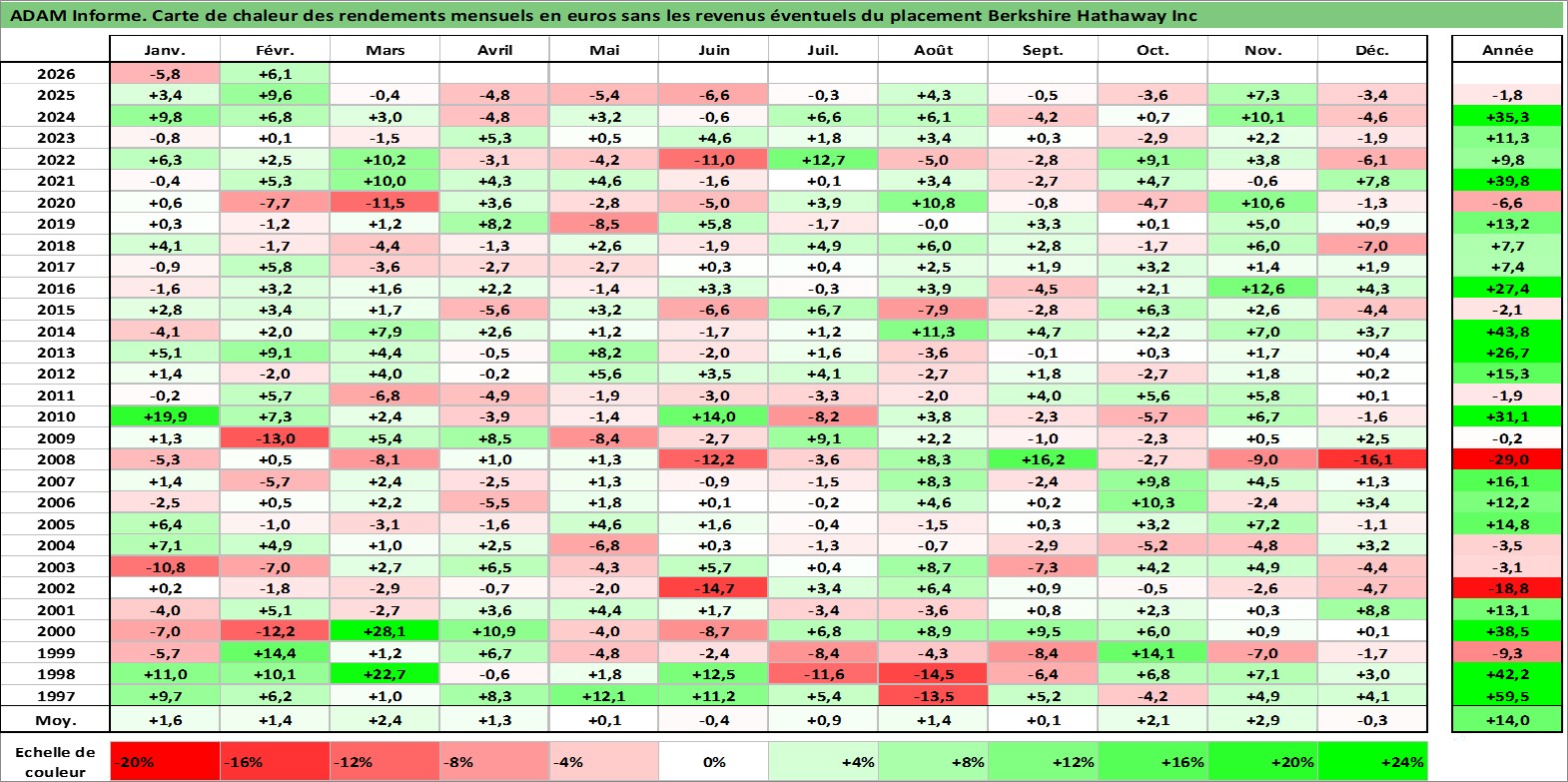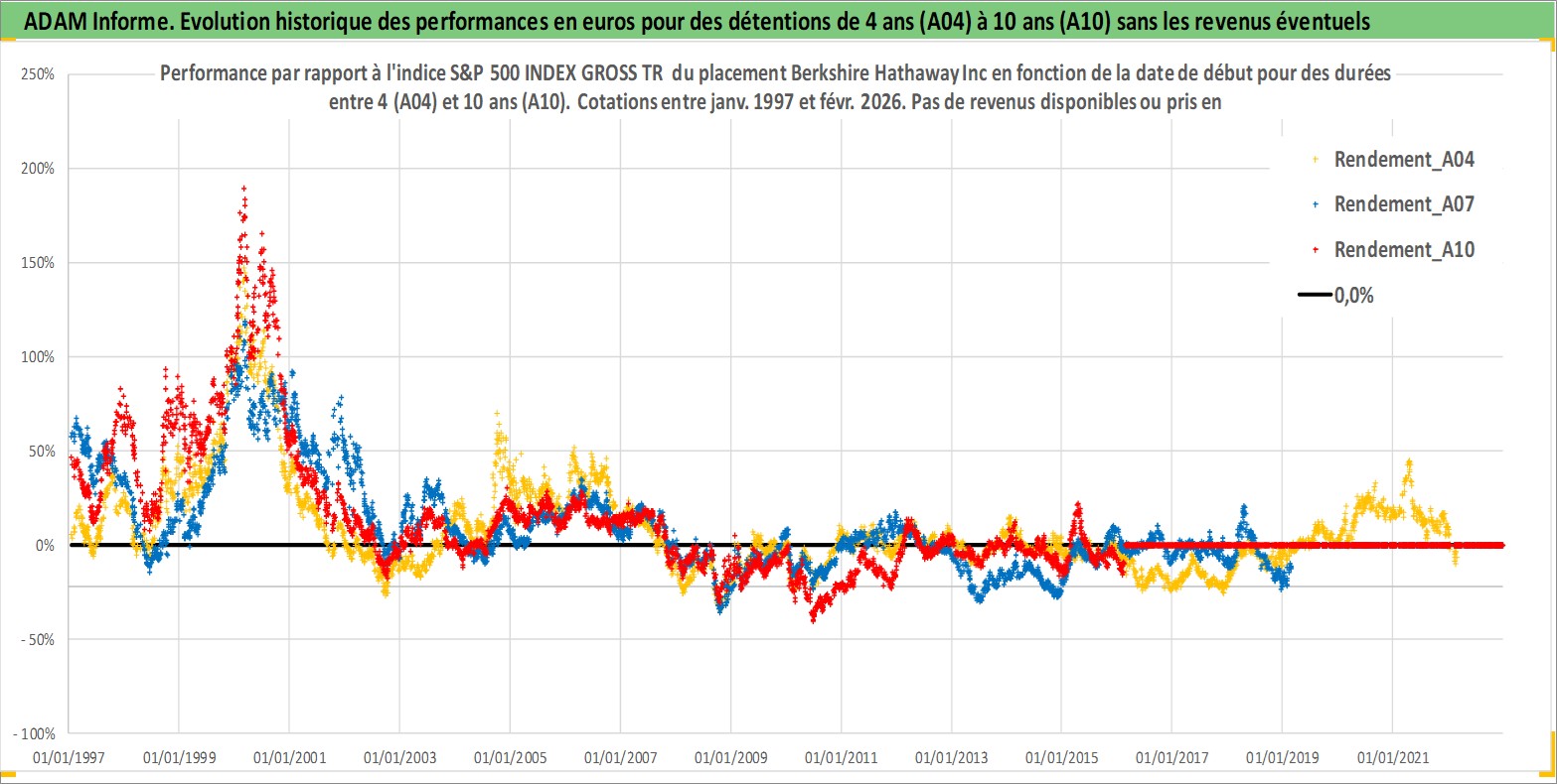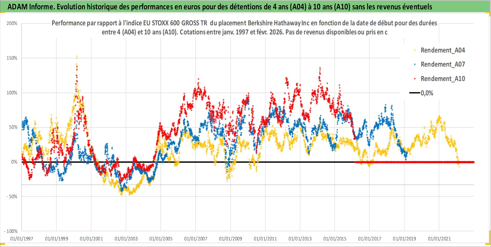 Site dédié aux investisseursPage dédiée sur site financeAnalyse des valorisations hebdomadaires de l'action Berkshire Hathaway Inc. Cet actif est cote en USD. Les valorisations sont en contrevaleur EURO et couvrent les semaines 1997W01 a 2026W09. Les revenus de cet actif financier ne sont pas connus car non existants ou non disponibles sur le site Yahoo Finance. La note globale ESG de cet actif est estimee a 13.0 (apres rebasage entre 0 et 20).
