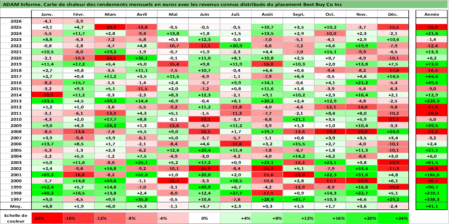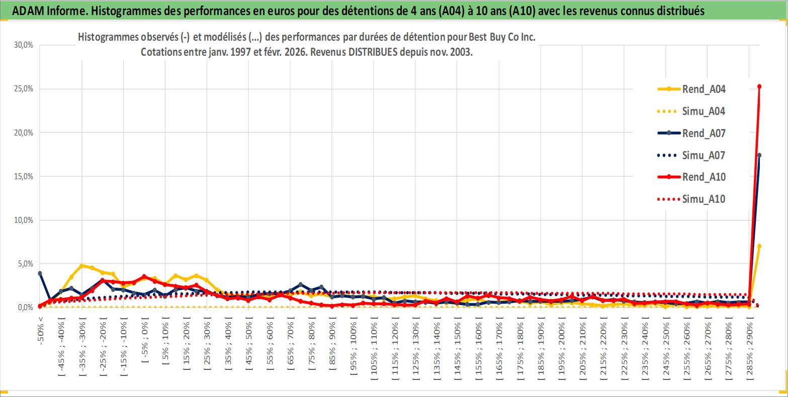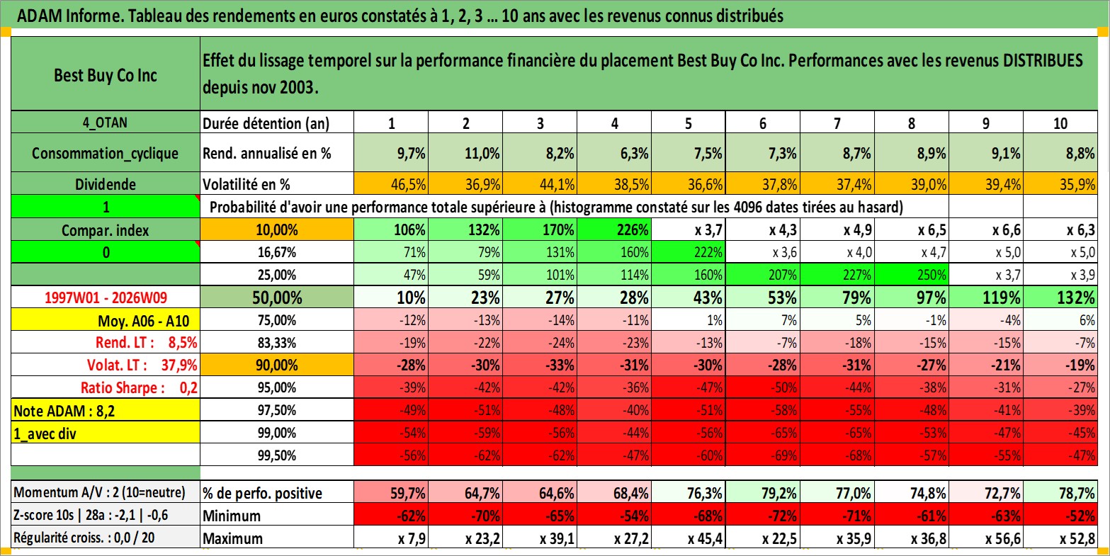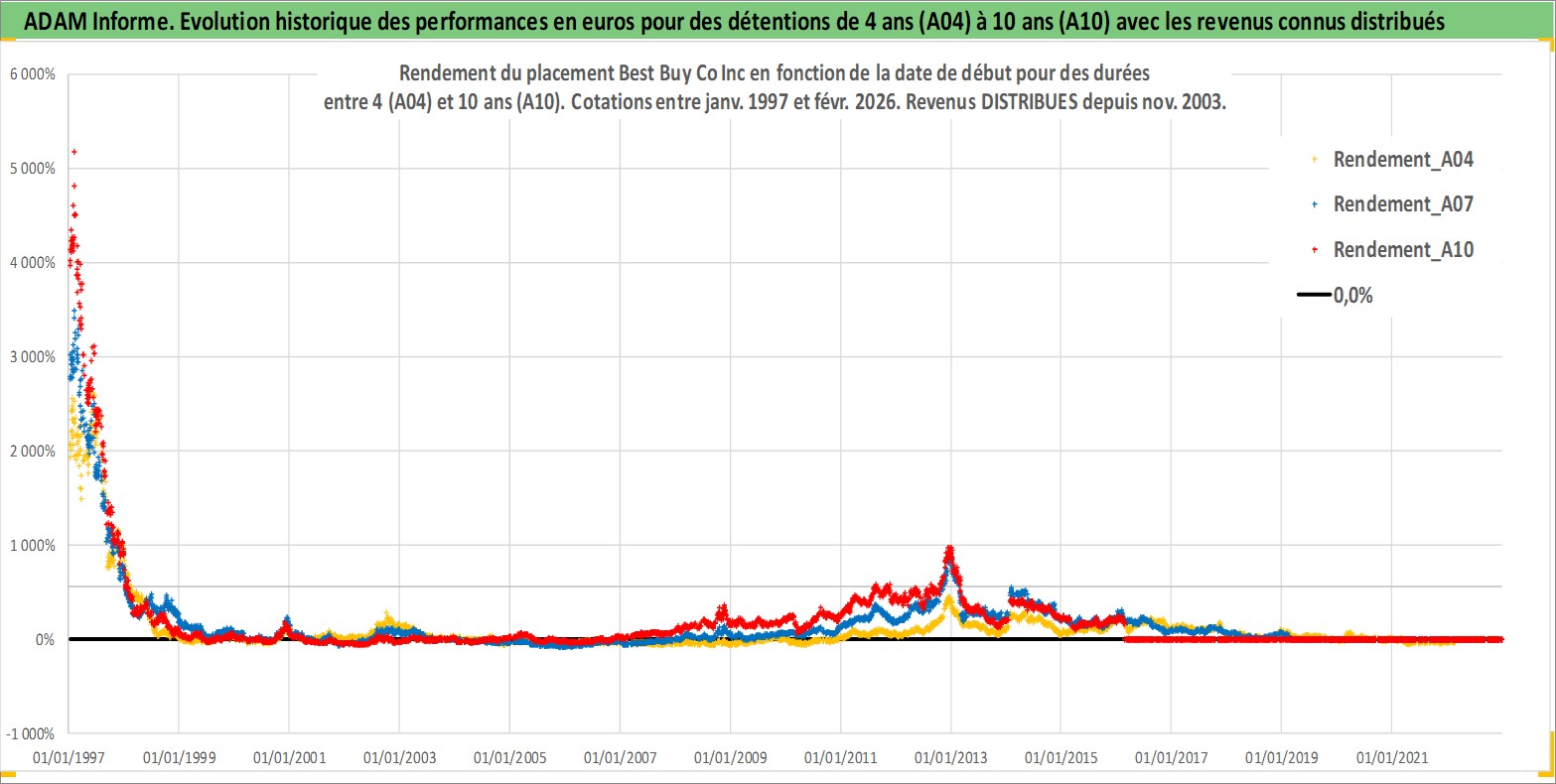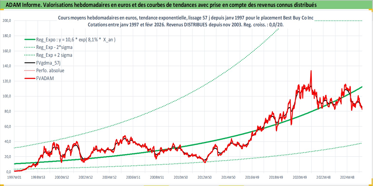 Site dédié aux investisseursPage dédiée sur site financeAnalyse des valorisations hebdomadaires de l'action Best Buy Co Inc. Cet actif est cote en USD. Les valorisations sont en contrevaleur EURO et couvrent les semaines 1997W01 a 2026W09. Les revenus de cet actif financier sont pris en compte depuis la semaine 2003W46. La note globale ESG de cet actif est estimee a 14.0 (apres rebasage entre 0 et 20).