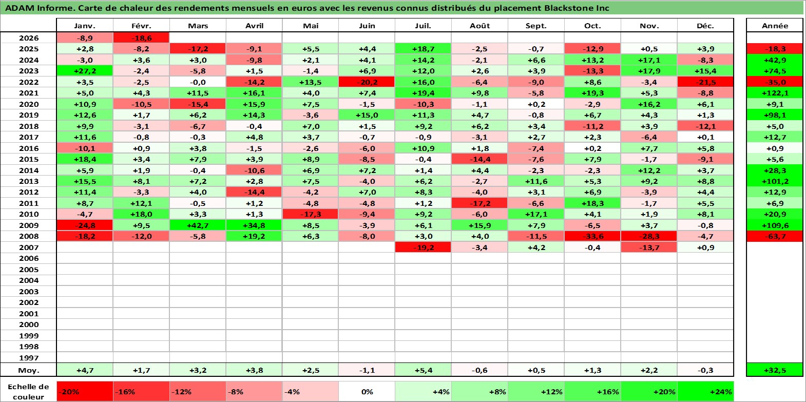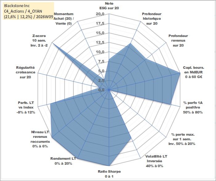 Site dédié aux investisseursPage dédiée sur site financeAnalyse des valorisations hebdomadaires de l'action Blackstone Inc. Cet actif est cote en USD. Les valorisations sont en contrevaleur EURO et couvrent les semaines 2007W25 a 2026W09. Les revenus de cet actif financier sont pris en compte depuis la semaine 2007W48. La note globale ESG de cet actif est estimee a 8.0 (apres rebasage entre 0 et 20).