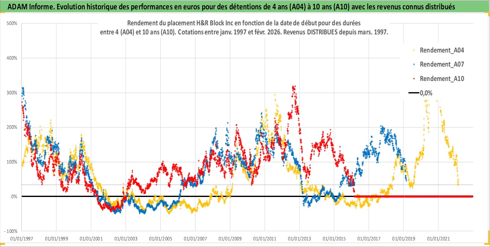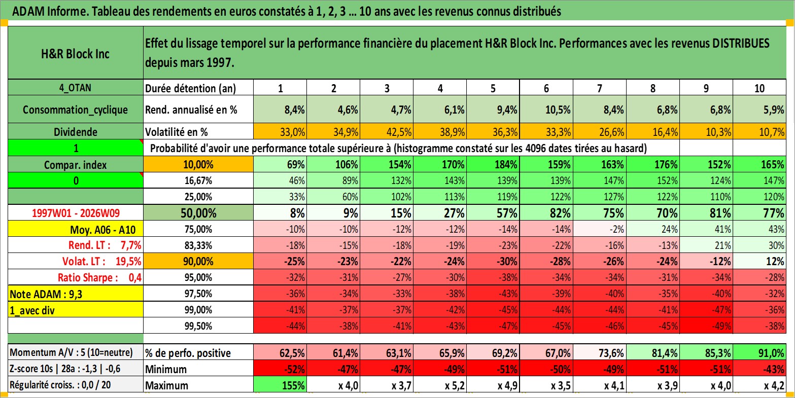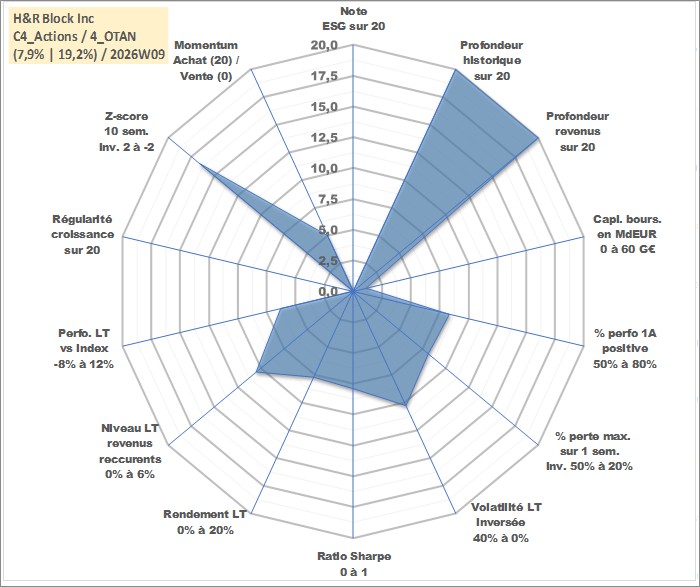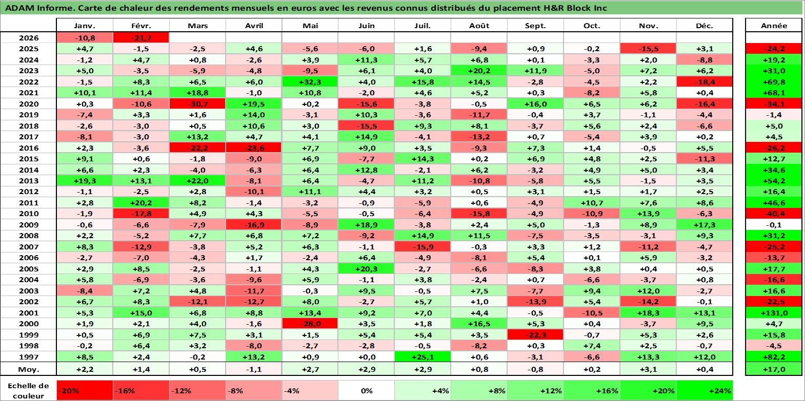 Site dédié aux investisseursPage dédiée sur site financeAnalyse des valorisations hebdomadaires de l'action H&R Block Inc. Cet actif est cote en USD. Les valorisations sont en contrevaleur EURO et couvrent les semaines 1997W01 a 2026W09. Les revenus de cet actif financier sont pris en compte depuis la semaine 1997W10. La note ESG de cet actif n'est pas connue.