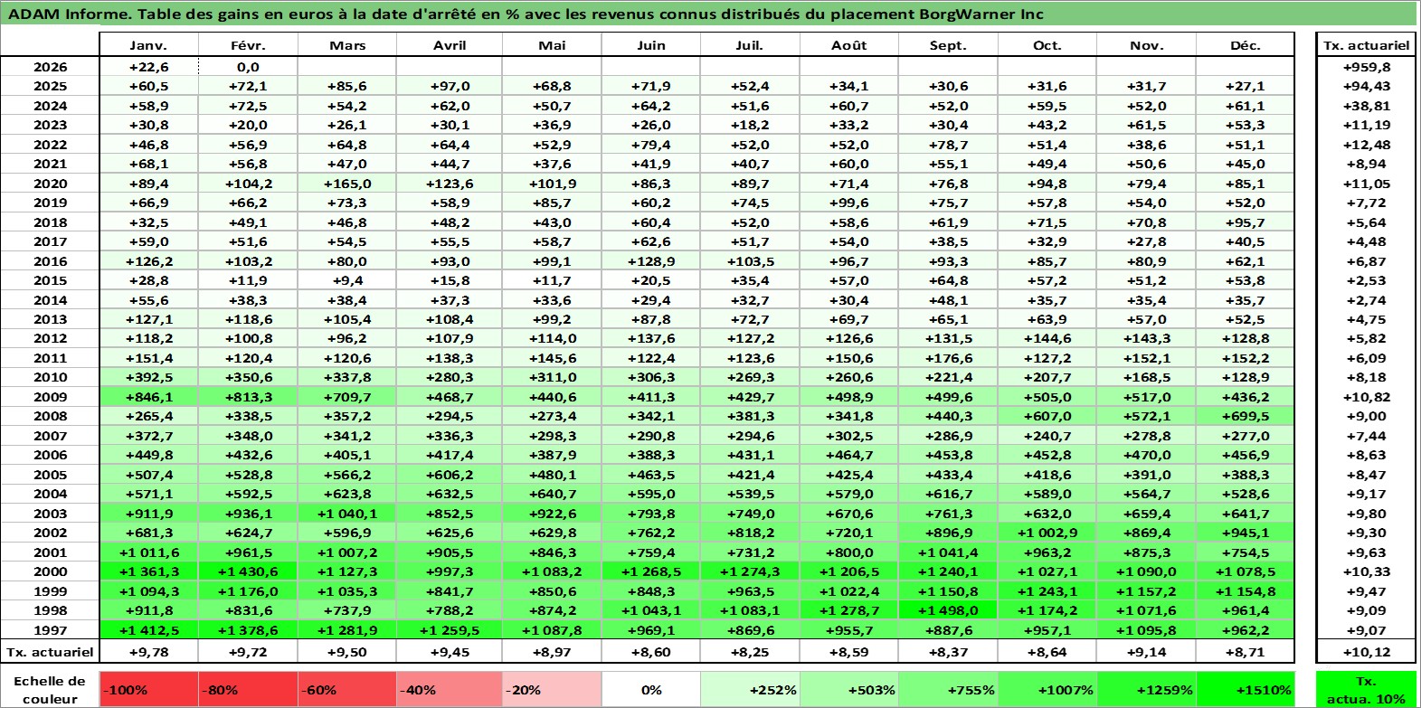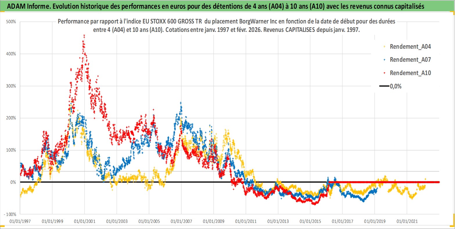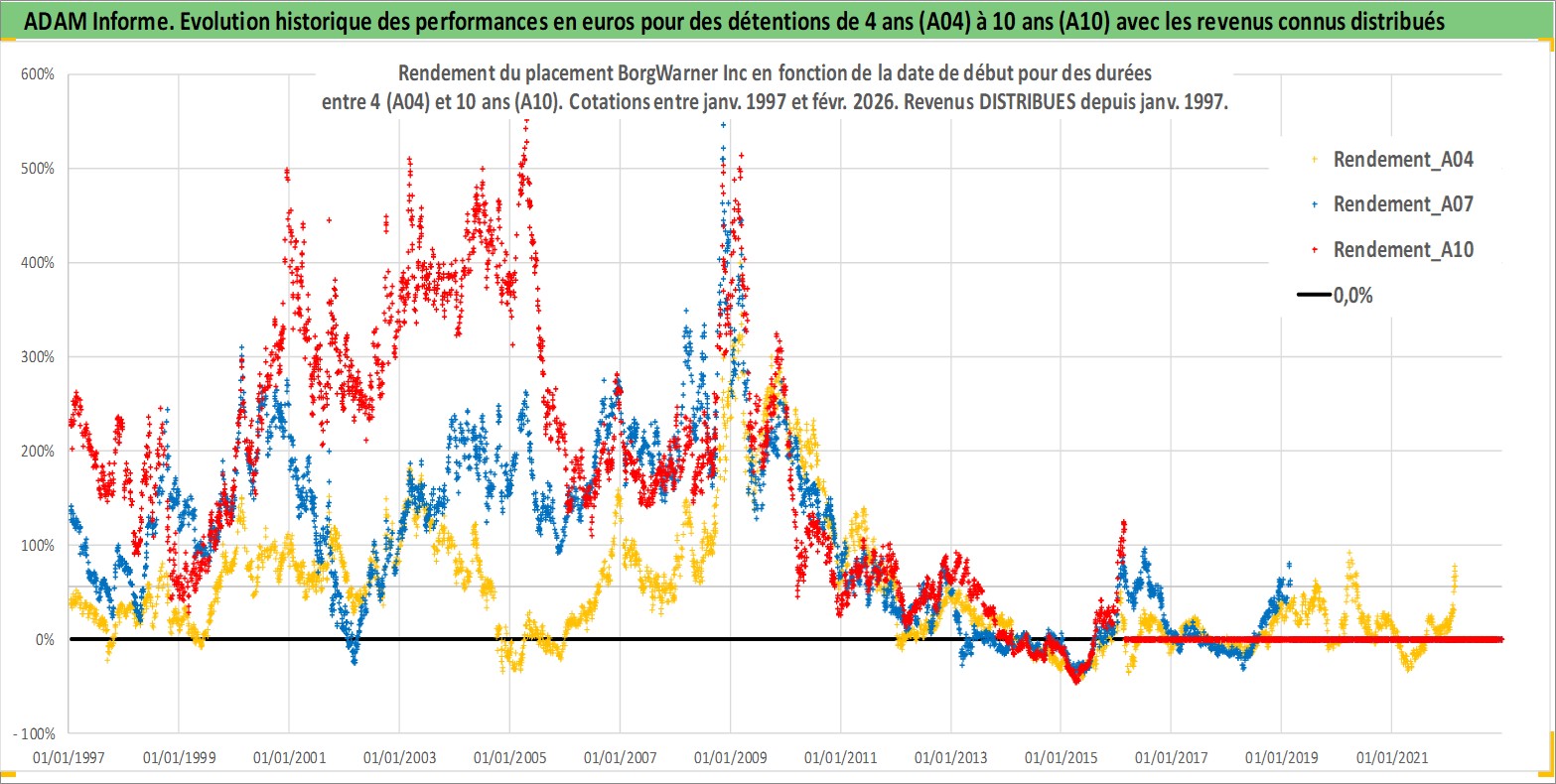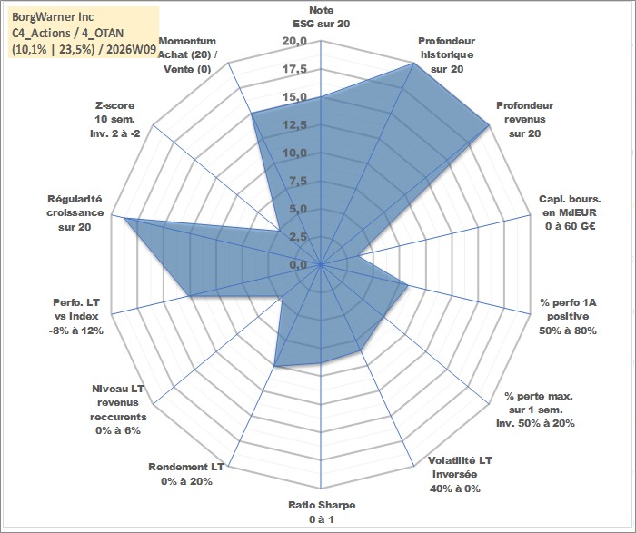 Site dédié aux investisseursPage dédiée sur site financeAnalyse des valorisations hebdomadaires de l'action BorgWarner Inc. Cet actif est cote en USD. Les valorisations sont en contrevaleur EURO et couvrent les semaines 1997W01 a 2026W09. Les revenus de cet actif financier sont pris en compte depuis la semaine 1997W05. La note globale ESG de cet actif est estimee a 15.0 (apres rebasage entre 0 et 20).