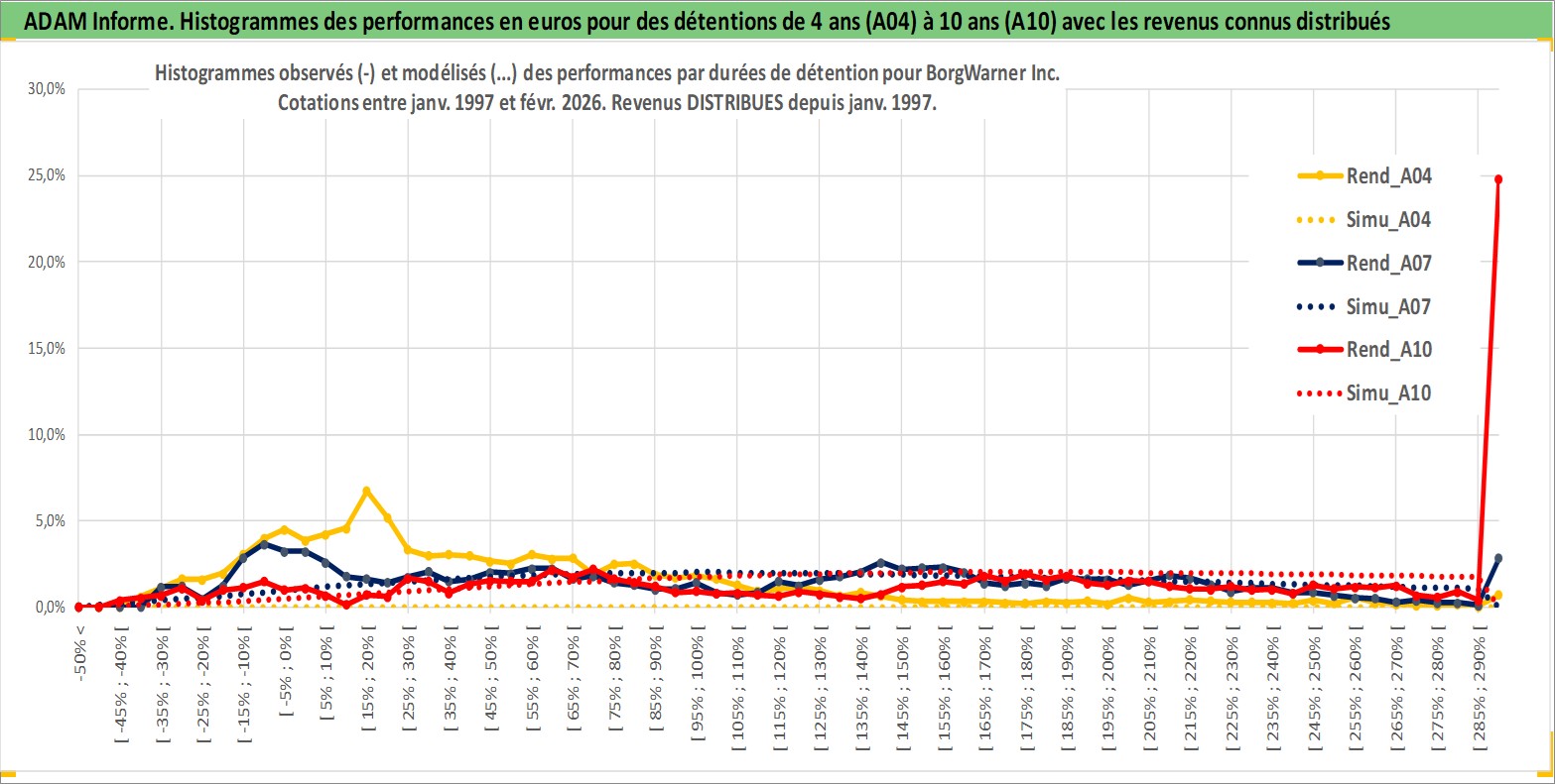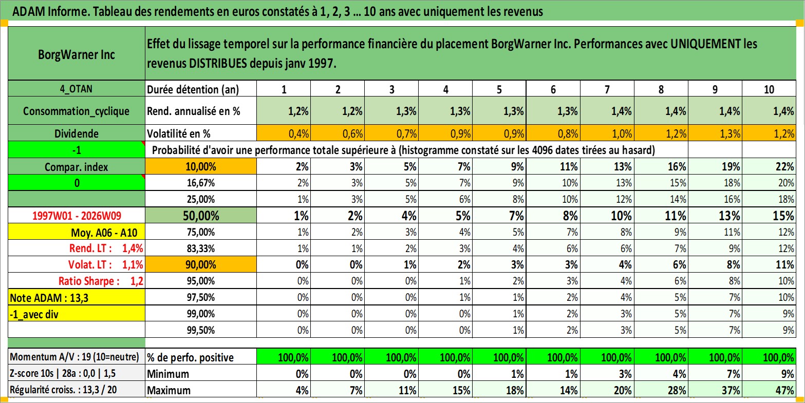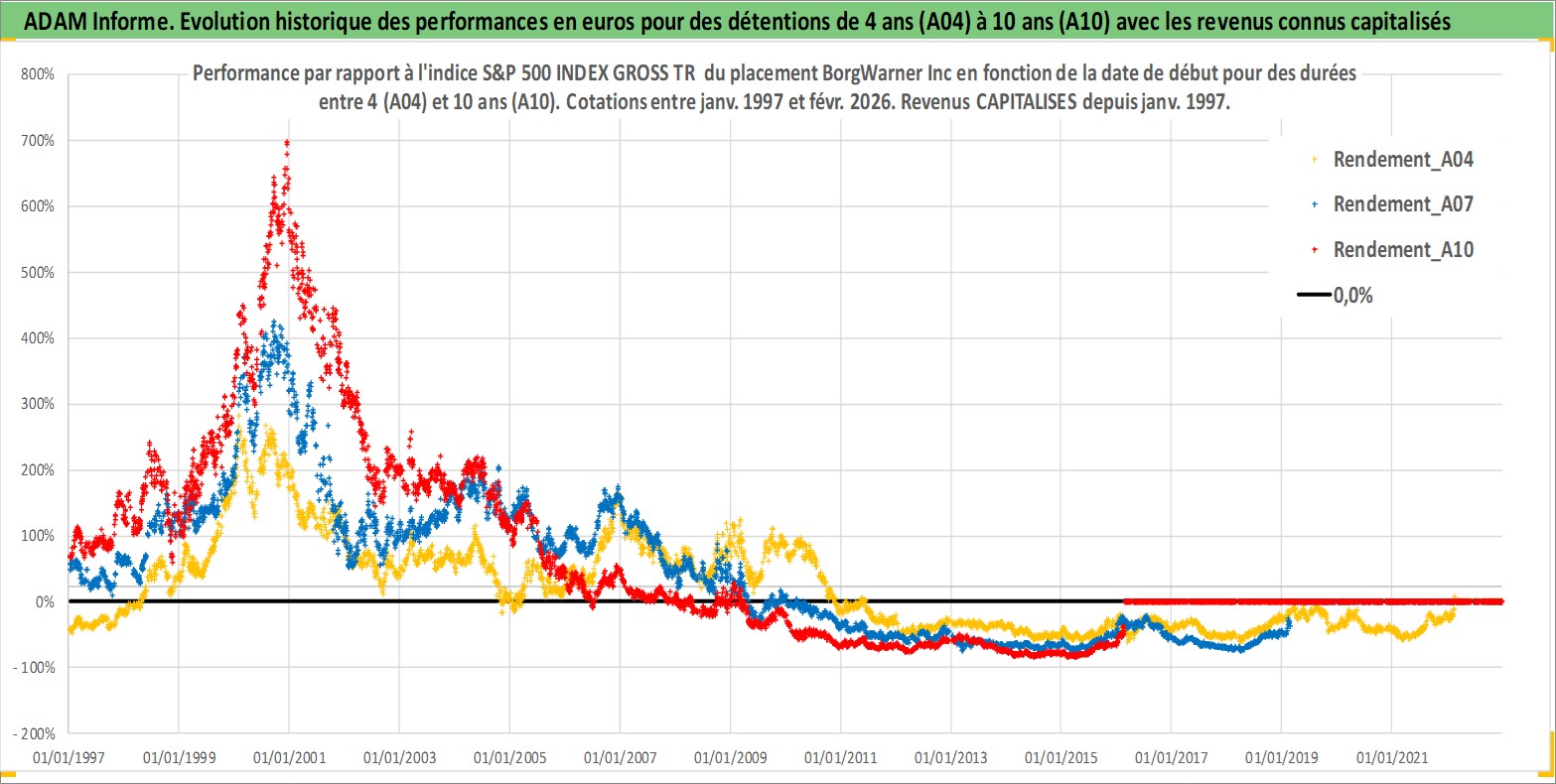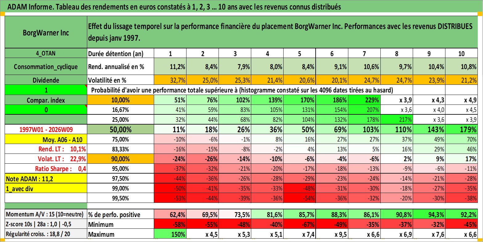 Site dédié aux investisseursPage dédiée sur site financeAnalyse des valorisations hebdomadaires de l'action BorgWarner Inc. Cet actif est cote en USD. Les valorisations sont en contrevaleur EURO et couvrent les semaines 1997W01 a 2026W09. Les revenus de cet actif financier sont pris en compte depuis la semaine 1997W05. La note globale ESG de cet actif est estimee a 15.0 (apres rebasage entre 0 et 20).