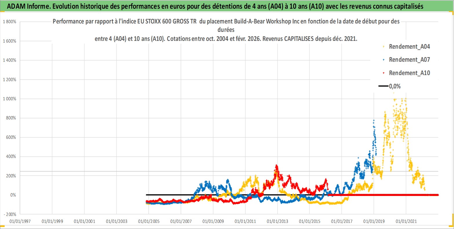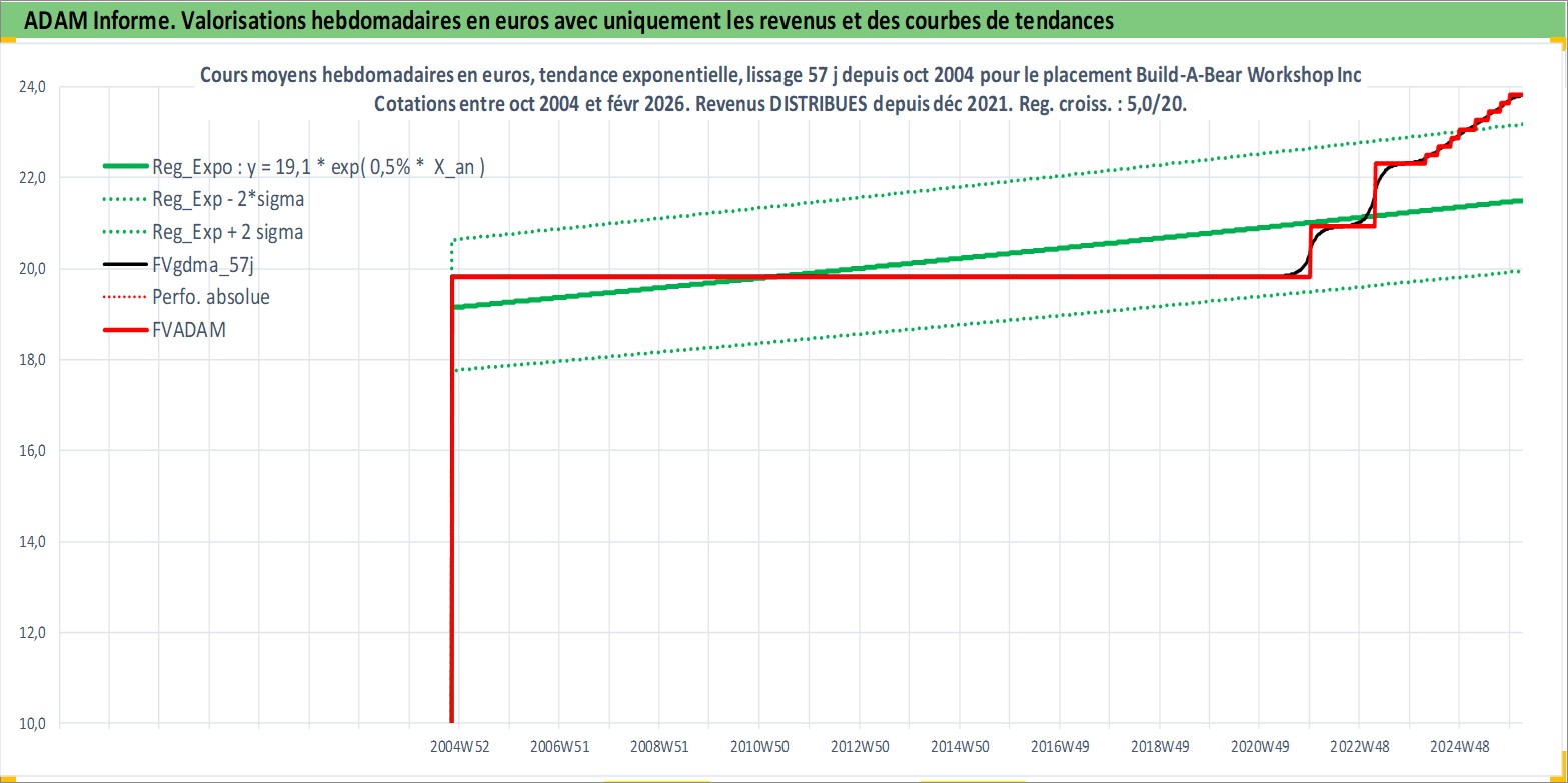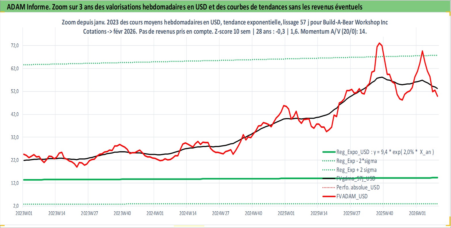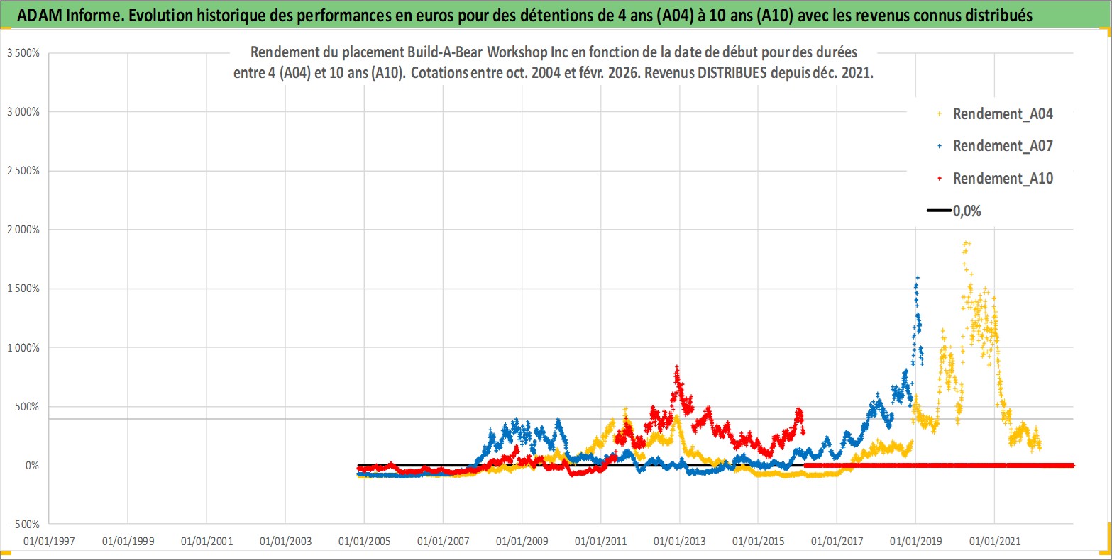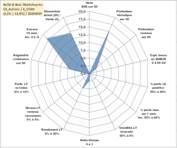 Site dédié aux investisseursPage dédiée sur site financeAnalyse des valorisations hebdomadaires de l'action Build-A-Bear Workshop Inc. Cet actif est cote en USD. Les valorisations sont en contrevaleur EURO et couvrent les semaines 2004W44 a 2026W09. Les revenus de cet actif financier sont pris en compte depuis la semaine 2021W49. La note ESG de cet actif n'est pas connue.