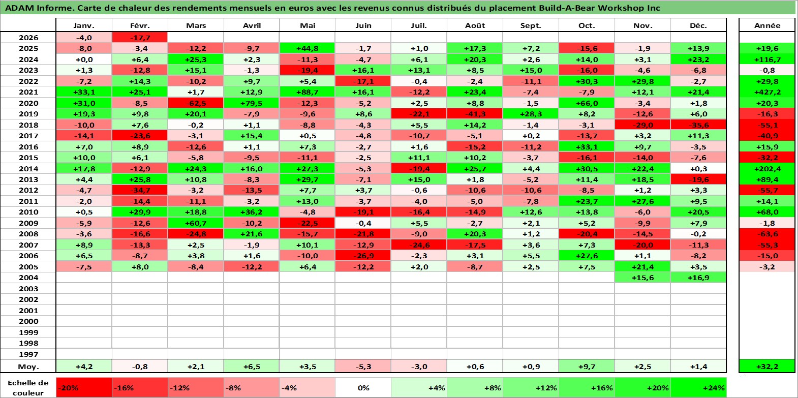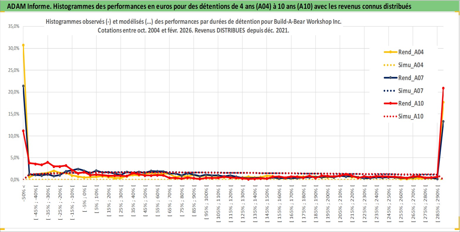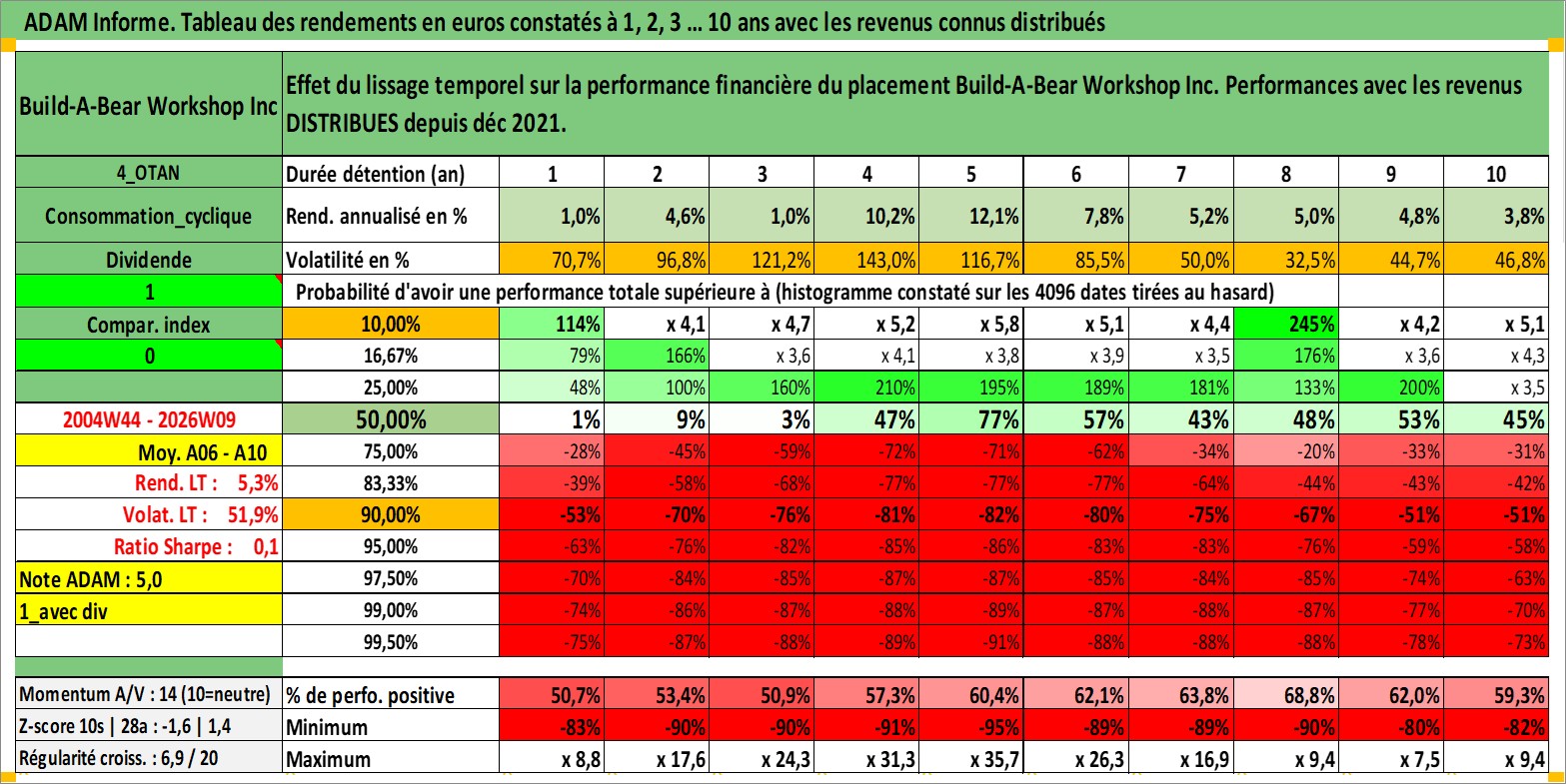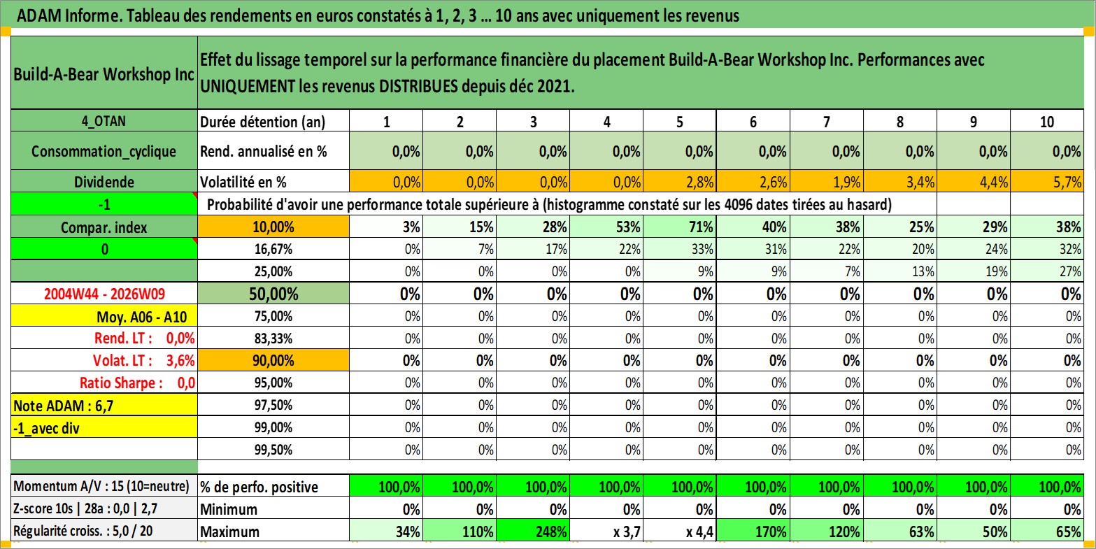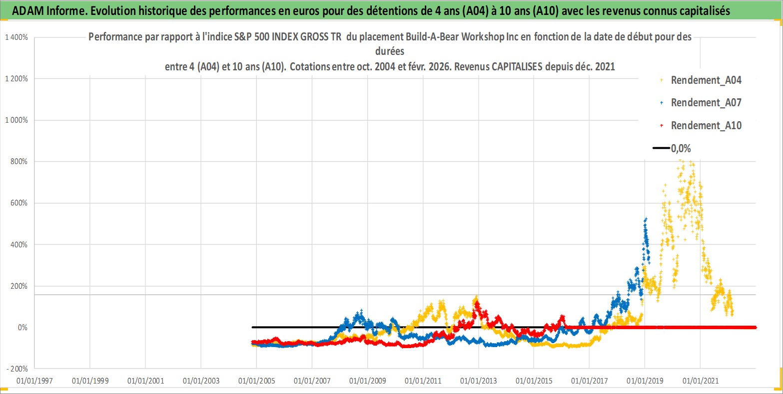 Site dédié aux investisseursPage dédiée sur site financeAnalyse des valorisations hebdomadaires de l'action Build-A-Bear Workshop Inc. Cet actif est cote en USD. Les valorisations sont en contrevaleur EURO et couvrent les semaines 2004W44 a 2026W09. Les revenus de cet actif financier sont pris en compte depuis la semaine 2021W49. La note ESG de cet actif n'est pas connue.