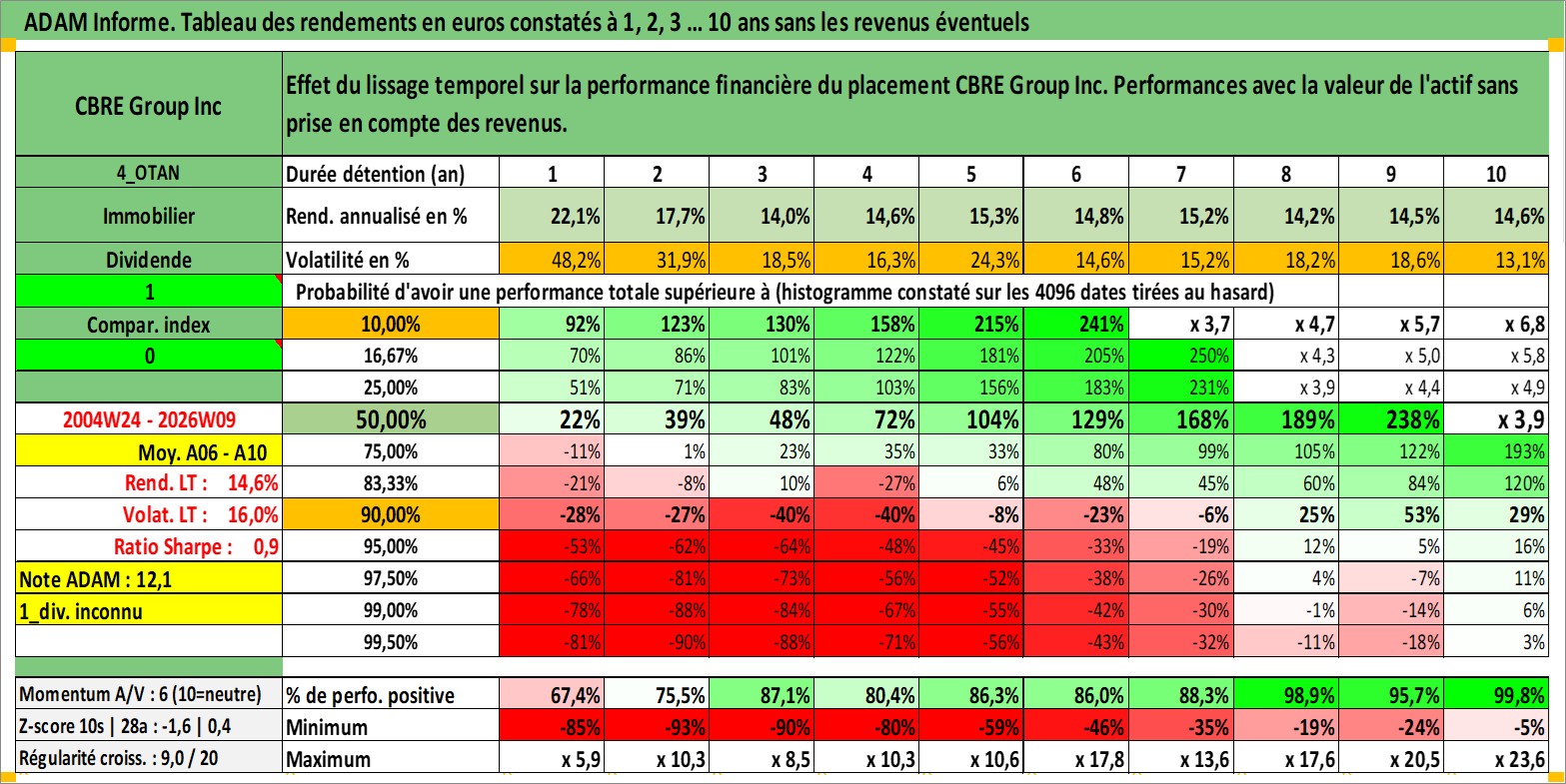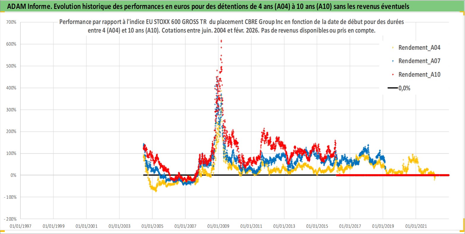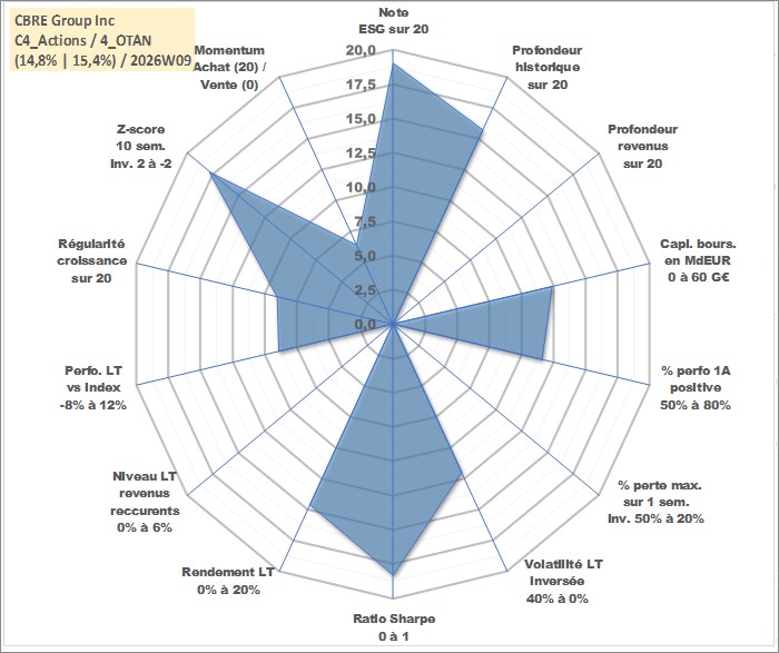 Site dédié aux investisseursPage dédiée sur site financeAnalyse des valorisations hebdomadaires de l'action CBRE Group Inc. Cet actif est cote en USD. Les valorisations sont en contrevaleur EURO et couvrent les semaines 2004W24 a 2026W09. Les revenus de cet actif financier ne sont pas connus car non existants ou non disponibles sur le site Yahoo Finance. La note globale ESG de cet actif est estimee a 19.0 (apres rebasage entre 0 et 20).