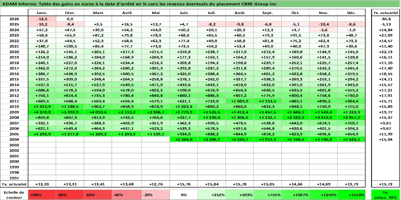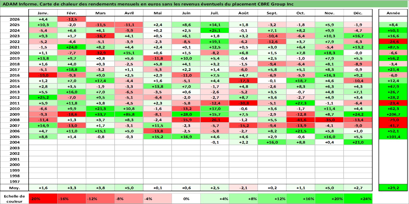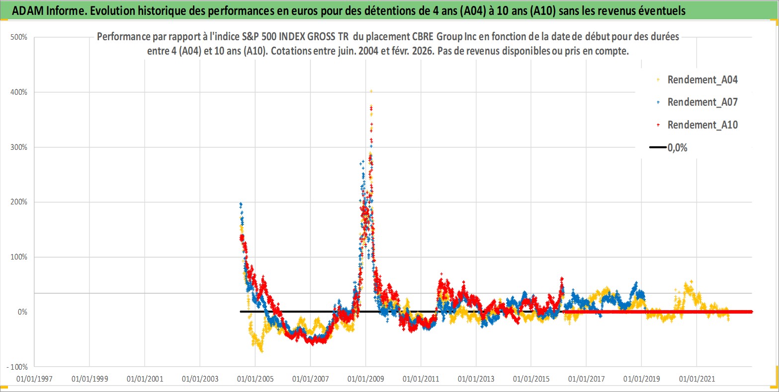 Site dédié aux investisseursPage dédiée sur site financeAnalyse des valorisations hebdomadaires de l'action CBRE Group Inc. Cet actif est cote en USD. Les valorisations sont en contrevaleur EURO et couvrent les semaines 2004W24 a 2026W09. Les revenus de cet actif financier ne sont pas connus car non existants ou non disponibles sur le site Yahoo Finance. La note globale ESG de cet actif est estimee a 19.0 (apres rebasage entre 0 et 20).