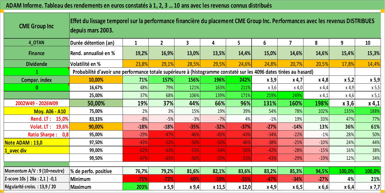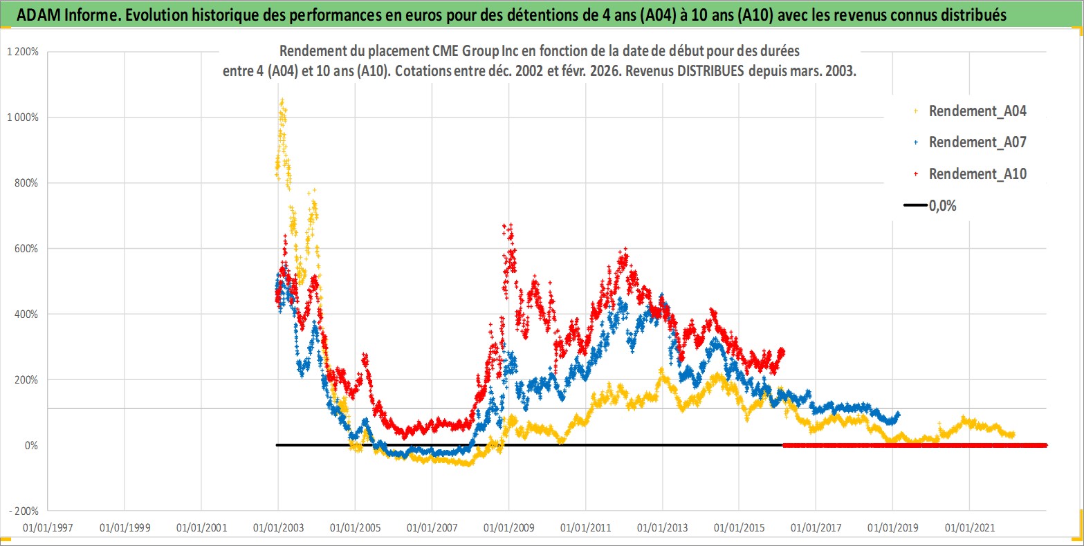 Site dédié aux investisseursPage dédiée sur site financeAnalyse des valorisations hebdomadaires de l'action CME Group Inc. Cet actif est cote en USD. Les valorisations sont en contrevaleur EURO et couvrent les semaines 2002W49 a 2026W09. Les revenus de cet actif financier sont pris en compte depuis la semaine 2003W10. La note globale ESG de cet actif est estimee a 13.0 (apres rebasage entre 0 et 20).