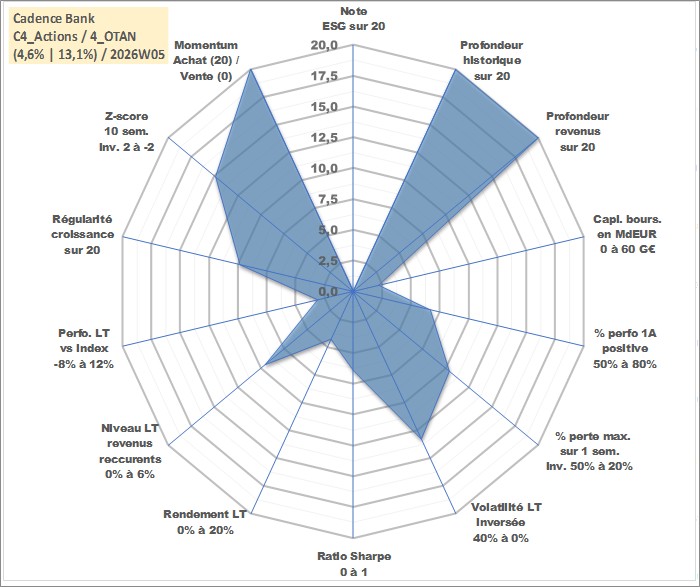 Site dédié aux investisseursPage dédiée sur site financeAnalyse des valorisations hebdomadaires de l'action Cadence Bank. Cet actif est cote en USD. Les valorisations sont en contrevaleur EURO et couvrent les semaines 1997W01 a 2026W05. Les revenus de cet actif financier sont pris en compte depuis la semaine 1997W11. La note ESG de cet actif n'est pas connue.