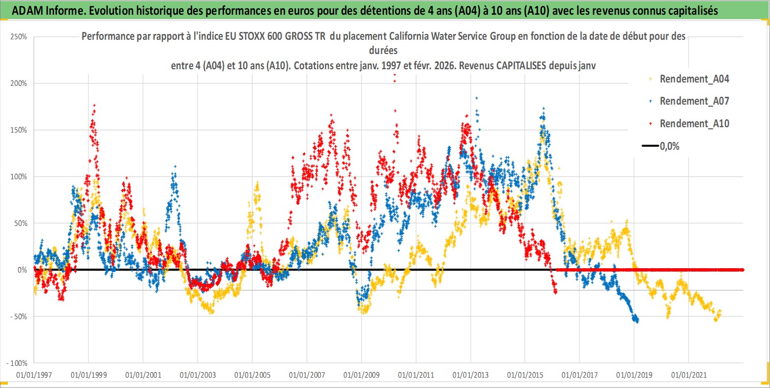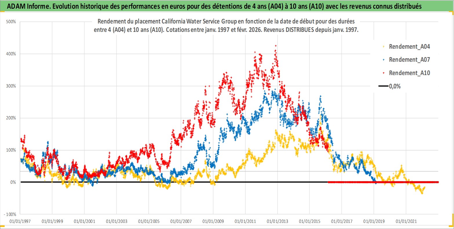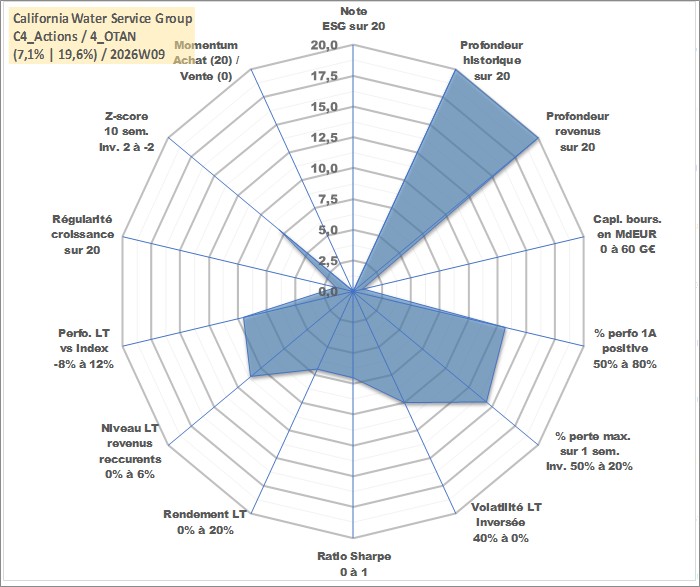 Site dédié aux investisseursPage dédiée sur site financeAnalyse des valorisations hebdomadaires de l'action California Water Service Group. Cet actif est cote en USD. Les valorisations sont en contrevaleur EURO et couvrent les semaines 1997W01 a 2026W09. Les revenus de cet actif financier sont pris en compte depuis la semaine 1997W05. La note ESG de cet actif n'est pas connue.