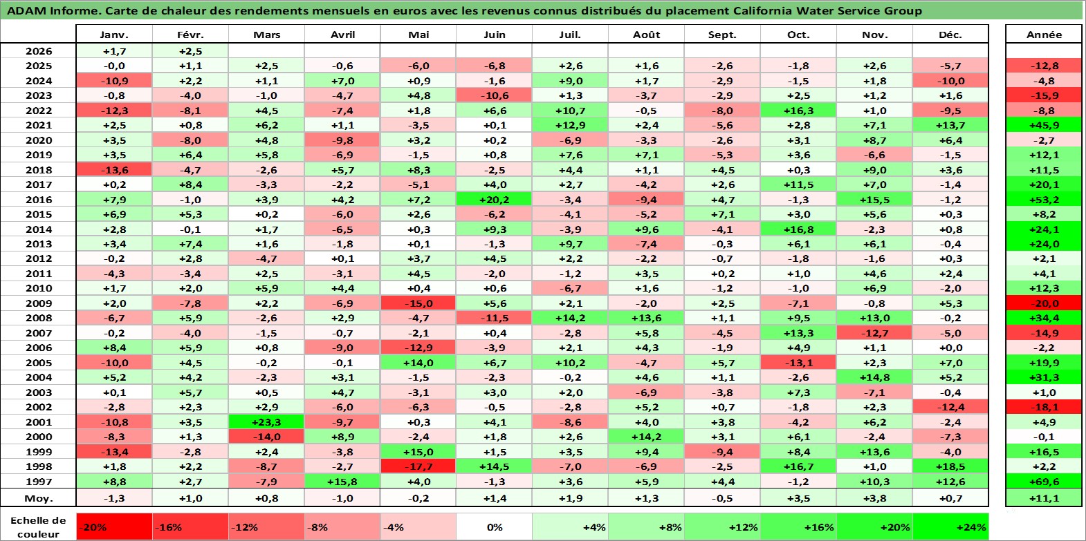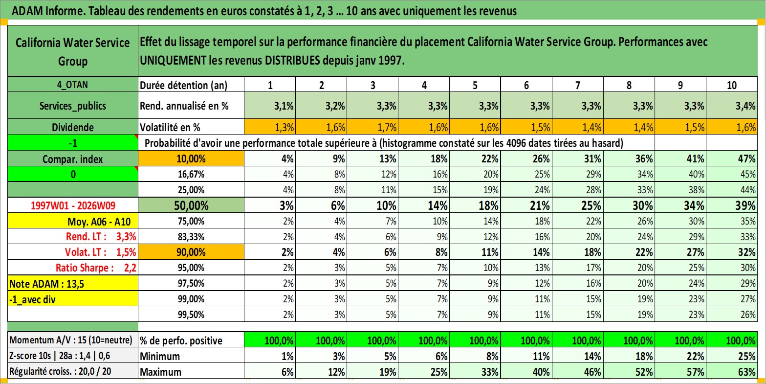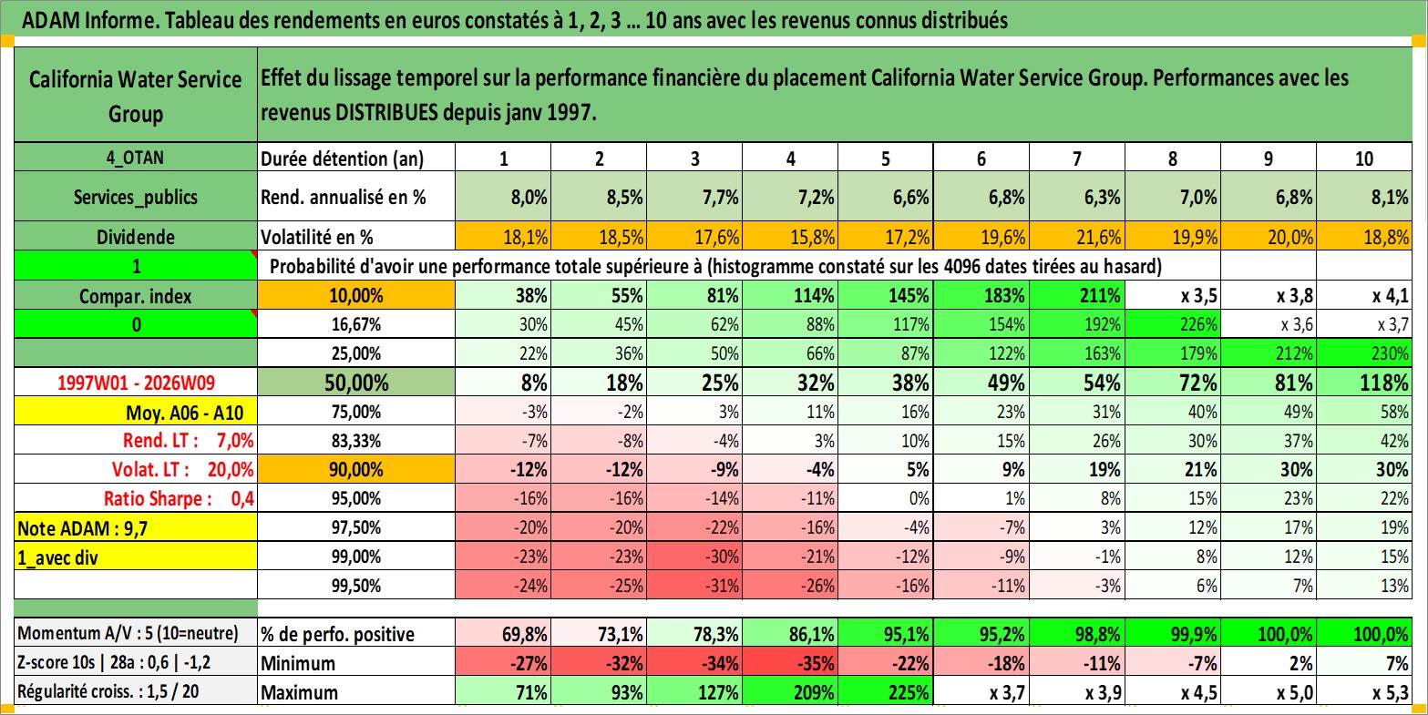 Site dédié aux investisseursPage dédiée sur site financeAnalyse des valorisations hebdomadaires de l'action California Water Service Group. Cet actif est cote en USD. Les valorisations sont en contrevaleur EURO et couvrent les semaines 1997W01 a 2026W09. Les revenus de cet actif financier sont pris en compte depuis la semaine 1997W05. La note ESG de cet actif n'est pas connue.