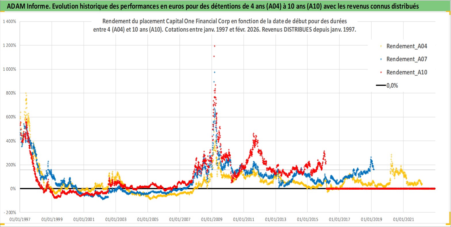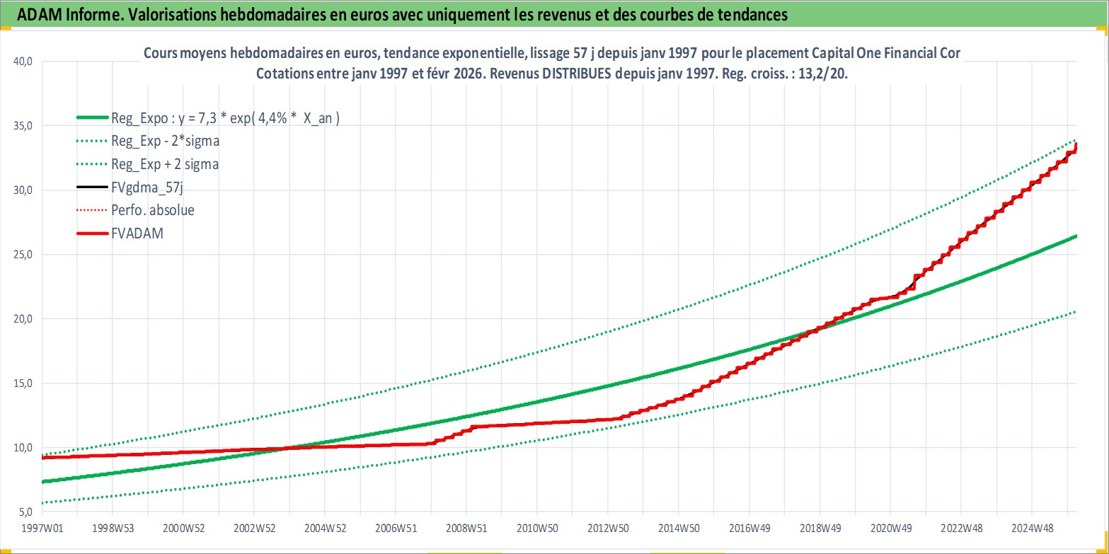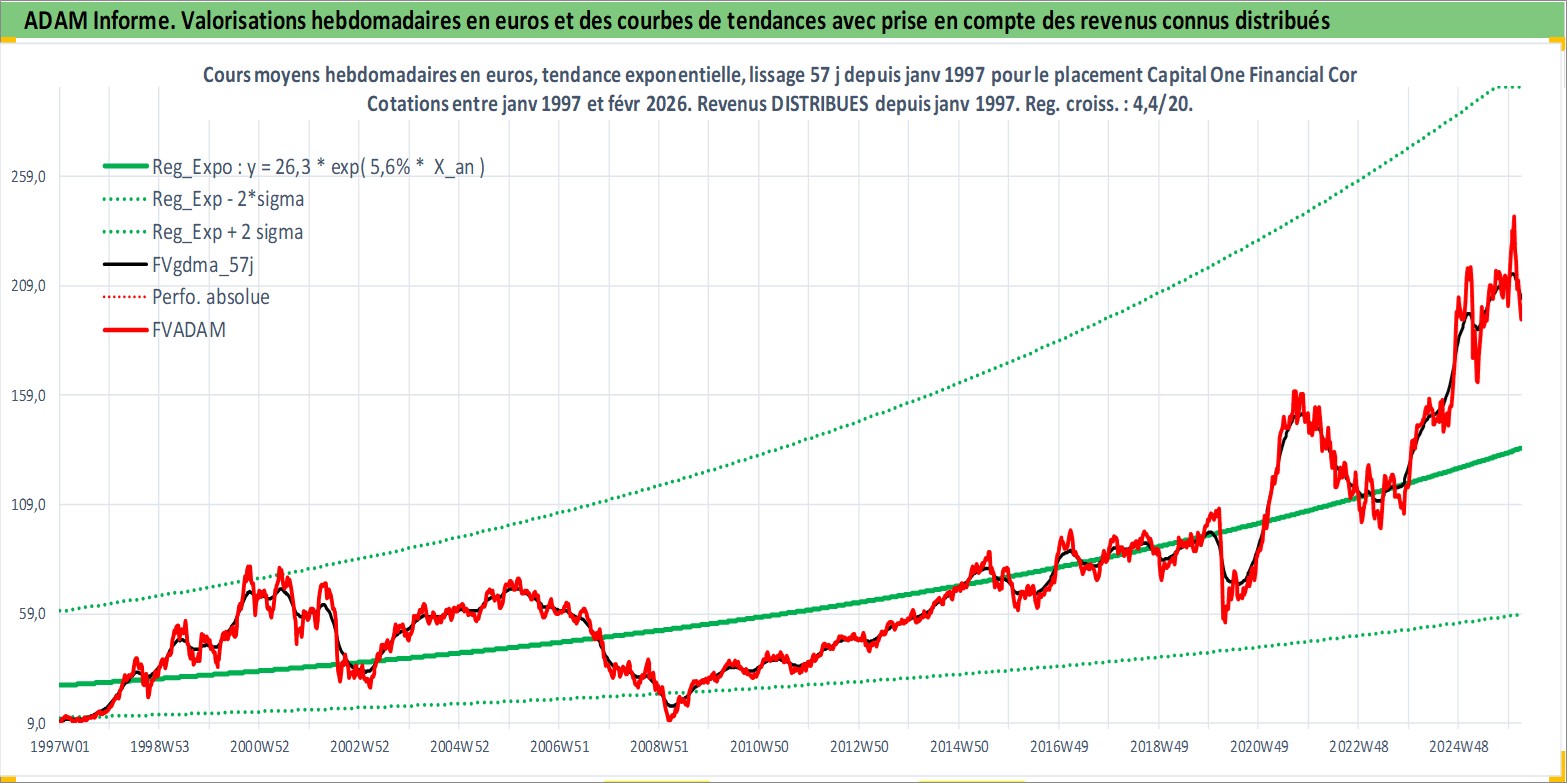 Site dédié aux investisseursPage dédiée sur site financeAnalyse des valorisations hebdomadaires de l'action Capital One Financial Corp. Cet actif est cote en USD. Les valorisations sont en contrevaleur EURO et couvrent les semaines 1997W01 a 2026W09. Les revenus de cet actif financier sont pris en compte depuis la semaine 1997W05. La note globale ESG de cet actif est estimee a 9.0 (apres rebasage entre 0 et 20).