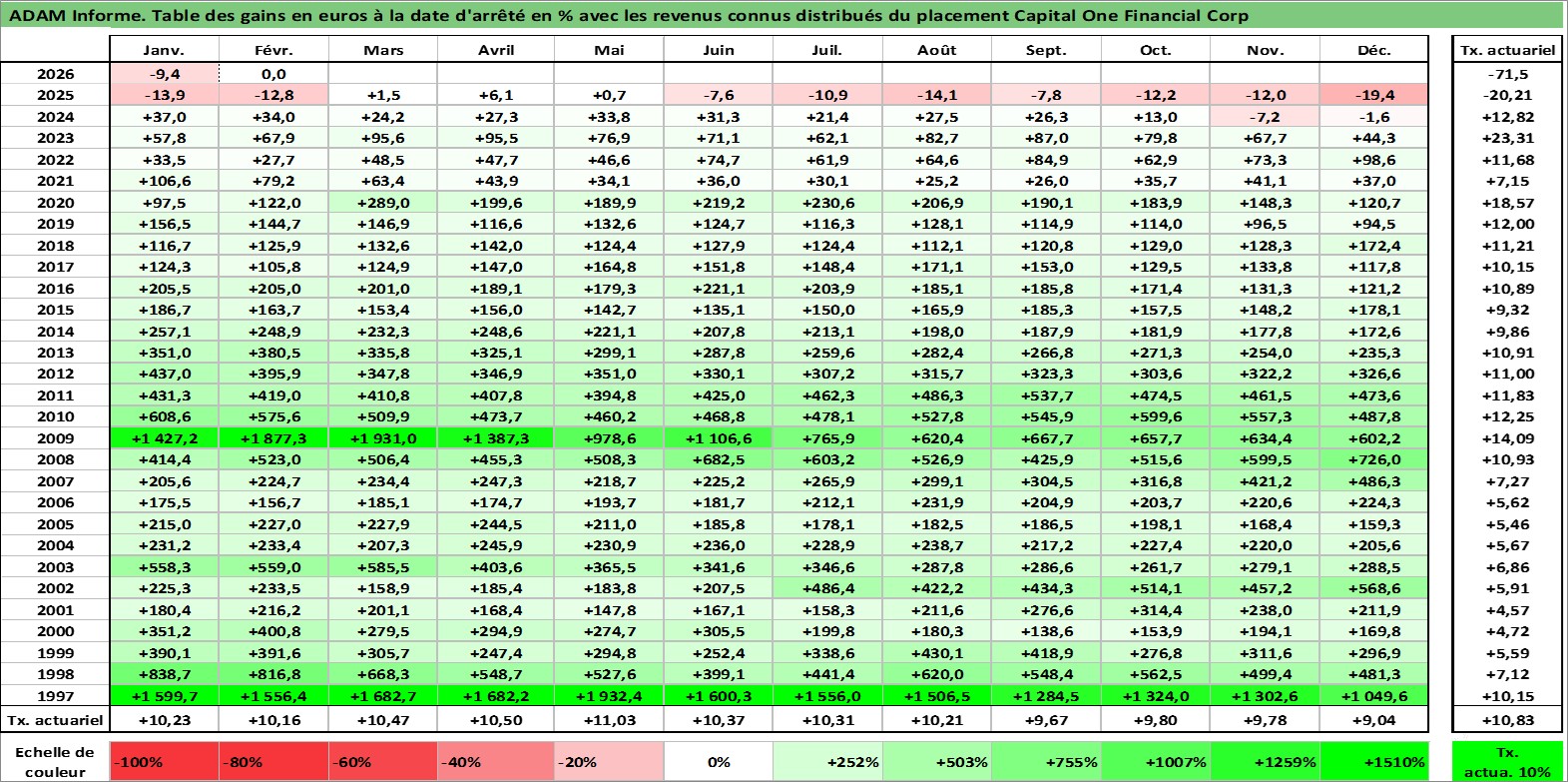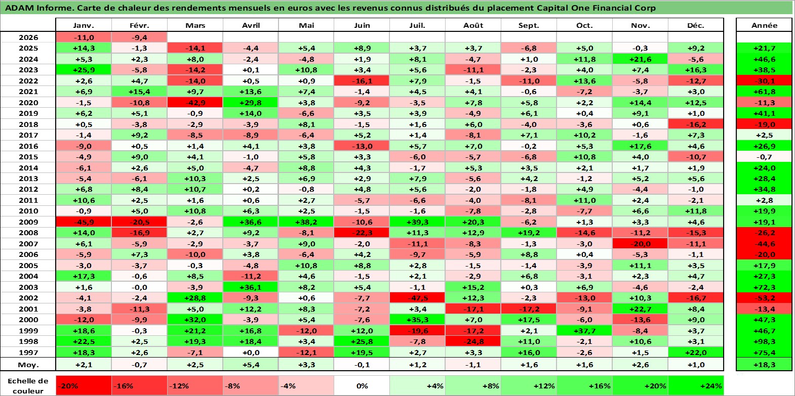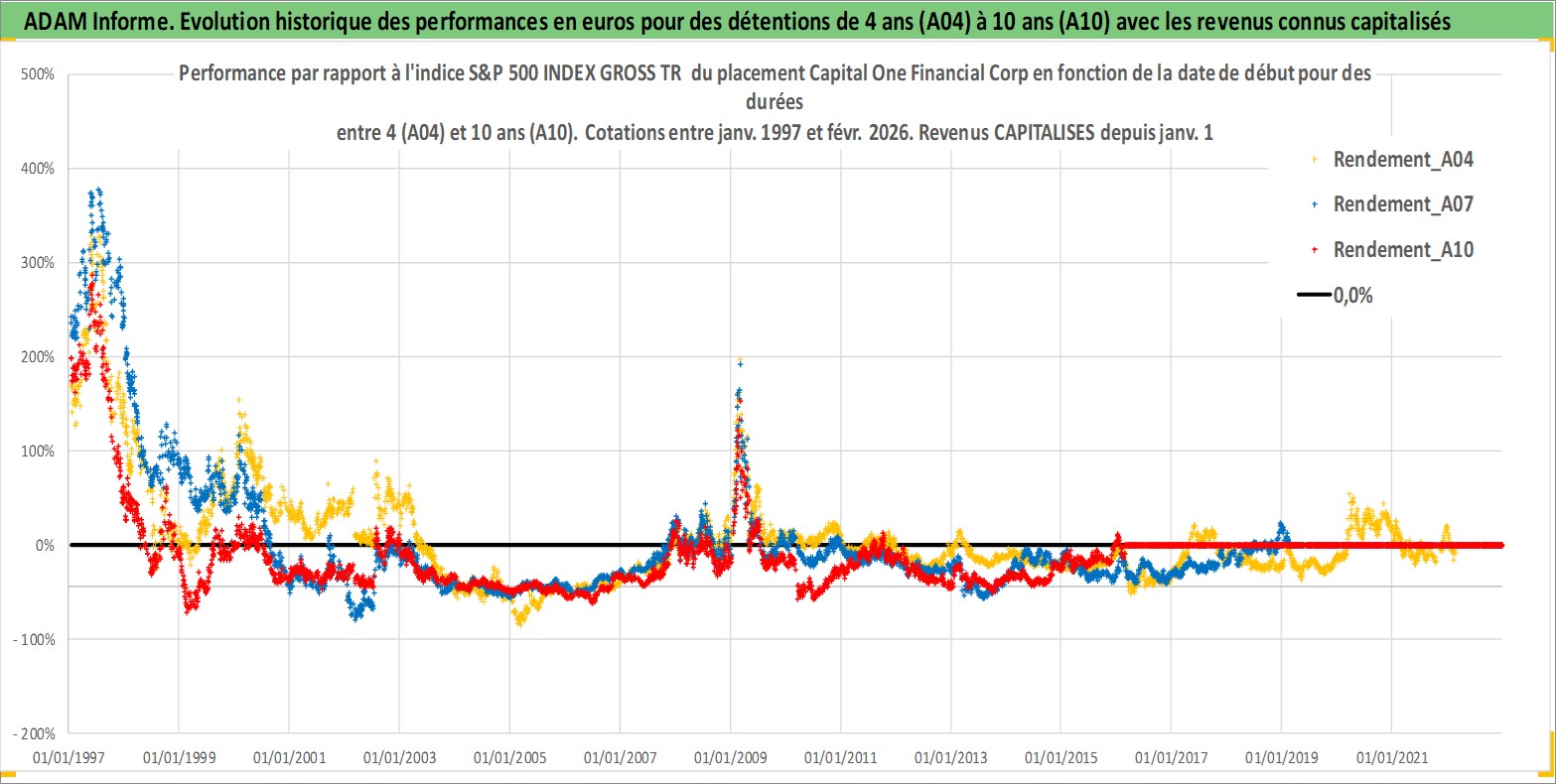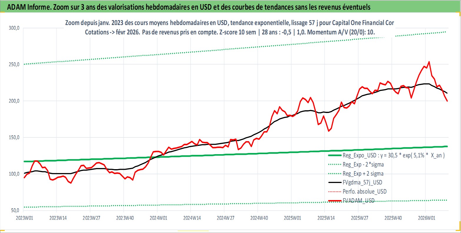 Site dédié aux investisseursPage dédiée sur site financeAnalyse des valorisations hebdomadaires de l'action Capital One Financial Corp. Cet actif est cote en USD. Les valorisations sont en contrevaleur EURO et couvrent les semaines 1997W01 a 2026W09. Les revenus de cet actif financier sont pris en compte depuis la semaine 1997W05. La note globale ESG de cet actif est estimee a 9.0 (apres rebasage entre 0 et 20).