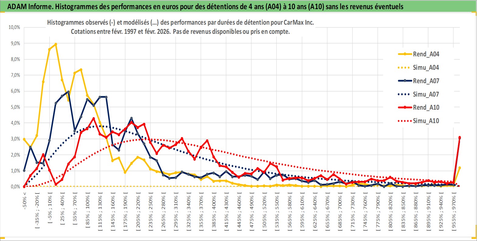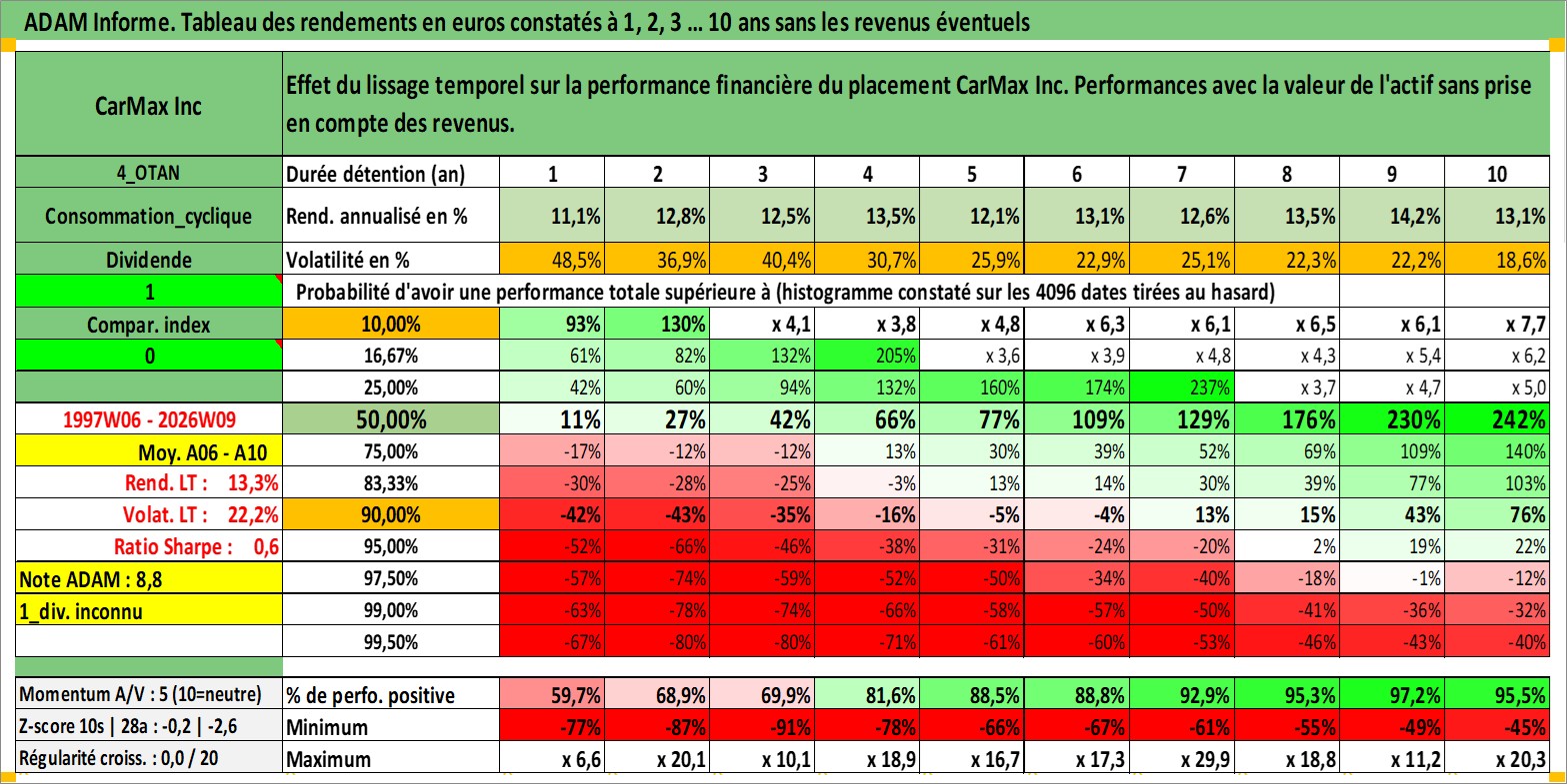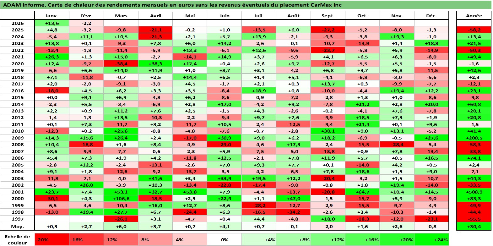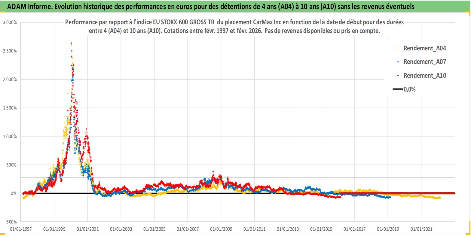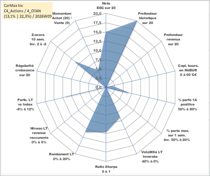 Site dédié aux investisseursPage dédiée sur site financeAnalyse des valorisations hebdomadaires de l'action CarMax Inc. Cet actif est cote en USD. Les valorisations sont en contrevaleur EURO et couvrent les semaines 1997W06 a 2026W09. Les revenus de cet actif financier ne sont pas connus car non existants ou non disponibles sur le site Yahoo Finance. La note globale ESG de cet actif est estimee a 15.0 (apres rebasage entre 0 et 20).