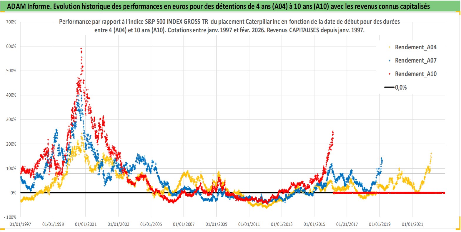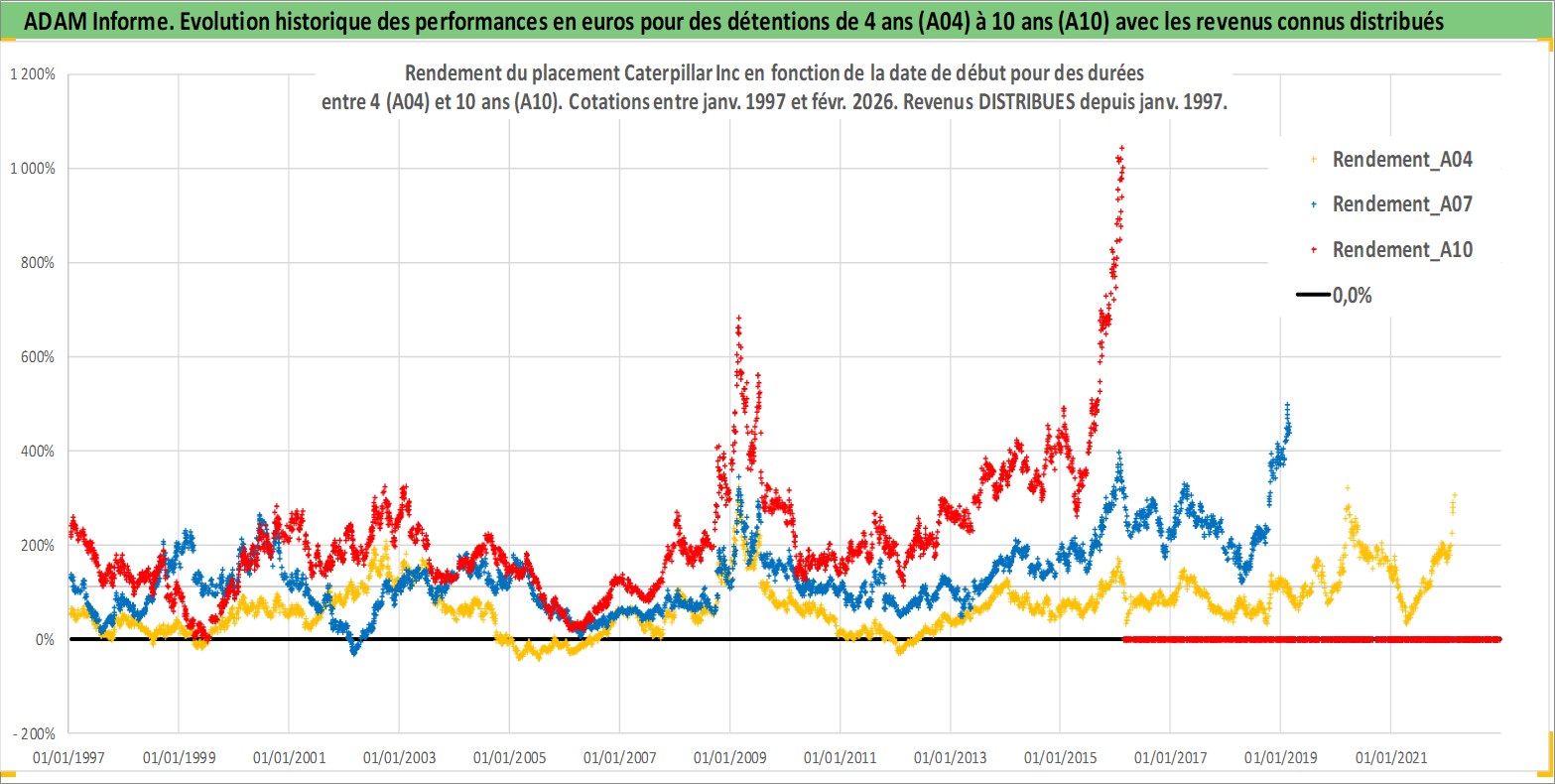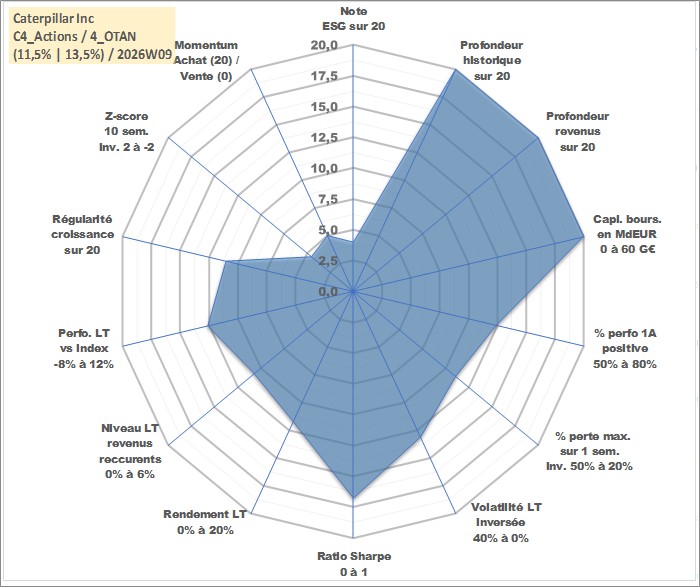 Site dédié aux investisseursPage dédiée sur site financeAnalyse des valorisations hebdomadaires de l'action Caterpillar Inc. Cet actif est cote en USD. Les valorisations sont en contrevaleur EURO et couvrent les semaines 1997W01 a 2026W09. Les revenus de cet actif financier sont pris en compte depuis la semaine 1997W03. La note globale ESG de cet actif est estimee a 4.0 (apres rebasage entre 0 et 20).