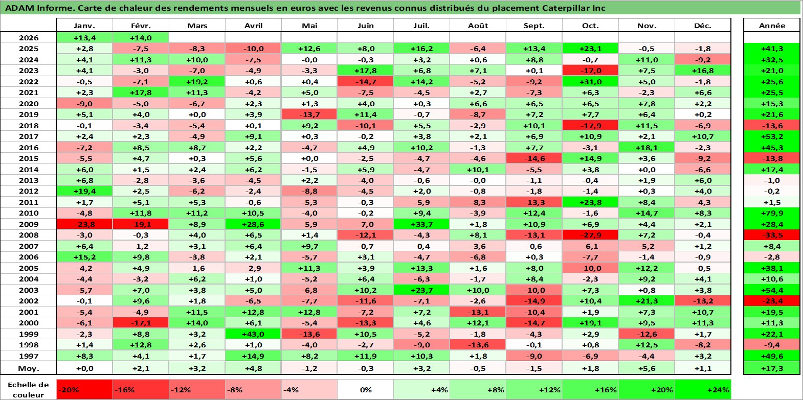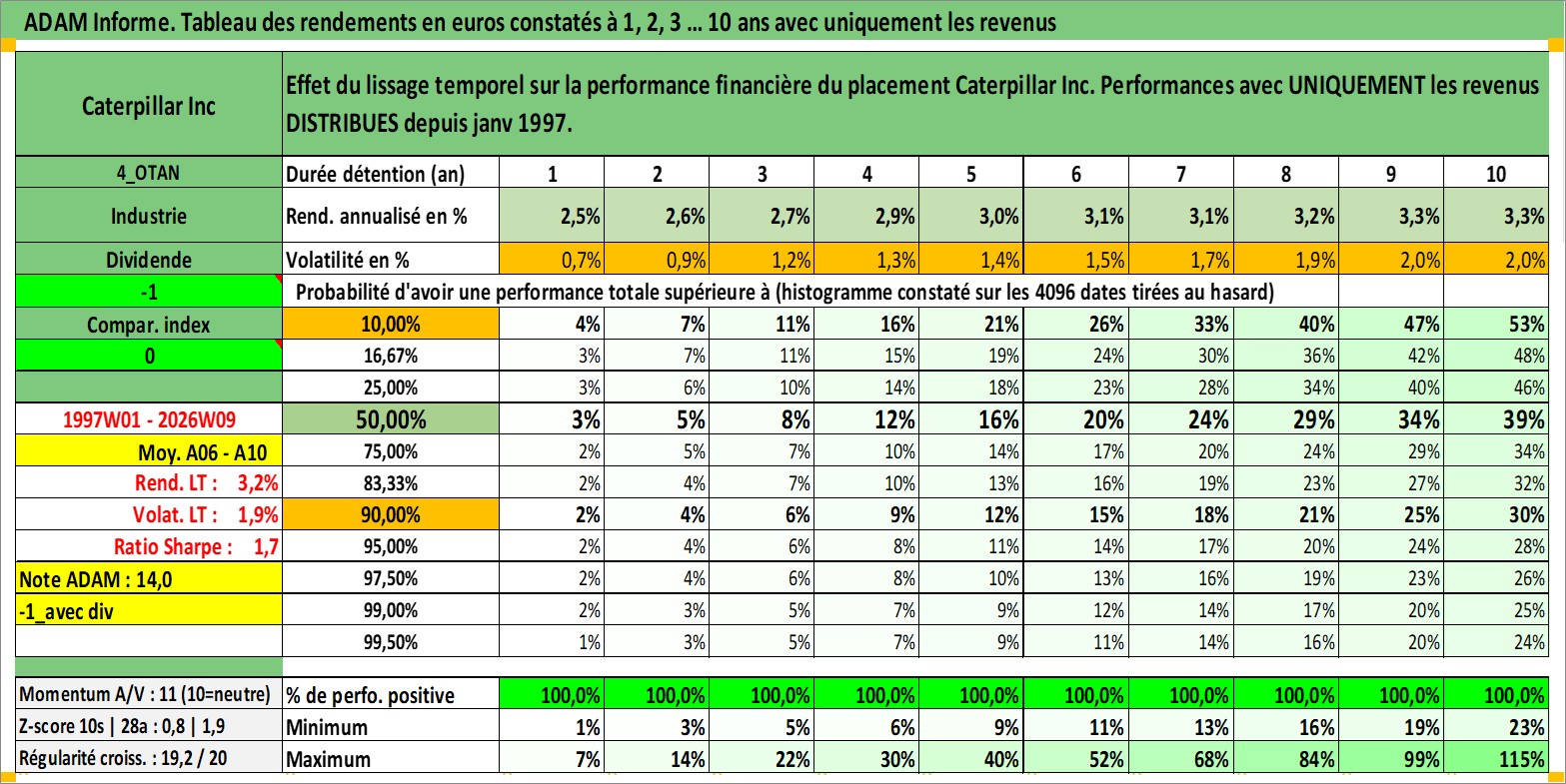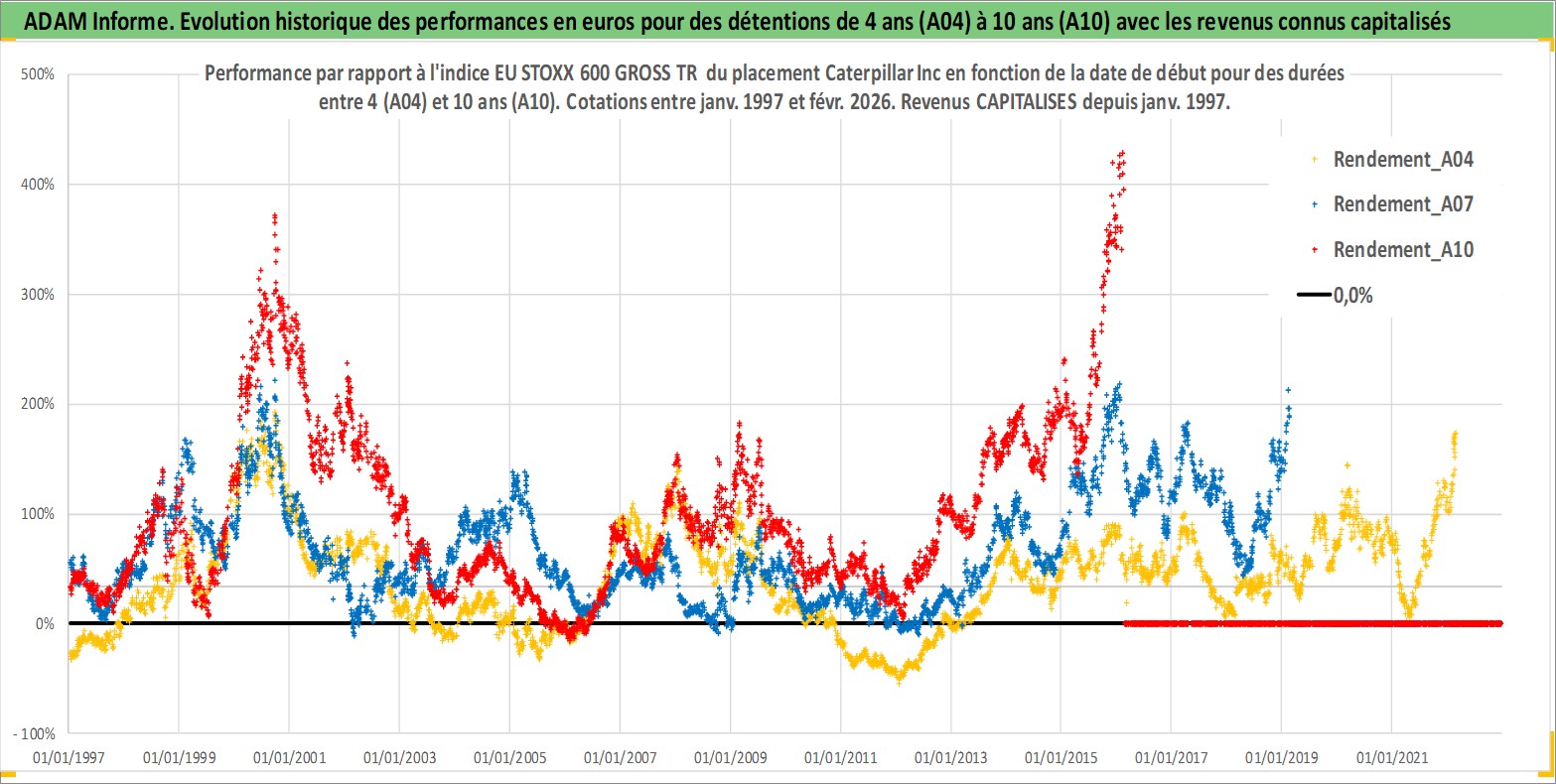 Site dédié aux investisseursPage dédiée sur site financeAnalyse des valorisations hebdomadaires de l'action Caterpillar Inc. Cet actif est cote en USD. Les valorisations sont en contrevaleur EURO et couvrent les semaines 1997W01 a 2026W09. Les revenus de cet actif financier sont pris en compte depuis la semaine 1997W03. La note globale ESG de cet actif est estimee a 4.0 (apres rebasage entre 0 et 20).