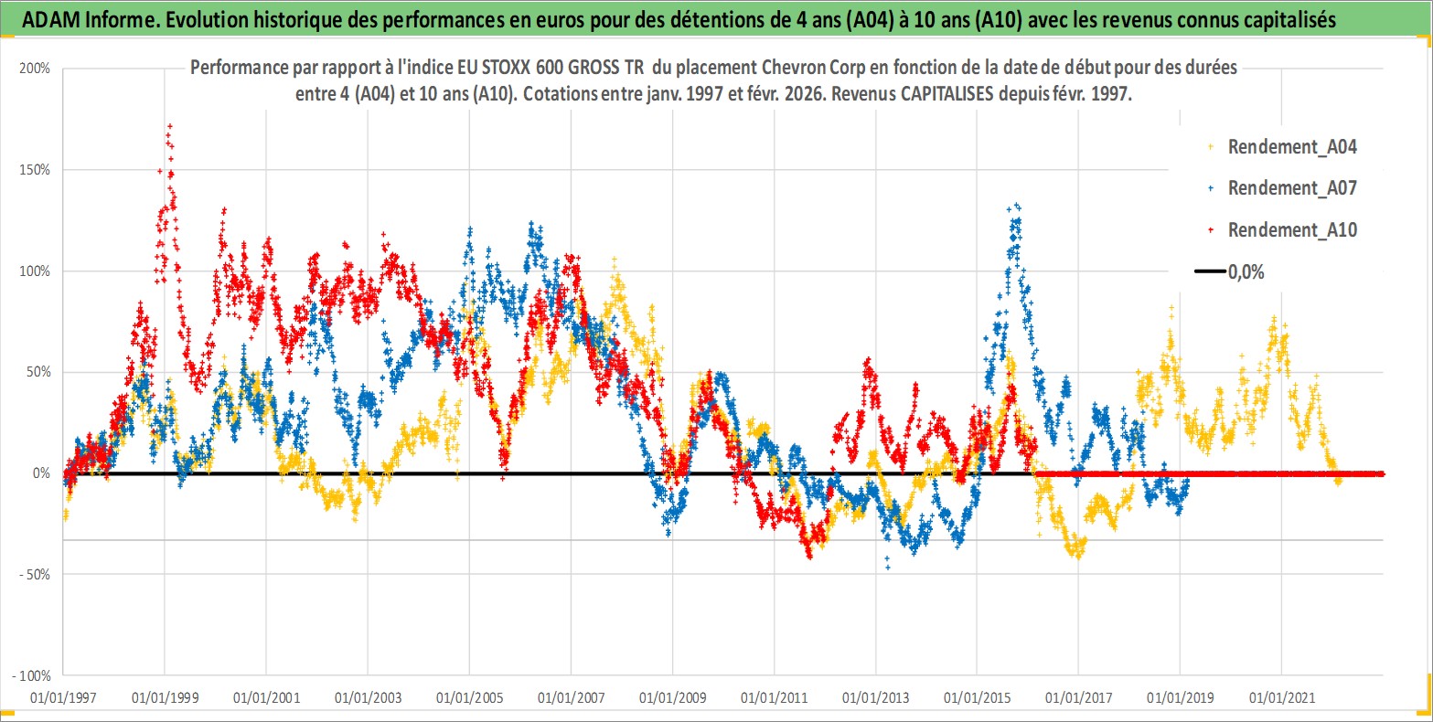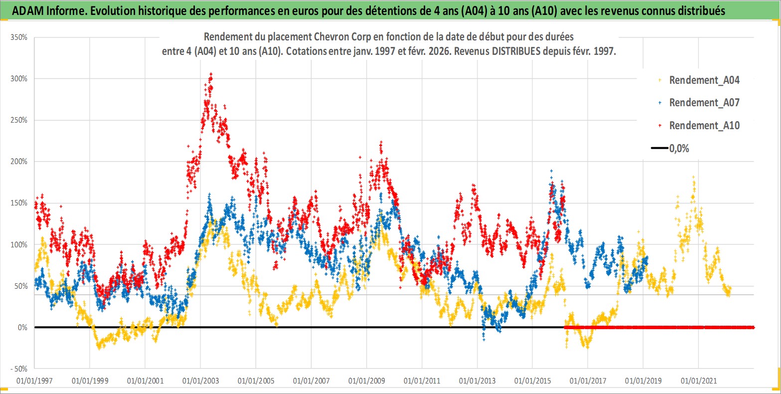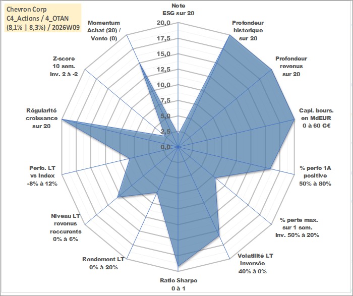 Site dédié aux investisseursPage dédiée sur site financeAnalyse des valorisations hebdomadaires de l'action Chevron Corp. Cet actif est cote en USD. Les valorisations sont en contrevaleur EURO et couvrent les semaines 1997W01 a 2026W09. Les revenus de cet actif financier sont pris en compte depuis la semaine 1997W08. La note globale ESG de cet actif est estimee a 2.0 (apres rebasage entre 0 et 20).