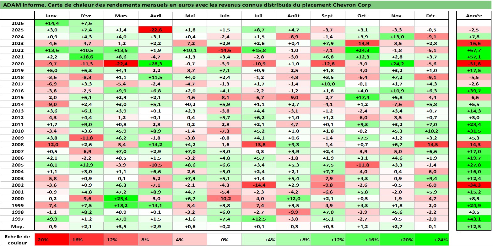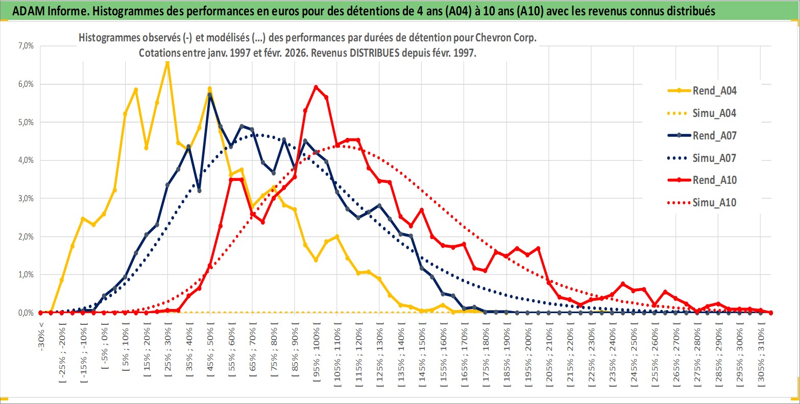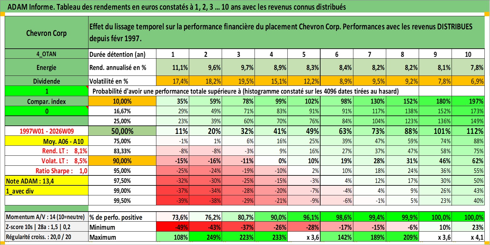 Site dédié aux investisseursPage dédiée sur site financeAnalyse des valorisations hebdomadaires de l'action Chevron Corp. Cet actif est cote en USD. Les valorisations sont en contrevaleur EURO et couvrent les semaines 1997W01 a 2026W09. Les revenus de cet actif financier sont pris en compte depuis la semaine 1997W08. La note globale ESG de cet actif est estimee a 2.0 (apres rebasage entre 0 et 20).