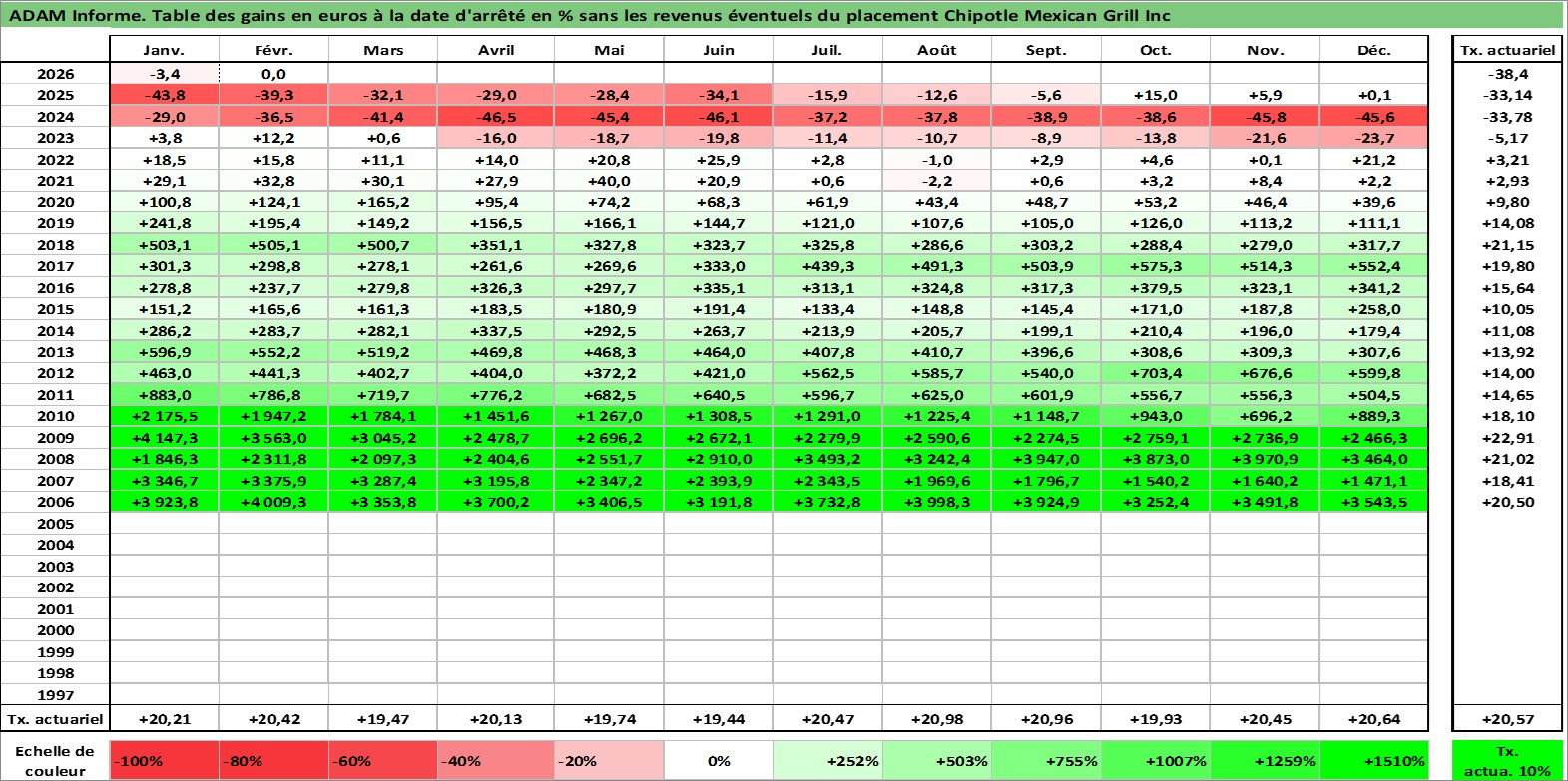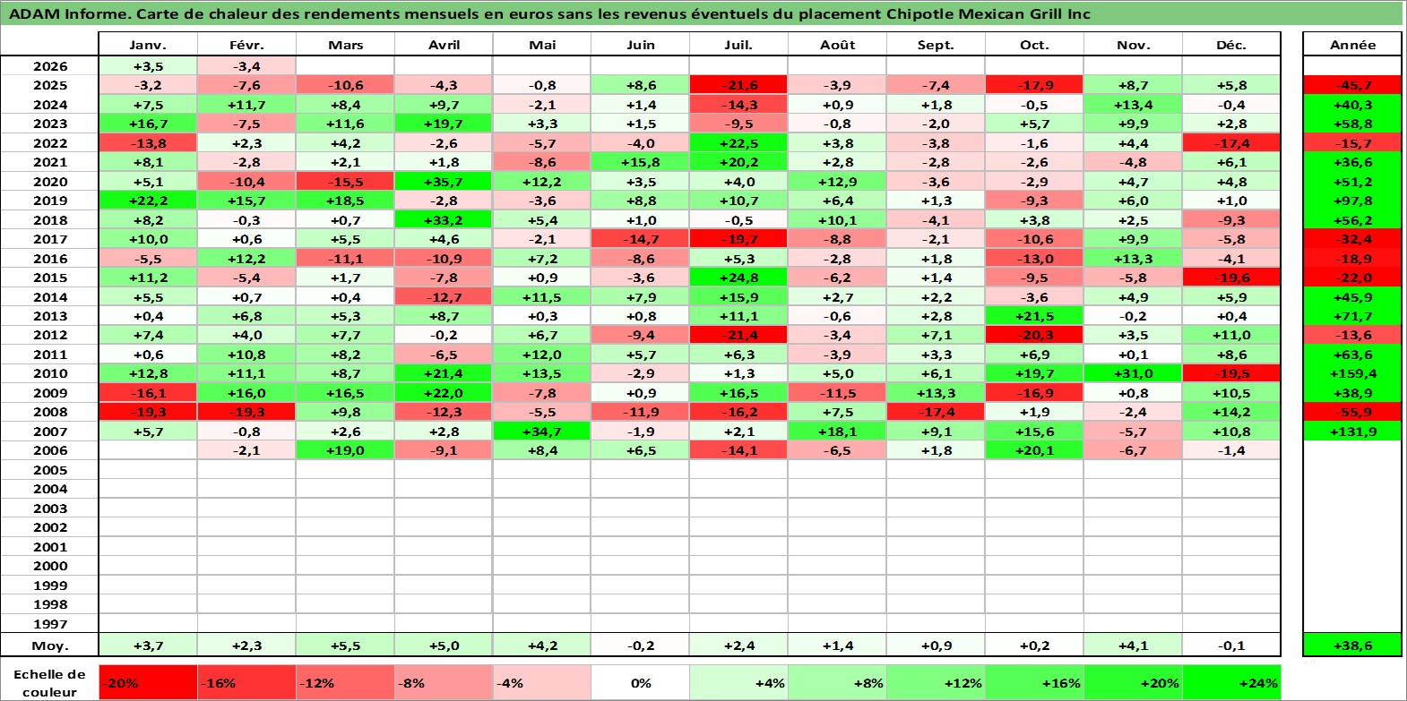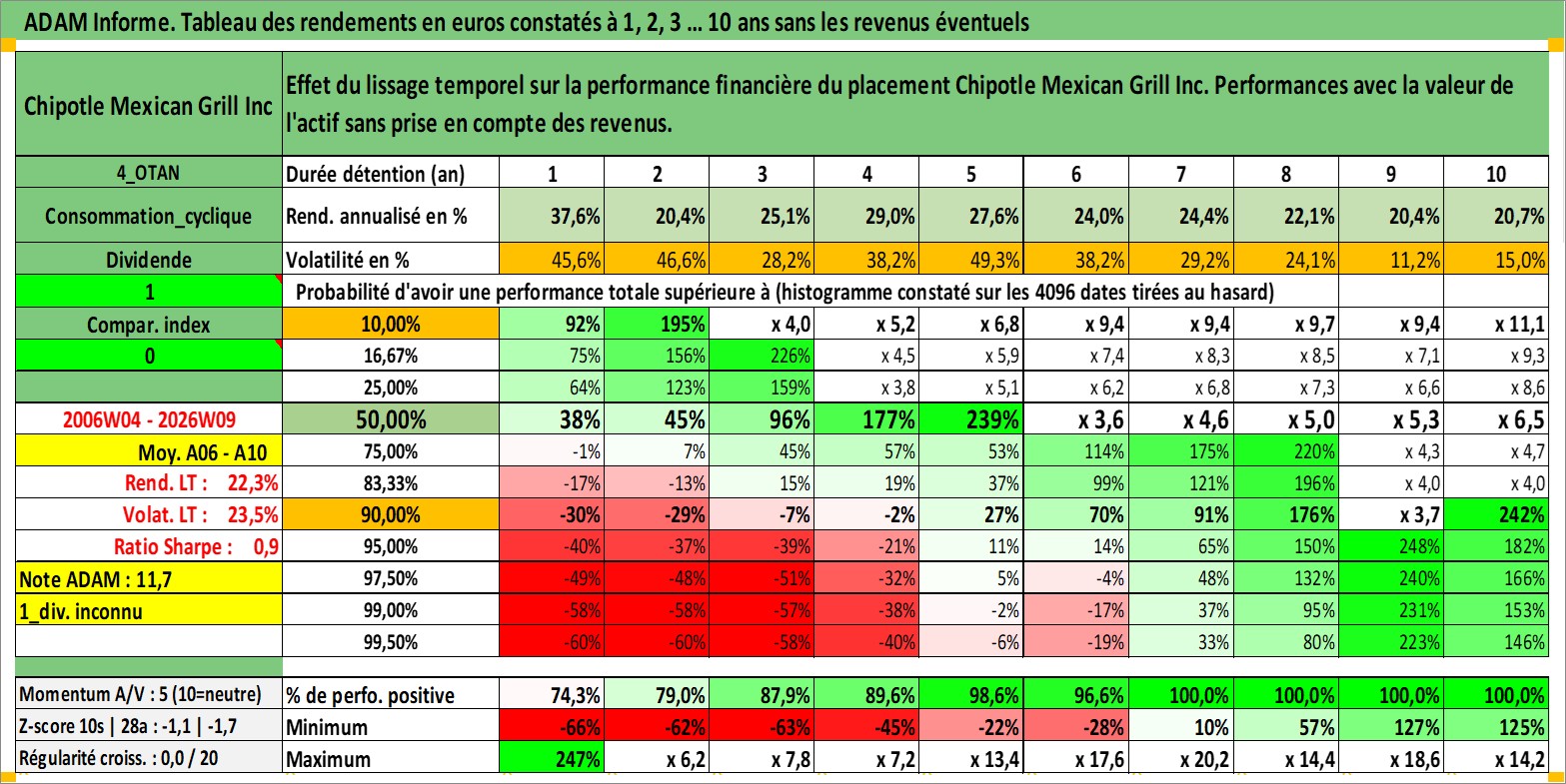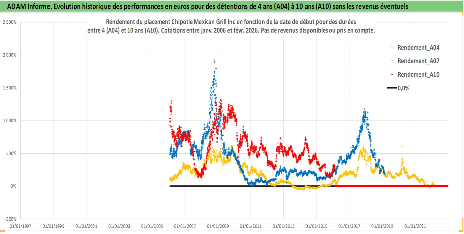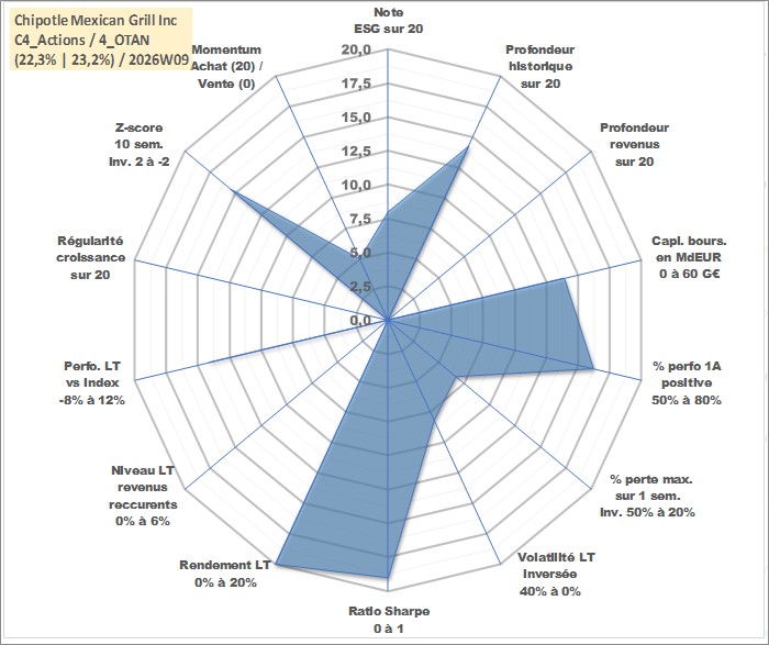 Site dédié aux investisseursPage dédiée sur site financeAnalyse des valorisations hebdomadaires de l'action Chipotle Mexican Grill Inc. Cet actif est cote en USD. Les valorisations sont en contrevaleur EURO et couvrent les semaines 2006W04 a 2026W09. Les revenus de cet actif financier ne sont pas connus car non existants ou non disponibles sur le site Yahoo Finance. La note globale ESG de cet actif est estimee a 8.0 (apres rebasage entre 0 et 20).