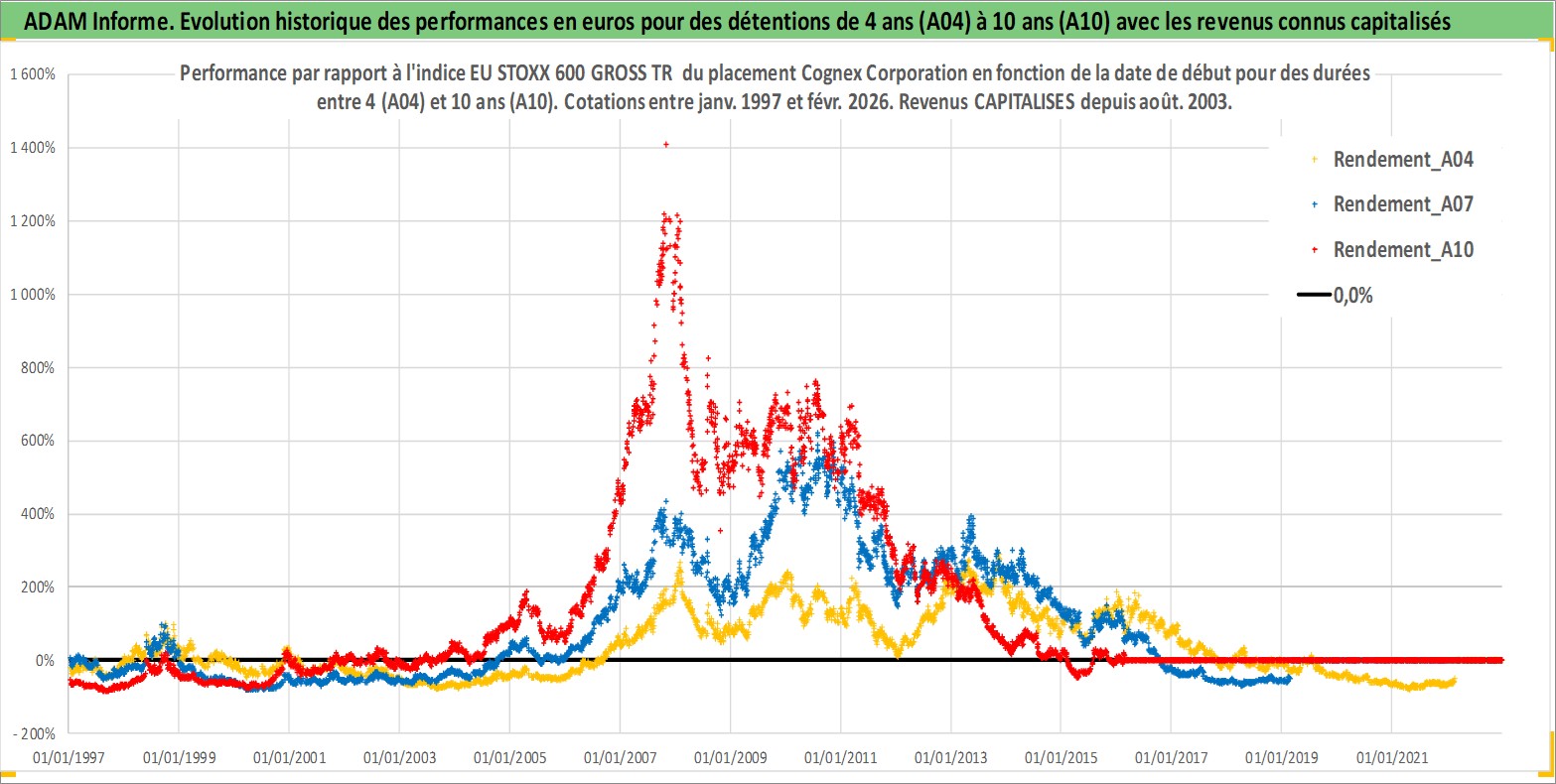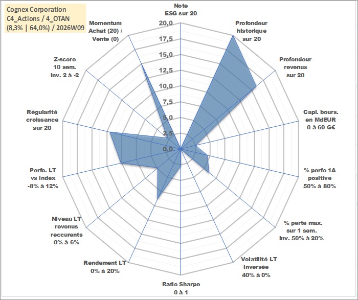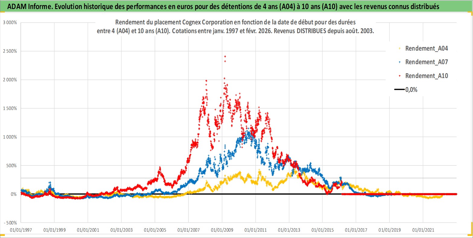 Site dédié aux investisseursPage dédiée sur site financeAnalyse des valorisations hebdomadaires de l'action Cognex Corporation. Cet actif est cote en USD. Les valorisations sont en contrevaleur EURO et couvrent les semaines 1997W01 a 2026W09. Les revenus de cet actif financier sont pris en compte depuis la semaine 2003W35. La note ESG de cet actif n'est pas connue.