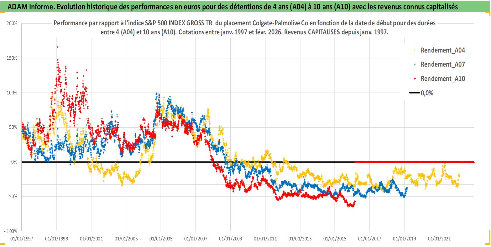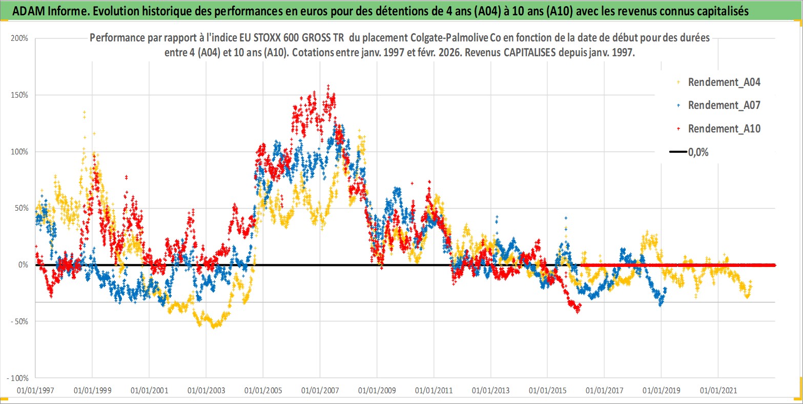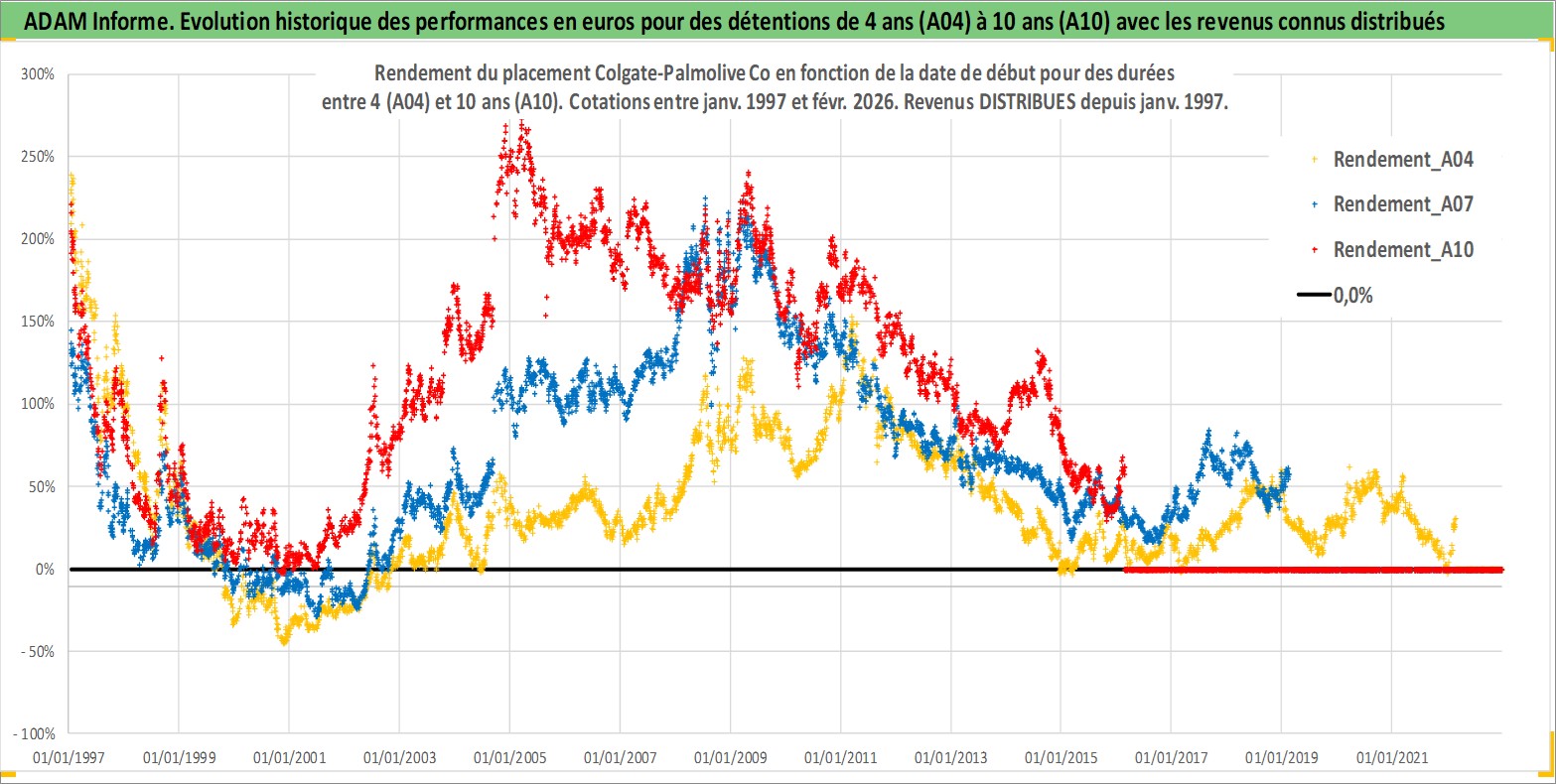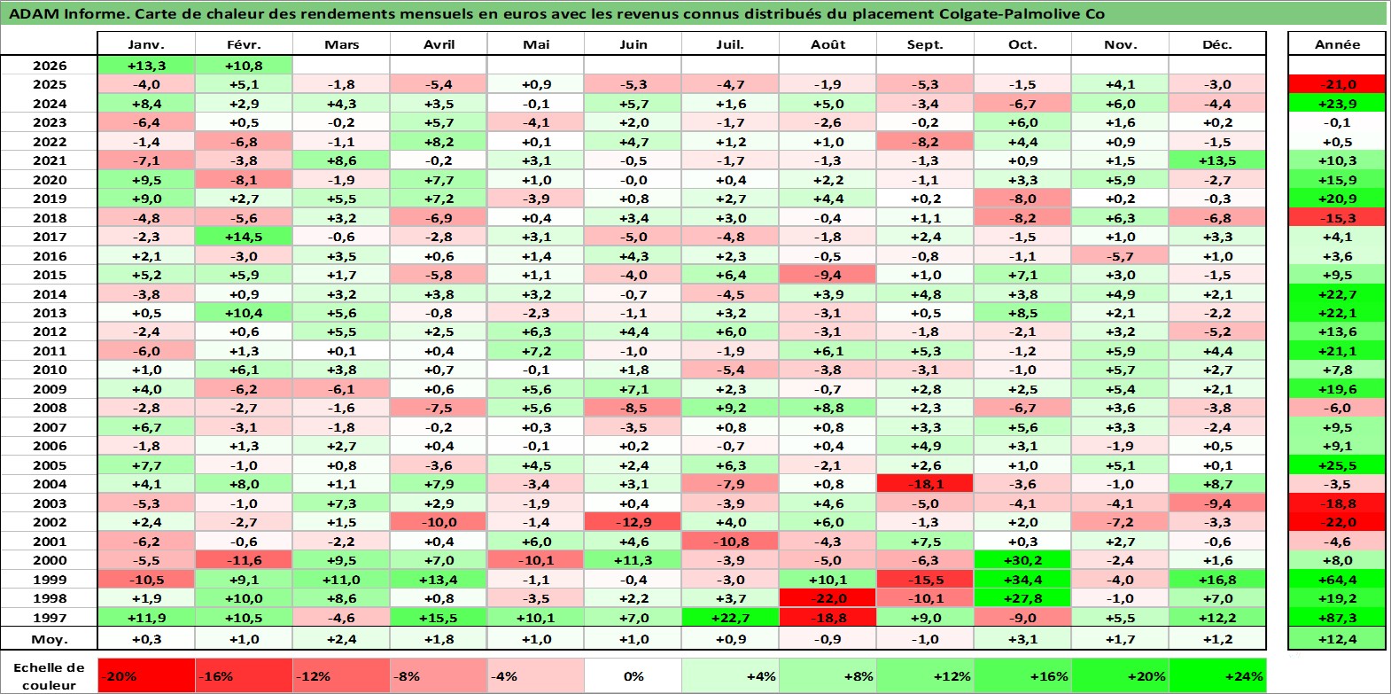 Site dédié aux investisseursPage dédiée sur site financeAnalyse des valorisations hebdomadaires de l'action Colgate-Palmolive Co. Cet actif est cote en USD. Les valorisations sont en contrevaleur EURO et couvrent les semaines 1997W01 a 2026W09. Les revenus de cet actif financier sont pris en compte depuis la semaine 1997W04. La note globale ESG de cet actif est estimee a 9.0 (apres rebasage entre 0 et 20).