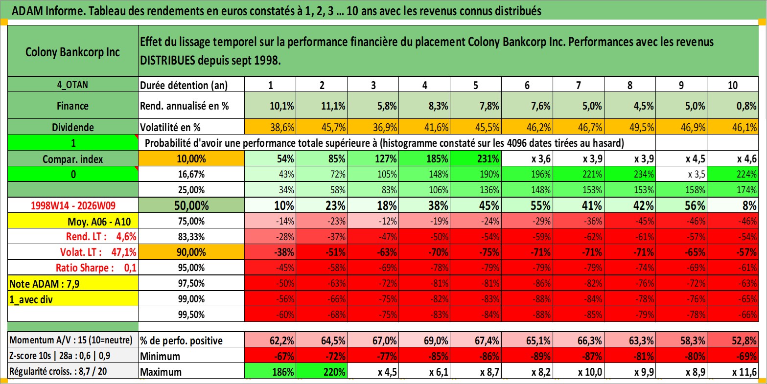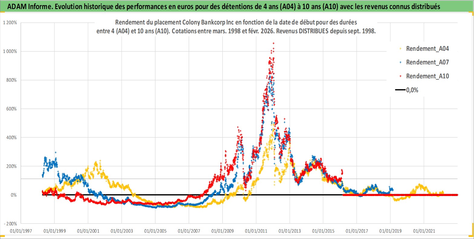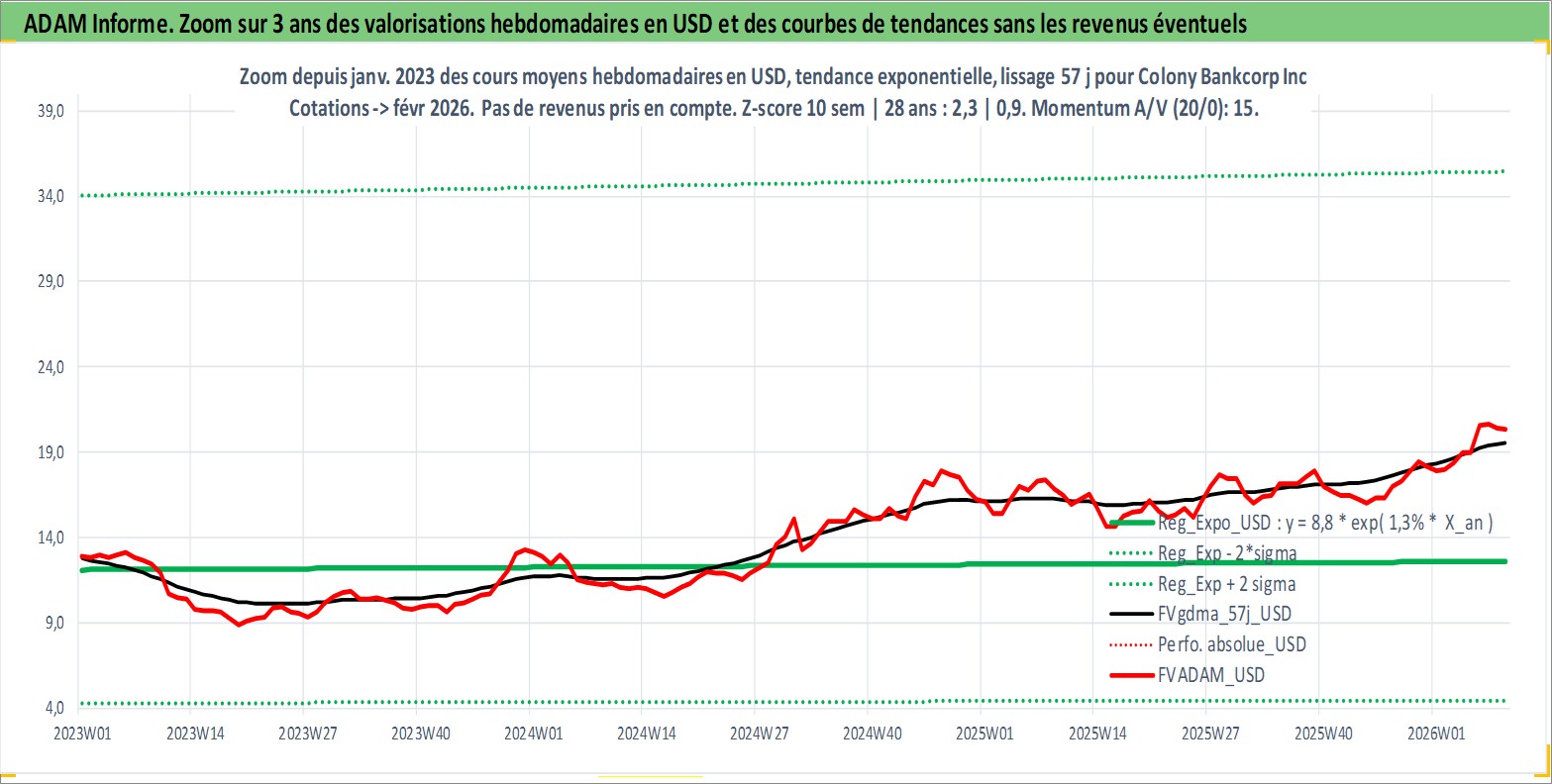 Site dédié aux investisseursPage dédiée sur site financeAnalyse des valorisations hebdomadaires de l'action Colony Bankcorp Inc. Cet actif est cote en USD. Les valorisations sont en contrevaleur EURO et couvrent les semaines 1998W14 a 2026W09. Les revenus de cet actif financier sont pris en compte depuis la semaine 1998W40. La note ESG de cet actif n'est pas connue.