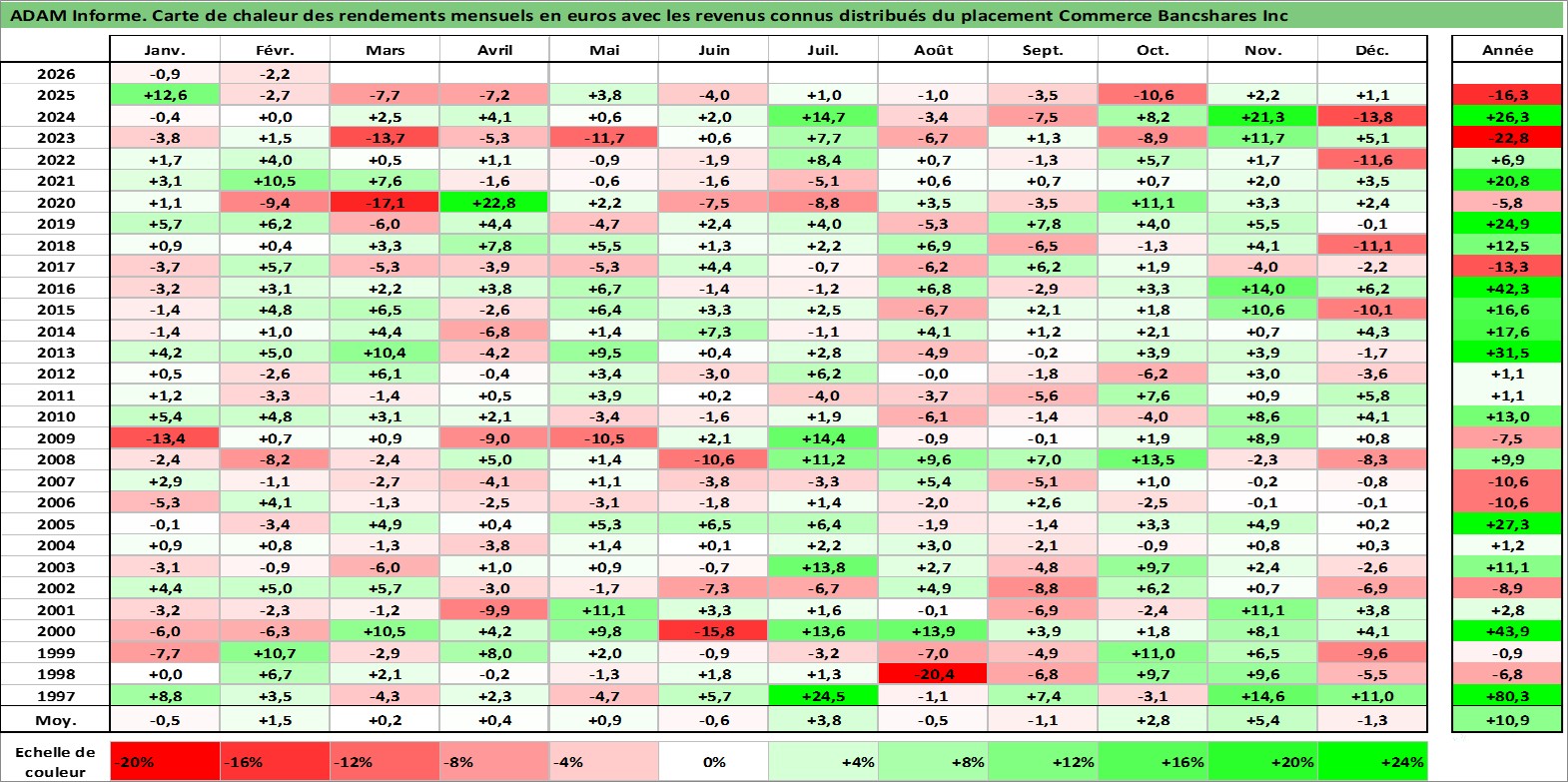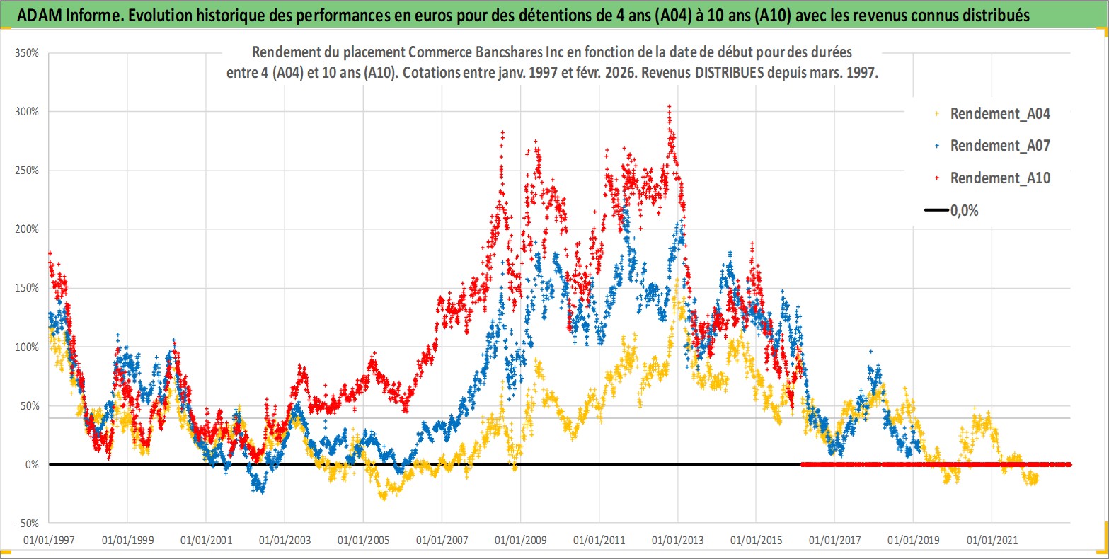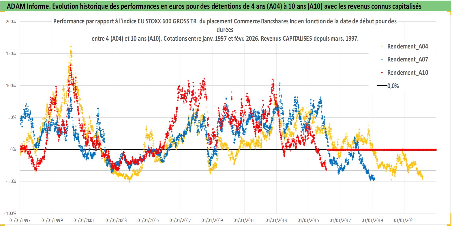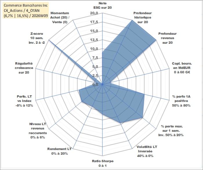 Site dédié aux investisseursPage dédiée sur site financeAnalyse des valorisations hebdomadaires de l'action Commerce Bancshares Inc. Cet actif est cote en USD. Les valorisations sont en contrevaleur EURO et couvrent les semaines 1997W01 a 2026W09. Les revenus de cet actif financier sont pris en compte depuis la semaine 1997W10. La note globale ESG de cet actif est estimee a 9.0 (apres rebasage entre 0 et 20).