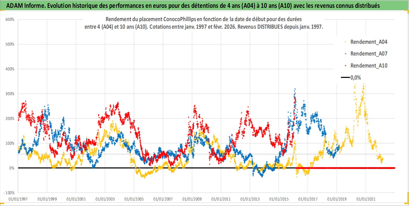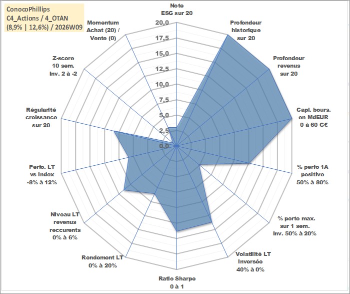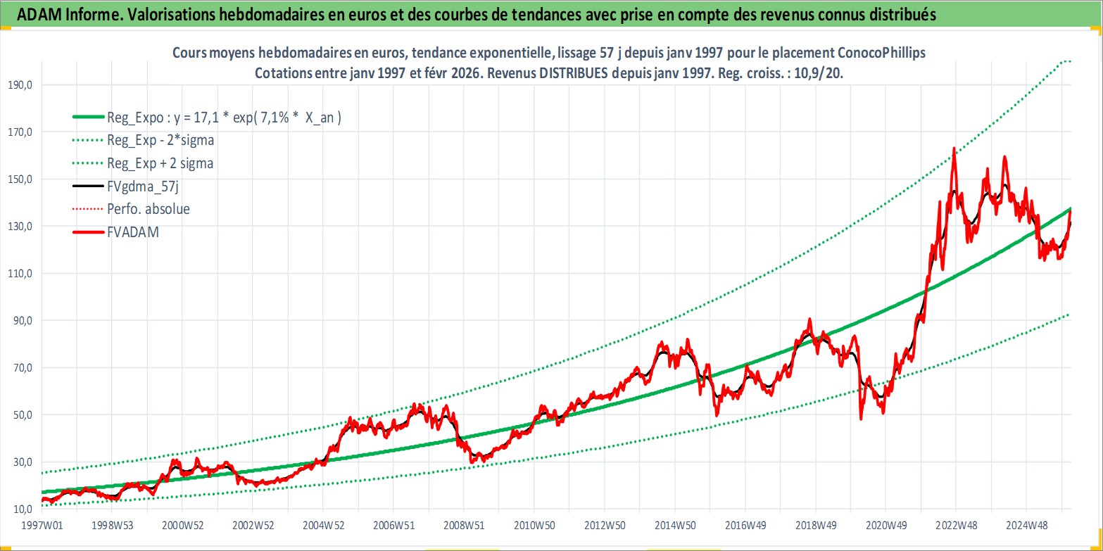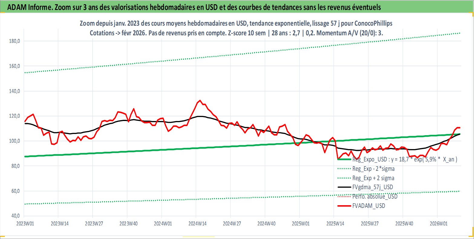 Site dédié aux investisseursPage dédiée sur site financeAnalyse des valorisations hebdomadaires de l'action ConocoPhillips. Cet actif est cote en USD. Les valorisations sont en contrevaleur EURO et couvrent les semaines 1997W01 a 2026W09. Les revenus de cet actif financier sont pris en compte depuis la semaine 1997W05. La note globale ESG de cet actif est estimee a 3.0 (apres rebasage entre 0 et 20).
