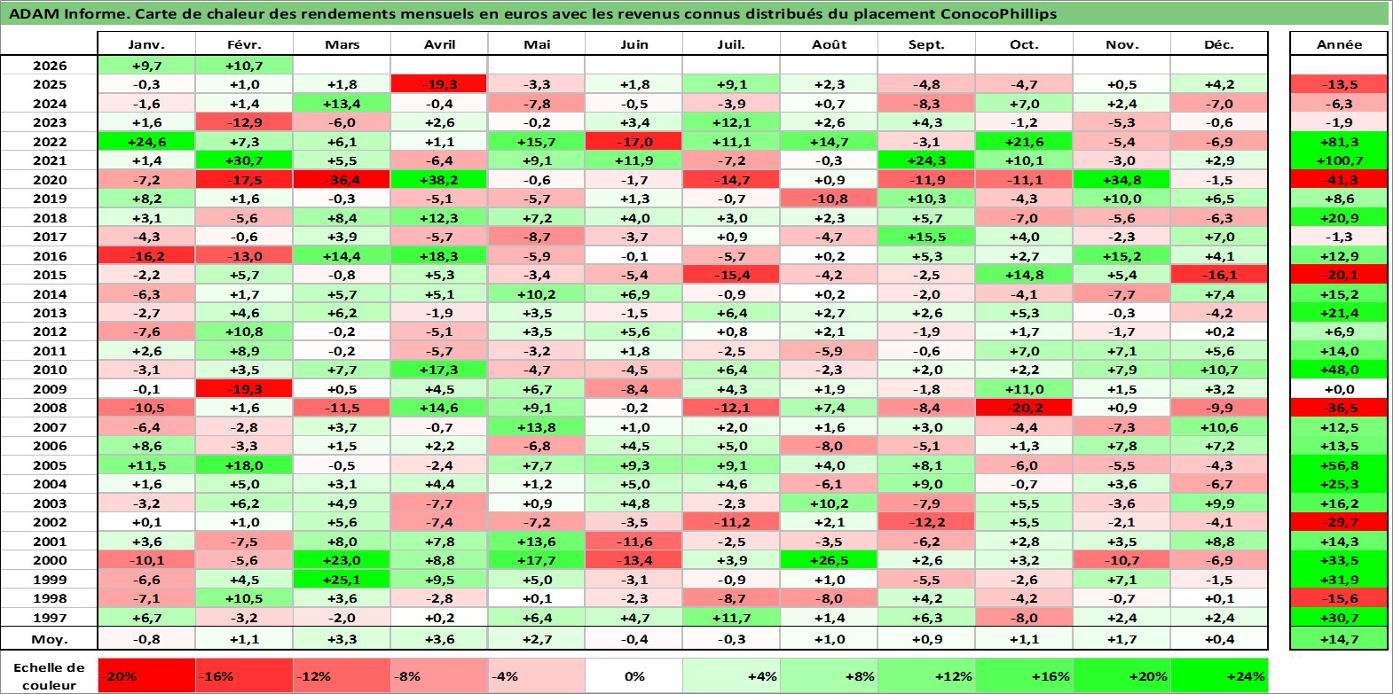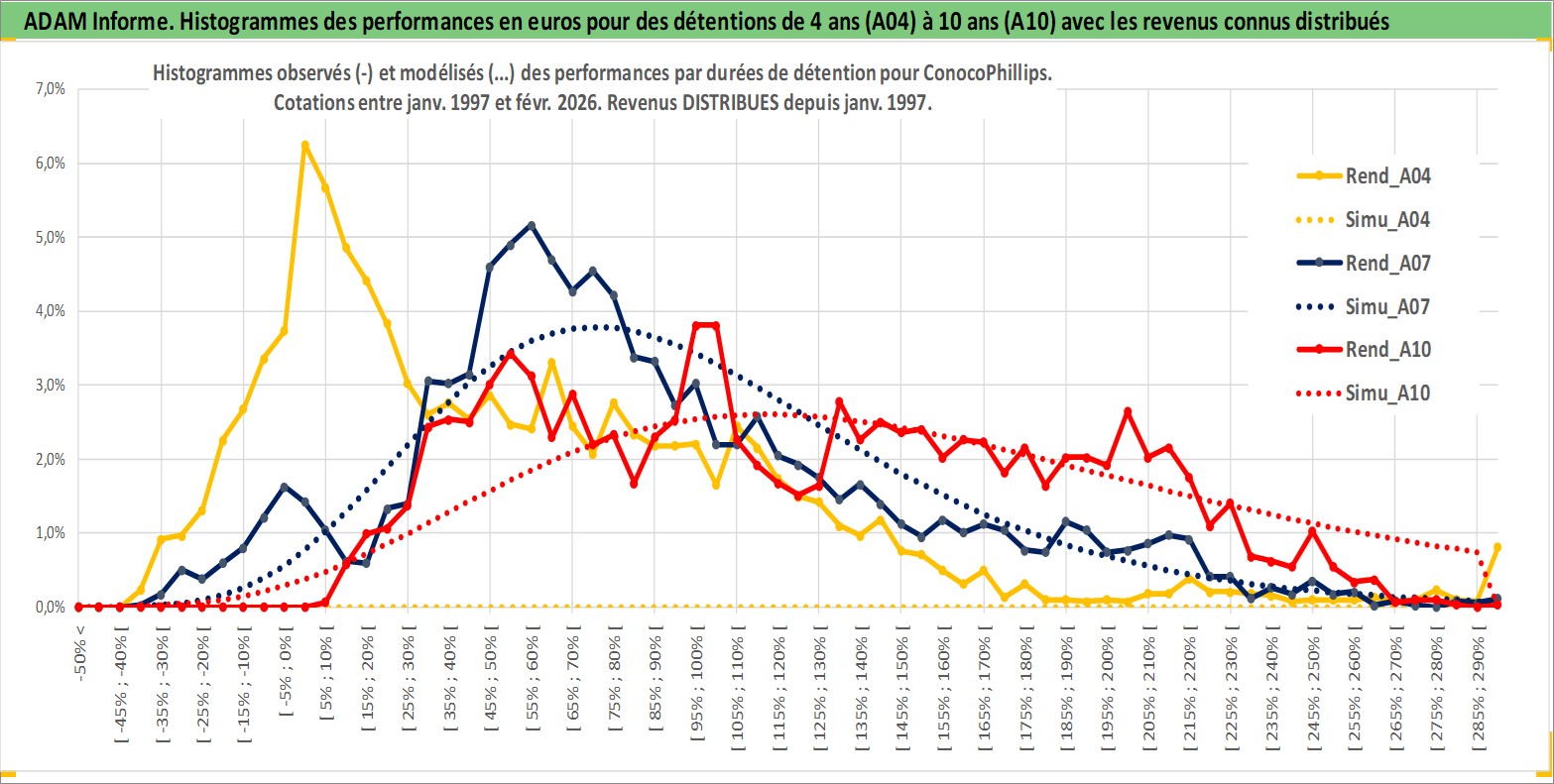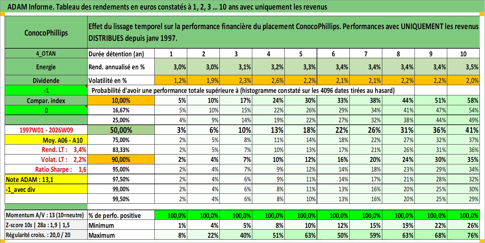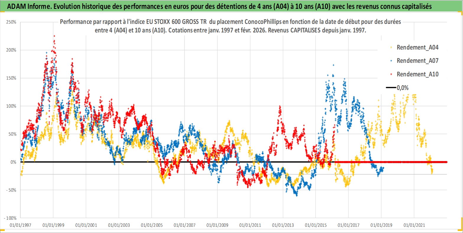 Site dédié aux investisseursPage dédiée sur site financeAnalyse des valorisations hebdomadaires de l'action ConocoPhillips. Cet actif est cote en USD. Les valorisations sont en contrevaleur EURO et couvrent les semaines 1997W01 a 2026W09. Les revenus de cet actif financier sont pris en compte depuis la semaine 1997W05. La note globale ESG de cet actif est estimee a 3.0 (apres rebasage entre 0 et 20).