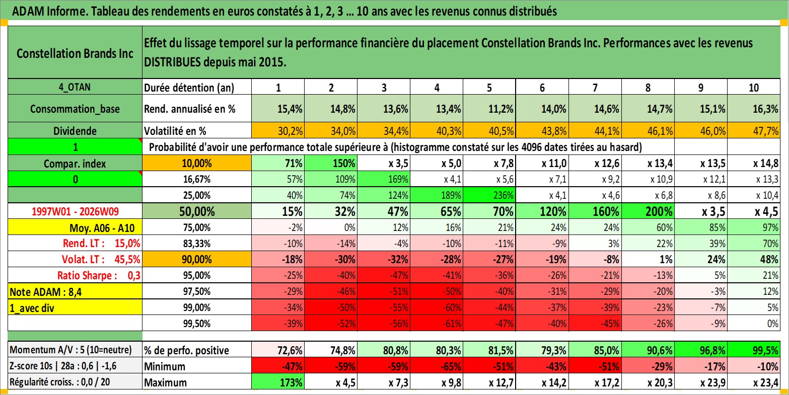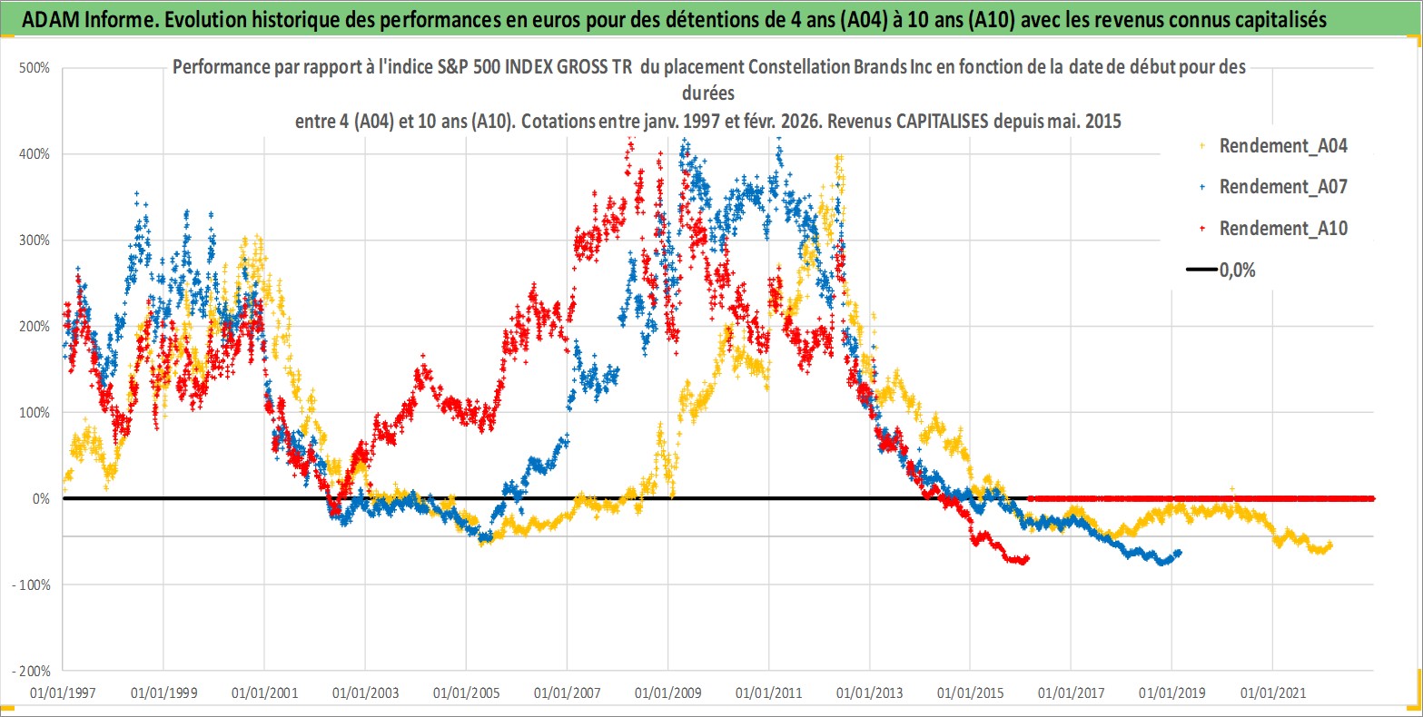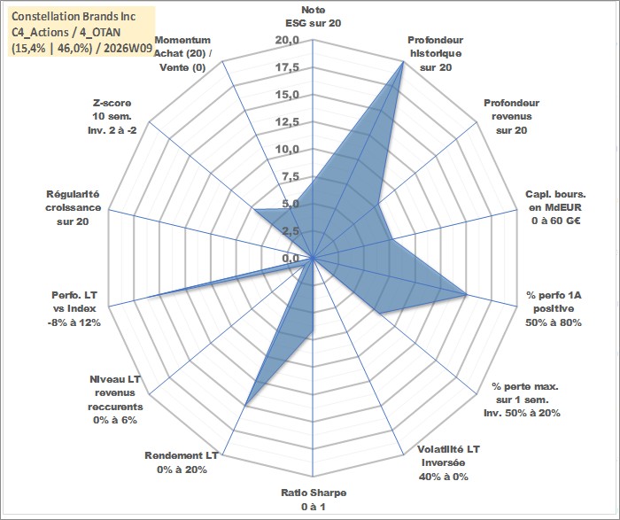 Site dédié aux investisseursPage dédiée sur site financeAnalyse des valorisations hebdomadaires de l'action Constellation Brands Inc. Cet actif est cote en USD. Les valorisations sont en contrevaleur EURO et couvrent les semaines 1997W01 a 2026W09. Les revenus de cet actif financier sont pris en compte depuis la semaine 2015W19. La note globale ESG de cet actif est estimee a 7.0 (apres rebasage entre 0 et 20).