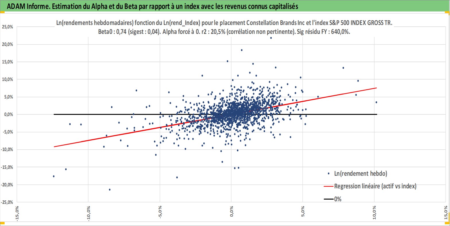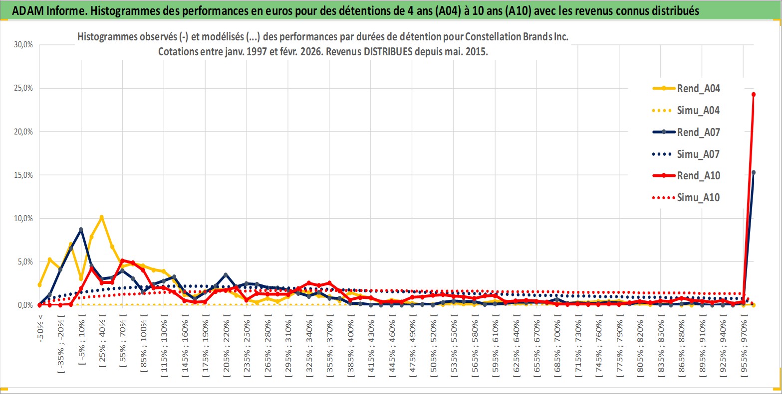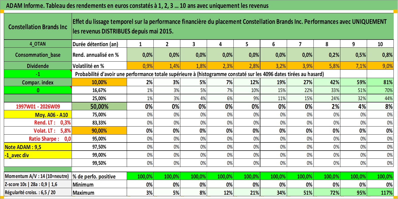 Site dédié aux investisseursPage dédiée sur site financeAnalyse des valorisations hebdomadaires de l'action Constellation Brands Inc. Cet actif est cote en USD. Les valorisations sont en contrevaleur EURO et couvrent les semaines 1997W01 a 2026W09. Les revenus de cet actif financier sont pris en compte depuis la semaine 2015W19. La note globale ESG de cet actif est estimee a 7.0 (apres rebasage entre 0 et 20).