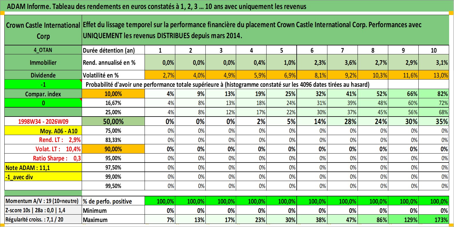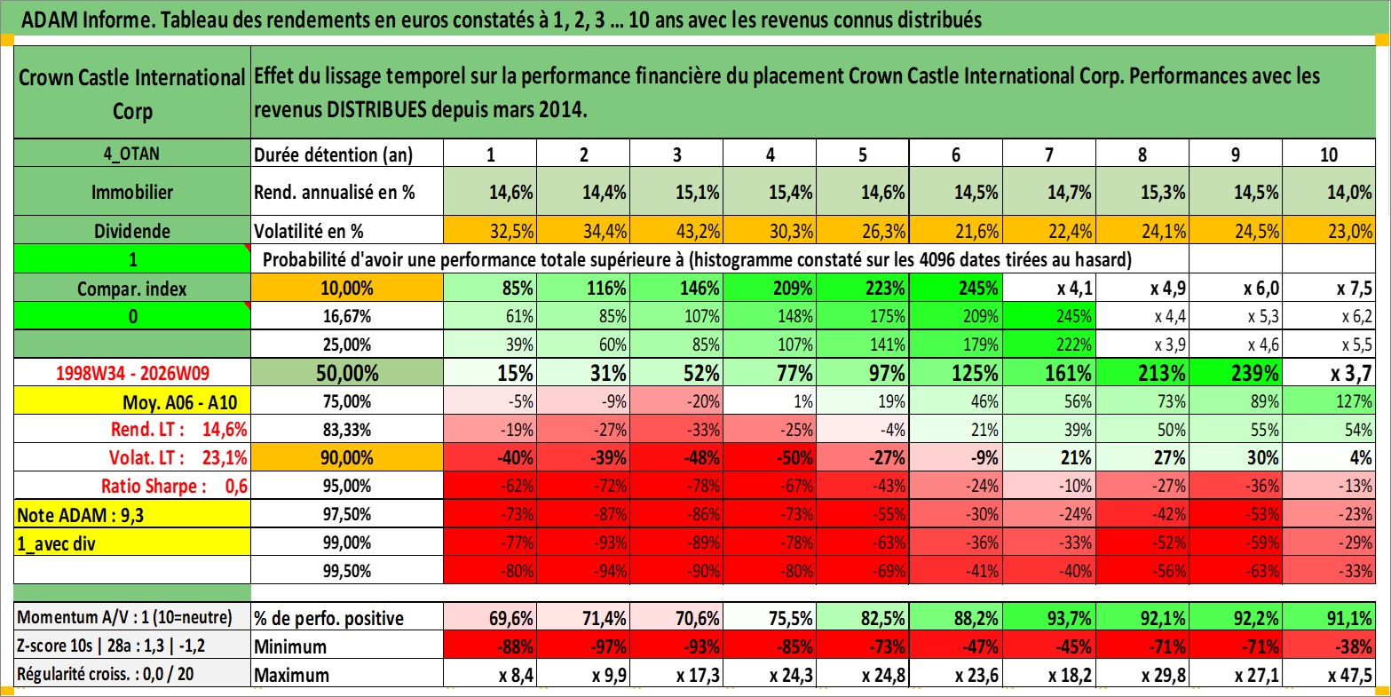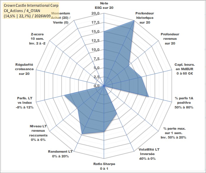Site dédié aux investisseursPage dédiée sur site financeAnalyse des valorisations hebdomadaires de l'action Crown Castle International Corp. Cet actif est cote en USD. Les valorisations sont en contrevaleur EURO et couvrent les semaines 1998W34 a 2026W09. Les revenus de cet actif financier sont pris en compte depuis la semaine 2014W12. La note globale ESG de cet actif est estimee a 15.0 (apres rebasage entre 0 et 20).