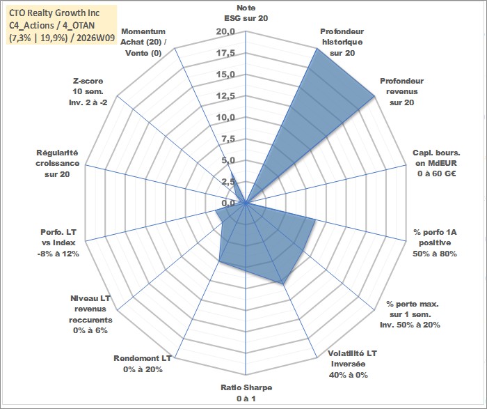 Site dédié aux investisseursPage dédiée sur site financeAnalyse des valorisations hebdomadaires de l'action CTO Realty Growth Inc. Cet actif est cote en USD. Les valorisations sont en contrevaleur EURO et couvrent les semaines 1997W01 a 2026W09. Les revenus de cet actif financier sont pris en compte depuis la semaine 1997W06. La note ESG de cet actif n'est pas connue.