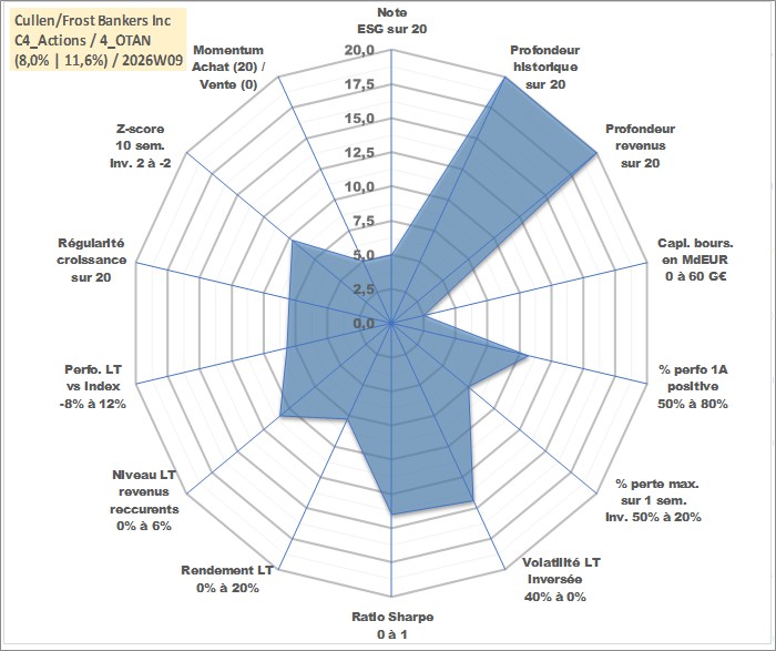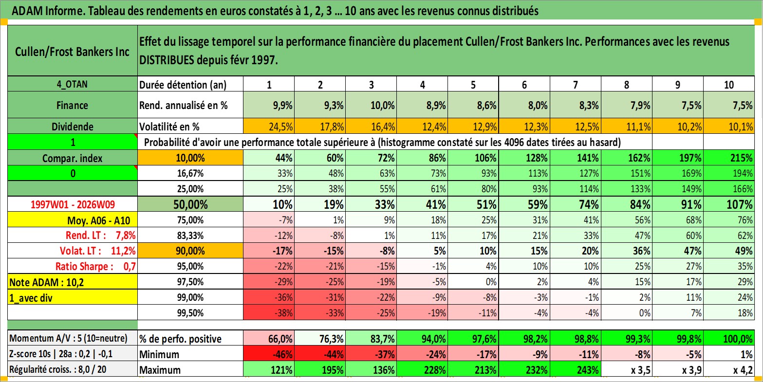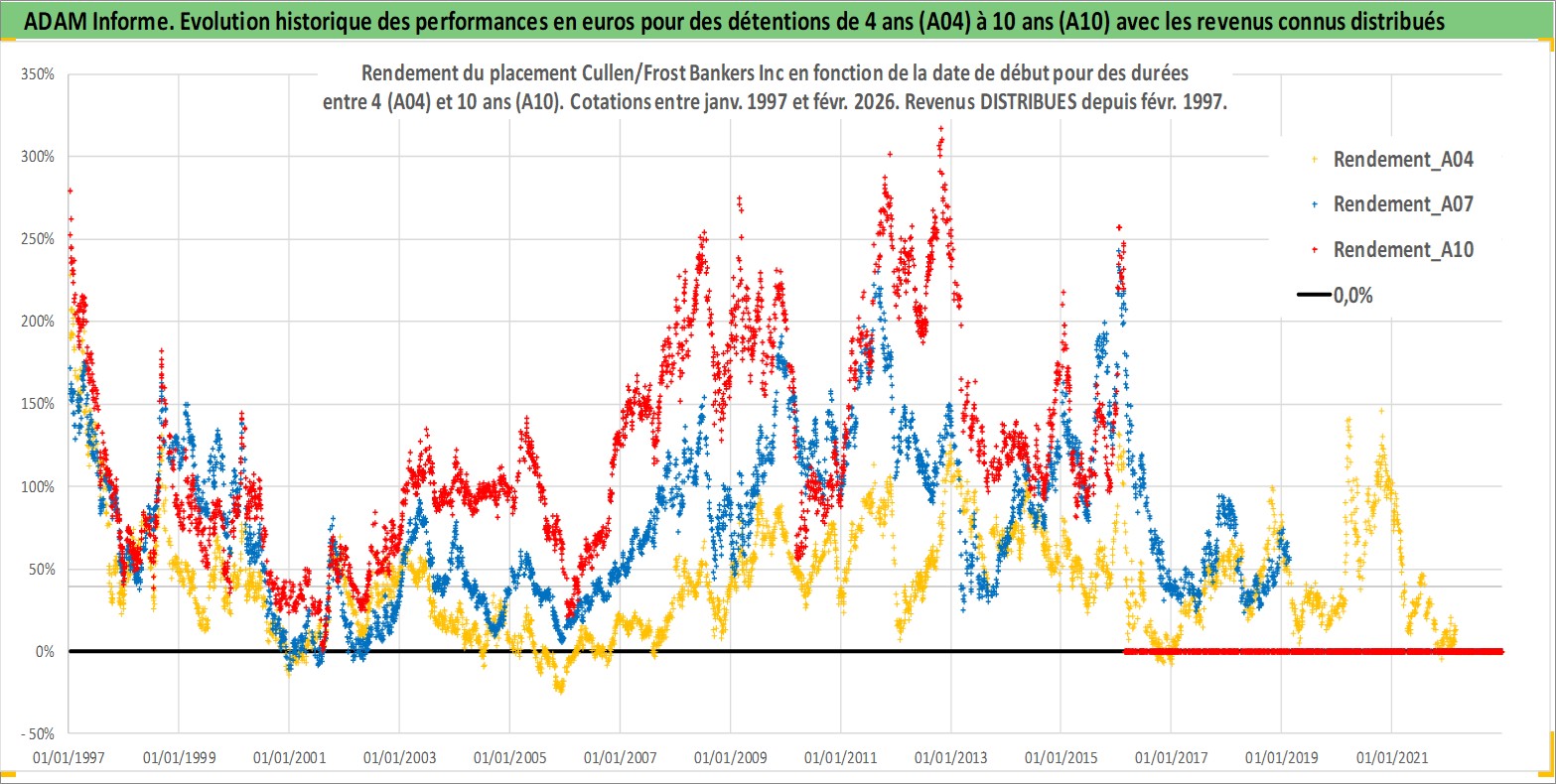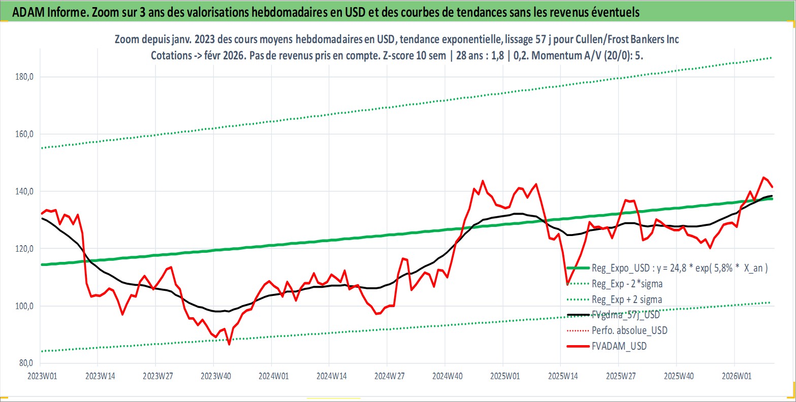 Site dédié aux investisseursPage dédiée sur site financeAnalyse des valorisations hebdomadaires de l'action Cullen/Frost Bankers Inc. Cet actif est cote en USD. Les valorisations sont en contrevaleur EURO et couvrent les semaines 1997W01 a 2026W09. Les revenus de cet actif financier sont pris en compte depuis la semaine 1997W09. La note globale ESG de cet actif est estimee a 5.0 (apres rebasage entre 0 et 20).