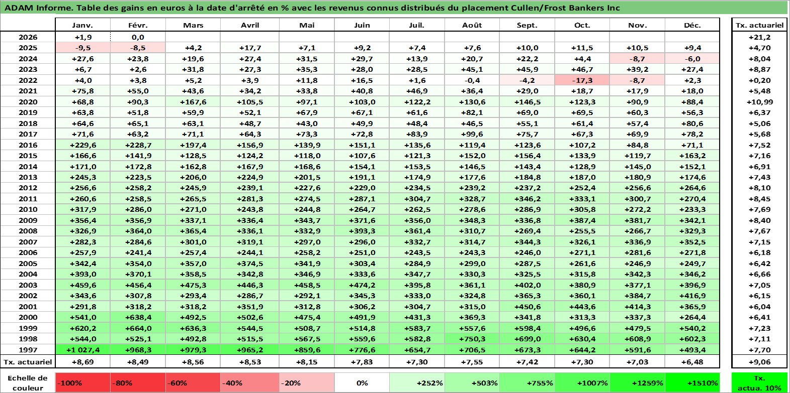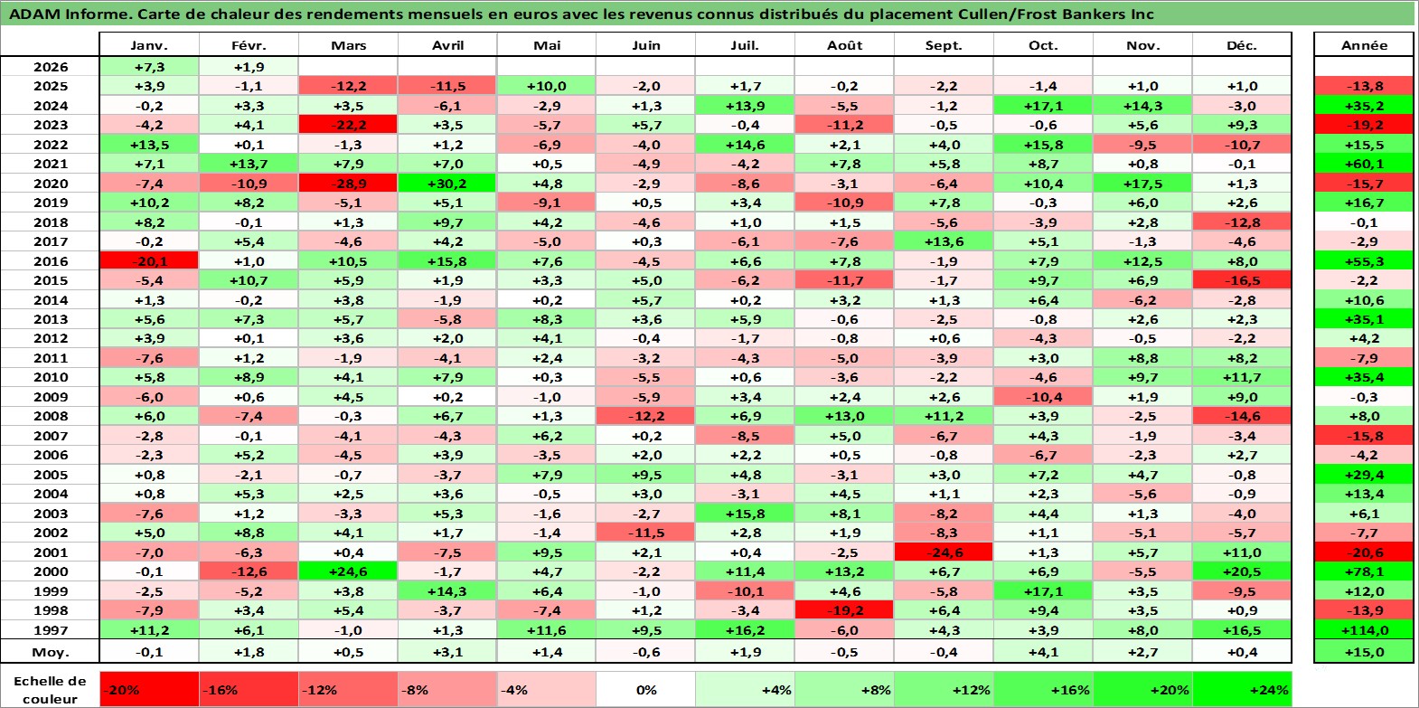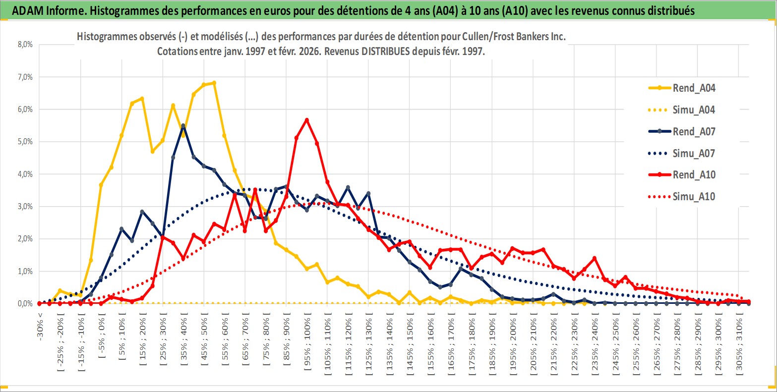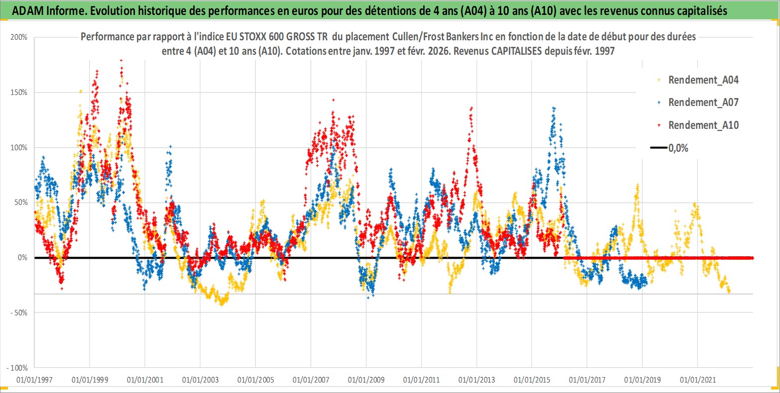 Site dédié aux investisseursPage dédiée sur site financeAnalyse des valorisations hebdomadaires de l'action Cullen/Frost Bankers Inc. Cet actif est cote en USD. Les valorisations sont en contrevaleur EURO et couvrent les semaines 1997W01 a 2026W09. Les revenus de cet actif financier sont pris en compte depuis la semaine 1997W09. La note globale ESG de cet actif est estimee a 5.0 (apres rebasage entre 0 et 20).