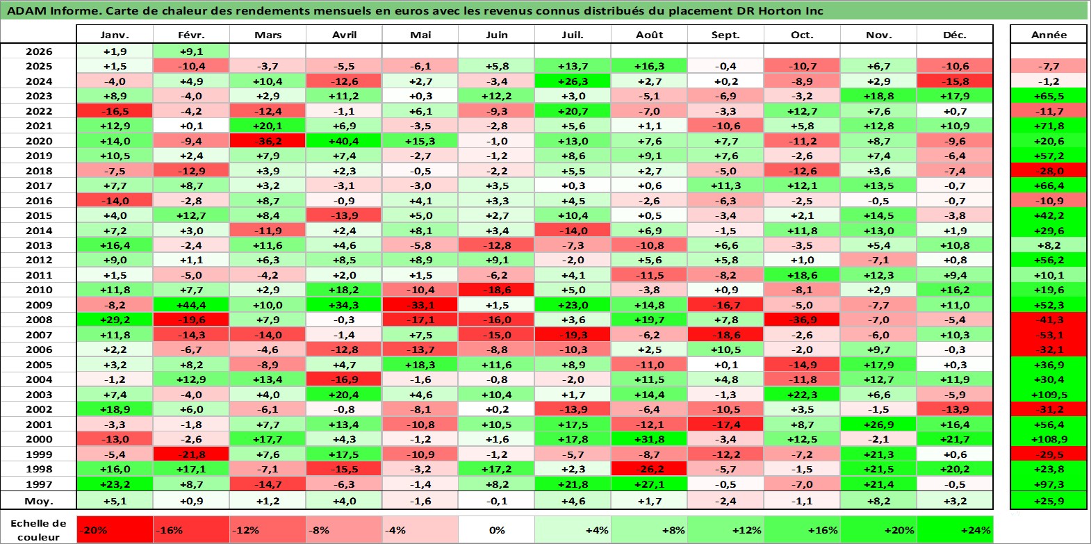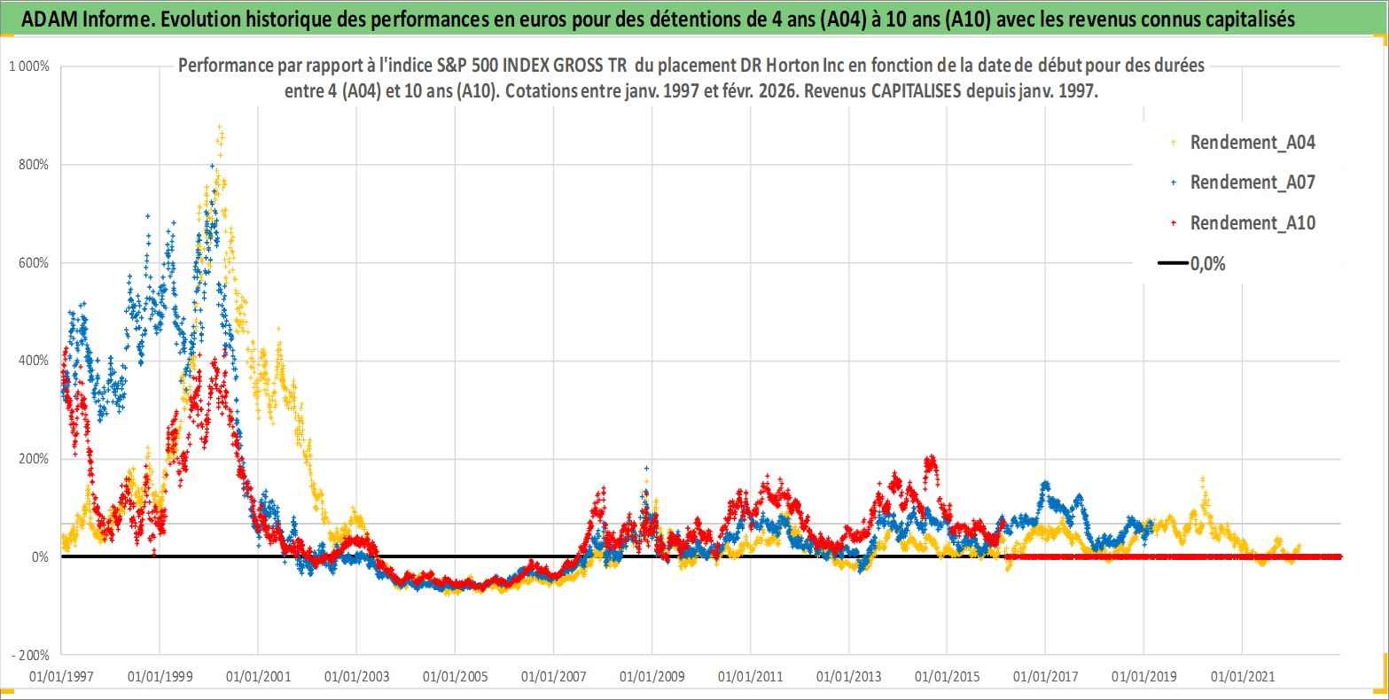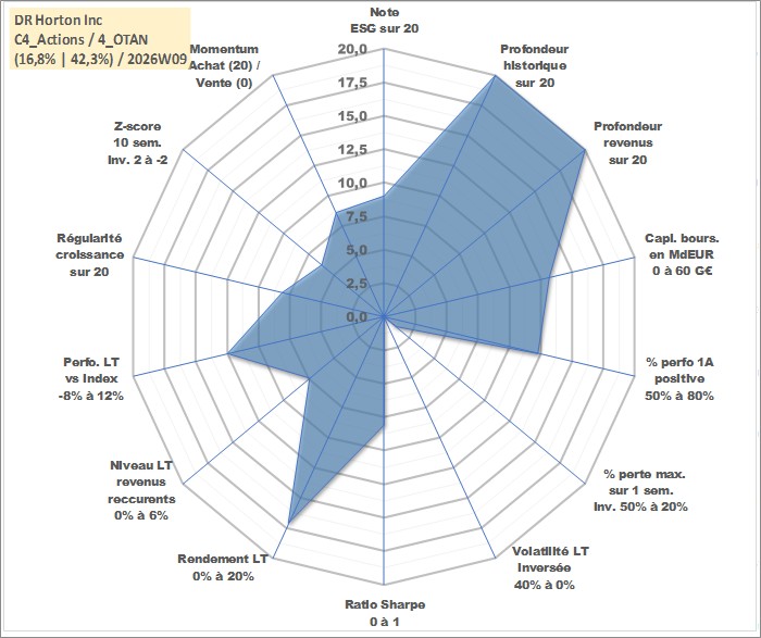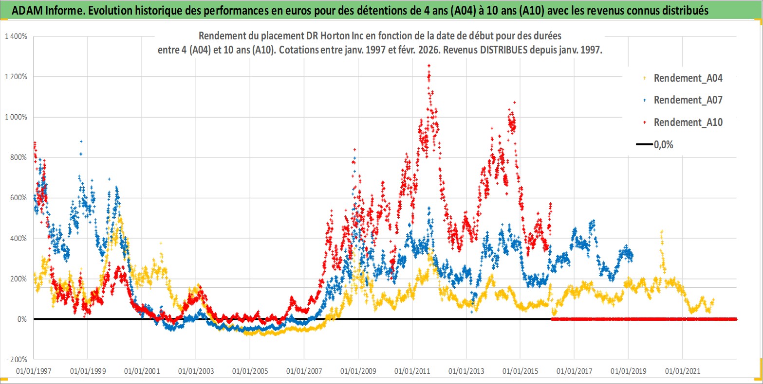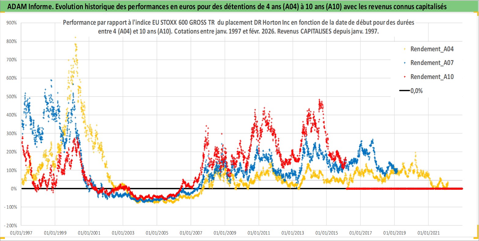 Site dédié aux investisseursPage dédiée sur site financeAnalyse des valorisations hebdomadaires de l'action DR Horton Inc. Cet actif est cote en USD. Les valorisations sont en contrevaleur EURO et couvrent les semaines 1997W01 a 2026W09. Les revenus de cet actif financier sont pris en compte depuis la semaine 1997W05. La note globale ESG de cet actif est estimee a 9.0 (apres rebasage entre 0 et 20).
