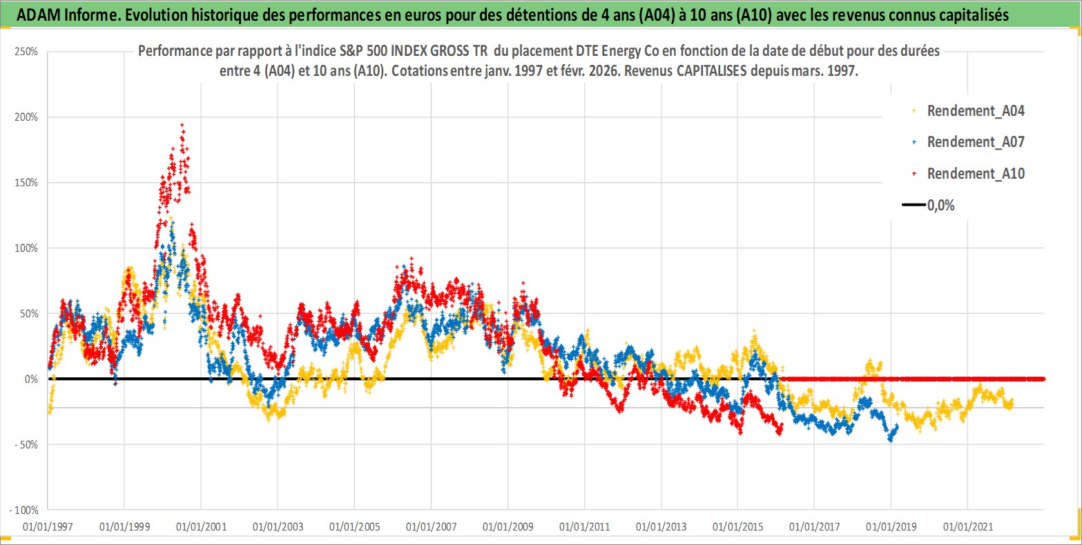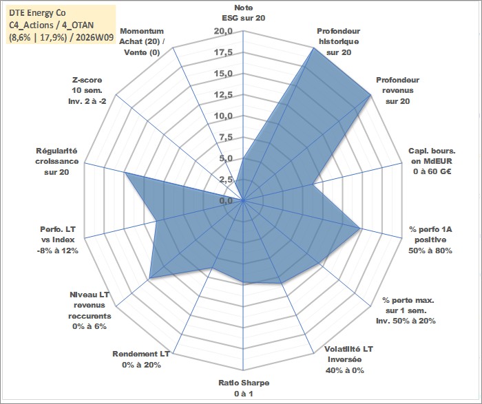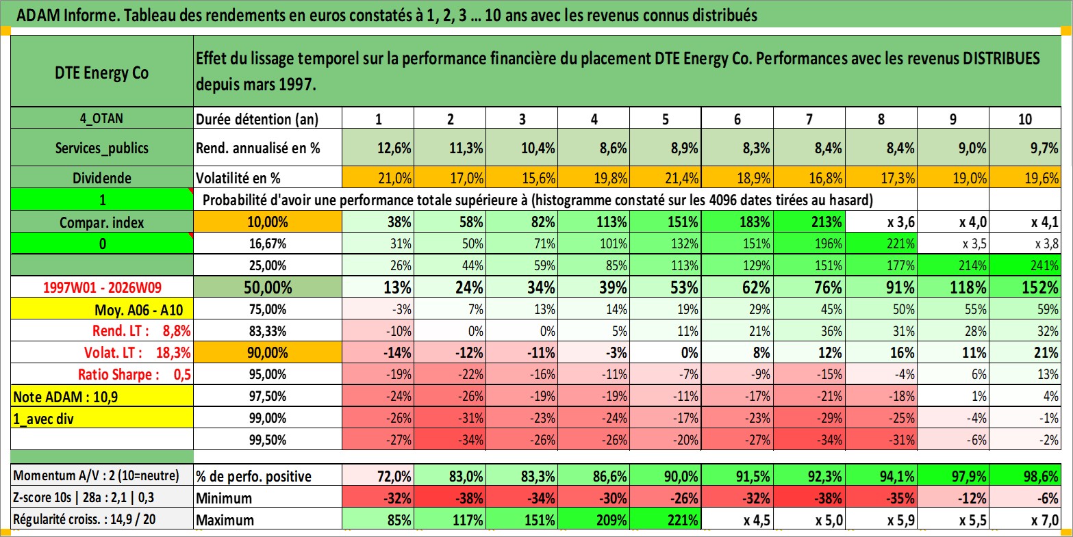 Site dédié aux investisseursPage dédiée sur site financeAnalyse des valorisations hebdomadaires de l'action DTE Energy Co. Cet actif est cote en USD. Les valorisations sont en contrevaleur EURO et couvrent les semaines 1997W01 a 2026W09. Les revenus de cet actif financier sont pris en compte depuis la semaine 1997W12. La note globale ESG de cet actif est estimee a 5.0 (apres rebasage entre 0 et 20).