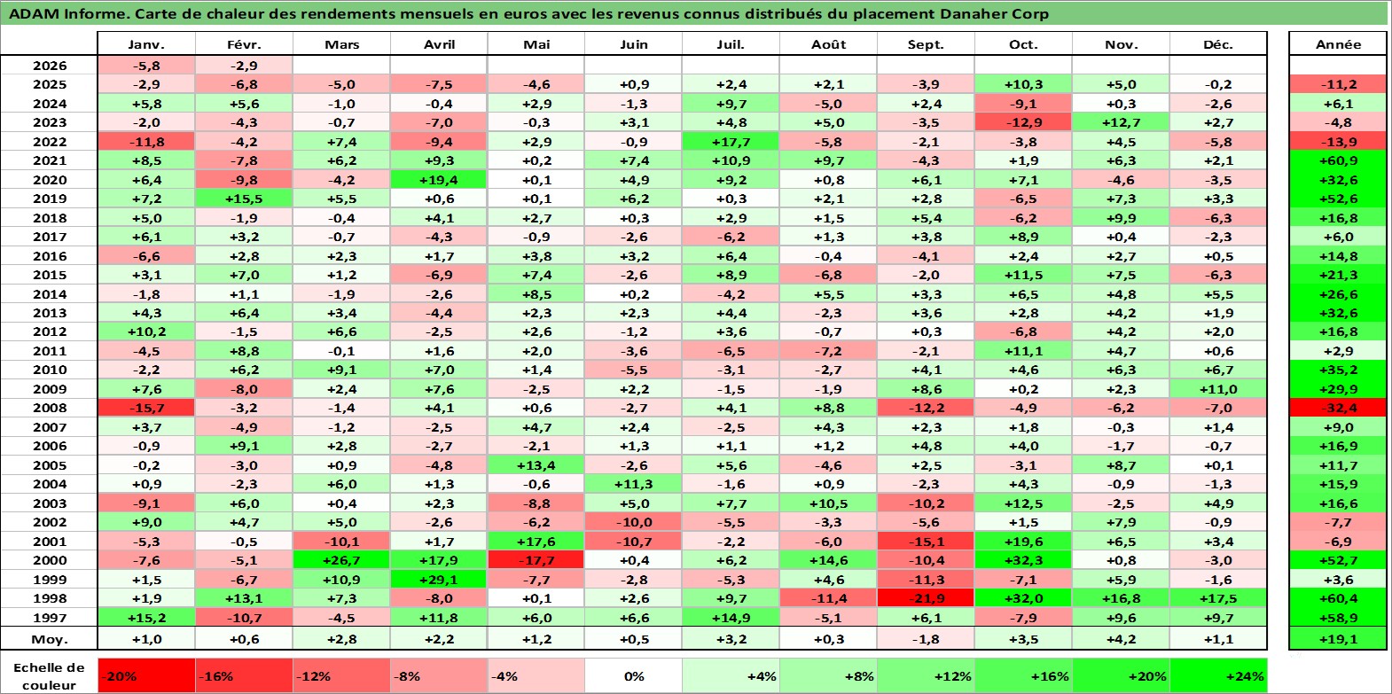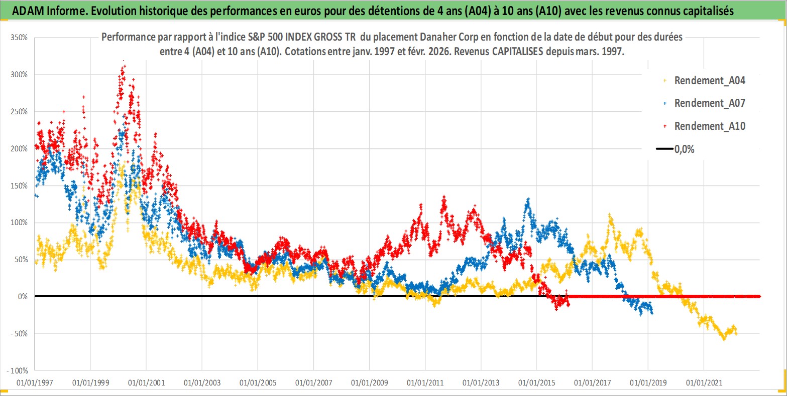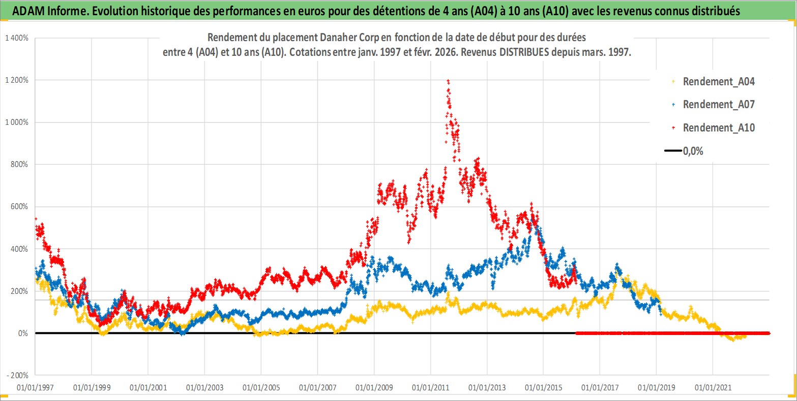 Site dédié aux investisseursPage dédiée sur site financeAnalyse des valorisations hebdomadaires de l'action Danaher Corp. Cet actif est cote en USD. Les valorisations sont en contrevaleur EURO et couvrent les semaines 1997W01 a 2026W09. Les revenus de cet actif financier sont pris en compte depuis la semaine 1997W12. La note globale ESG de cet actif est estimee a 15.0 (apres rebasage entre 0 et 20).