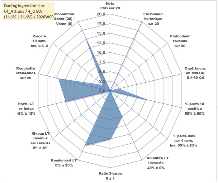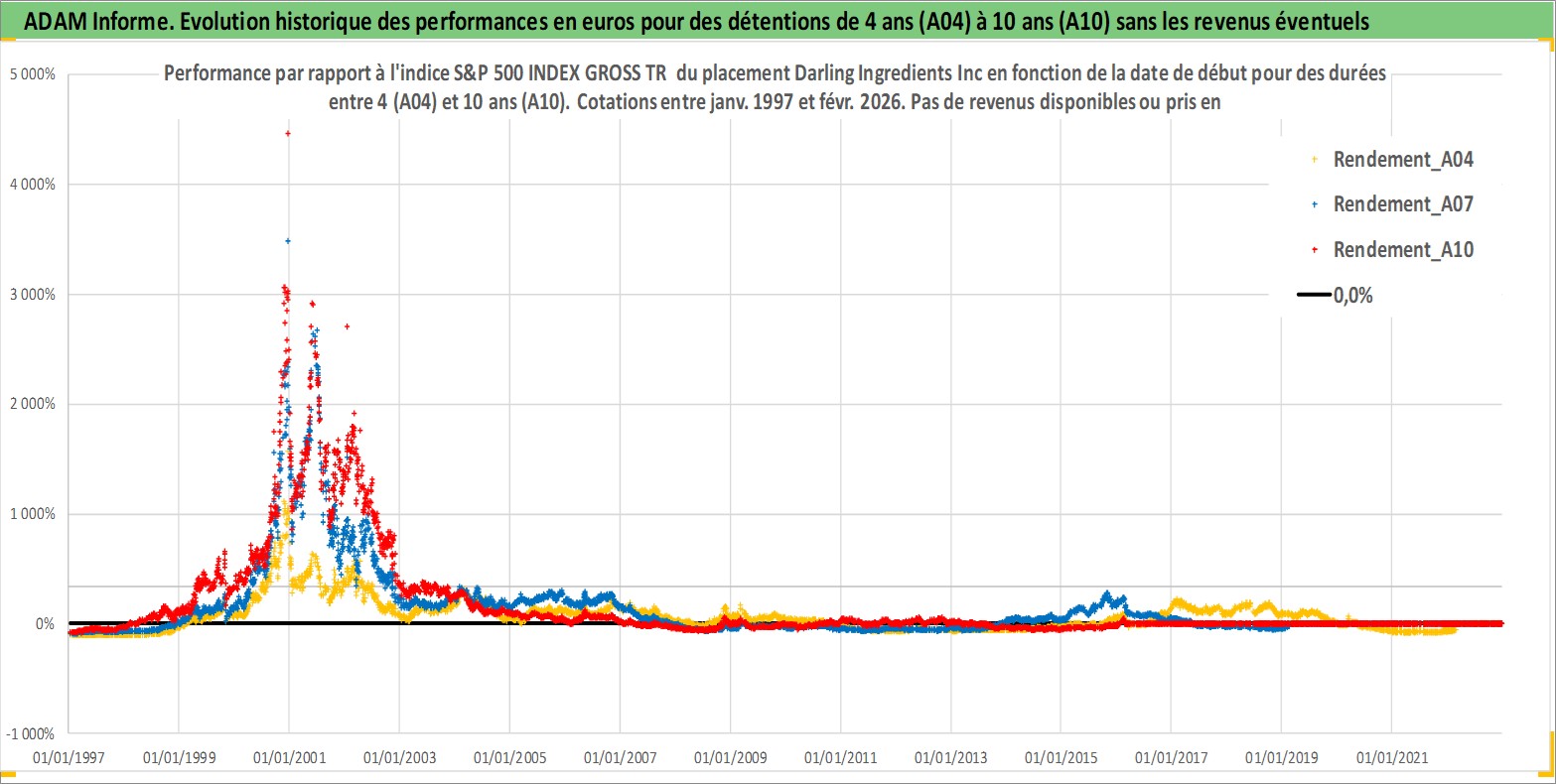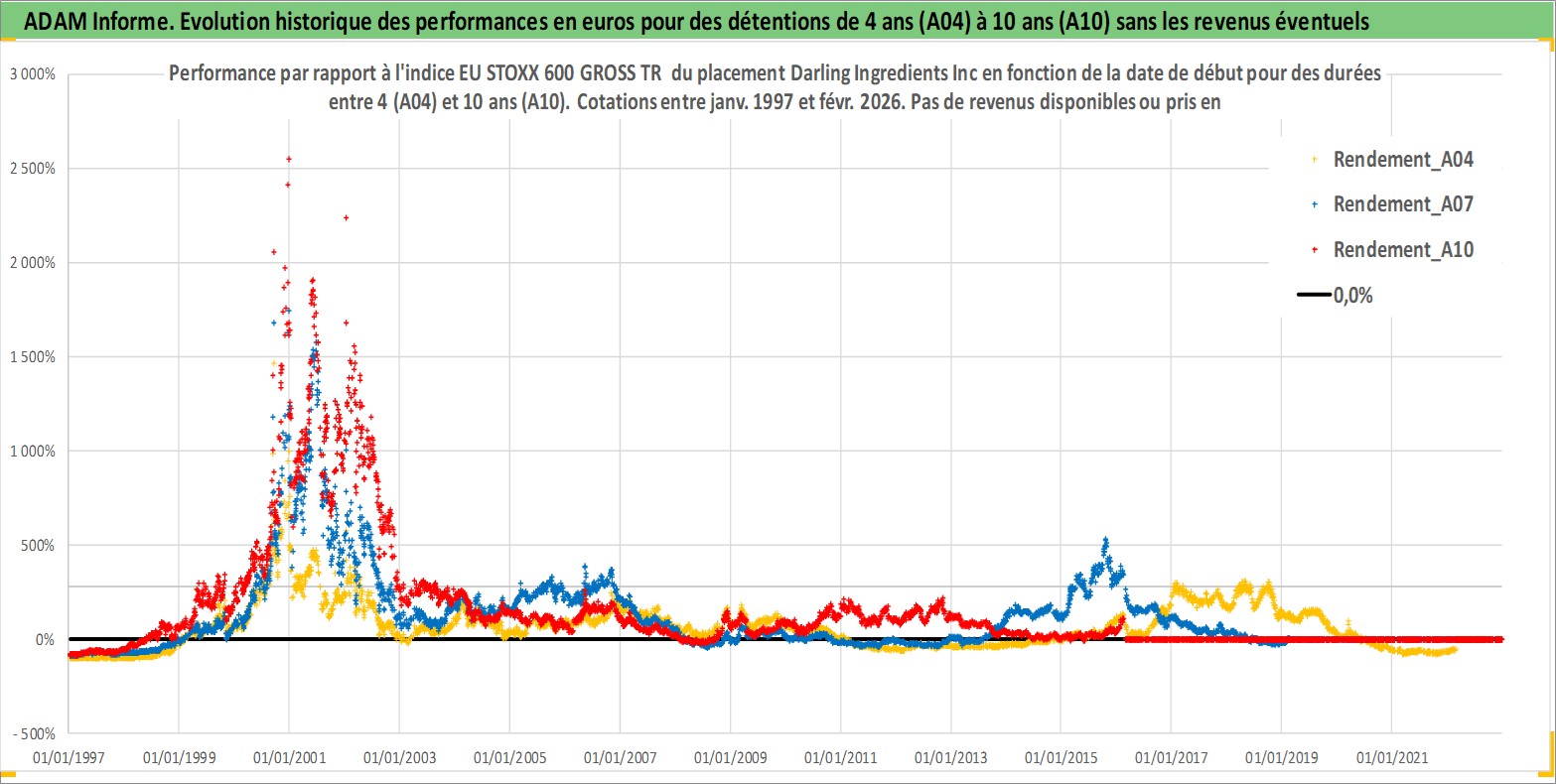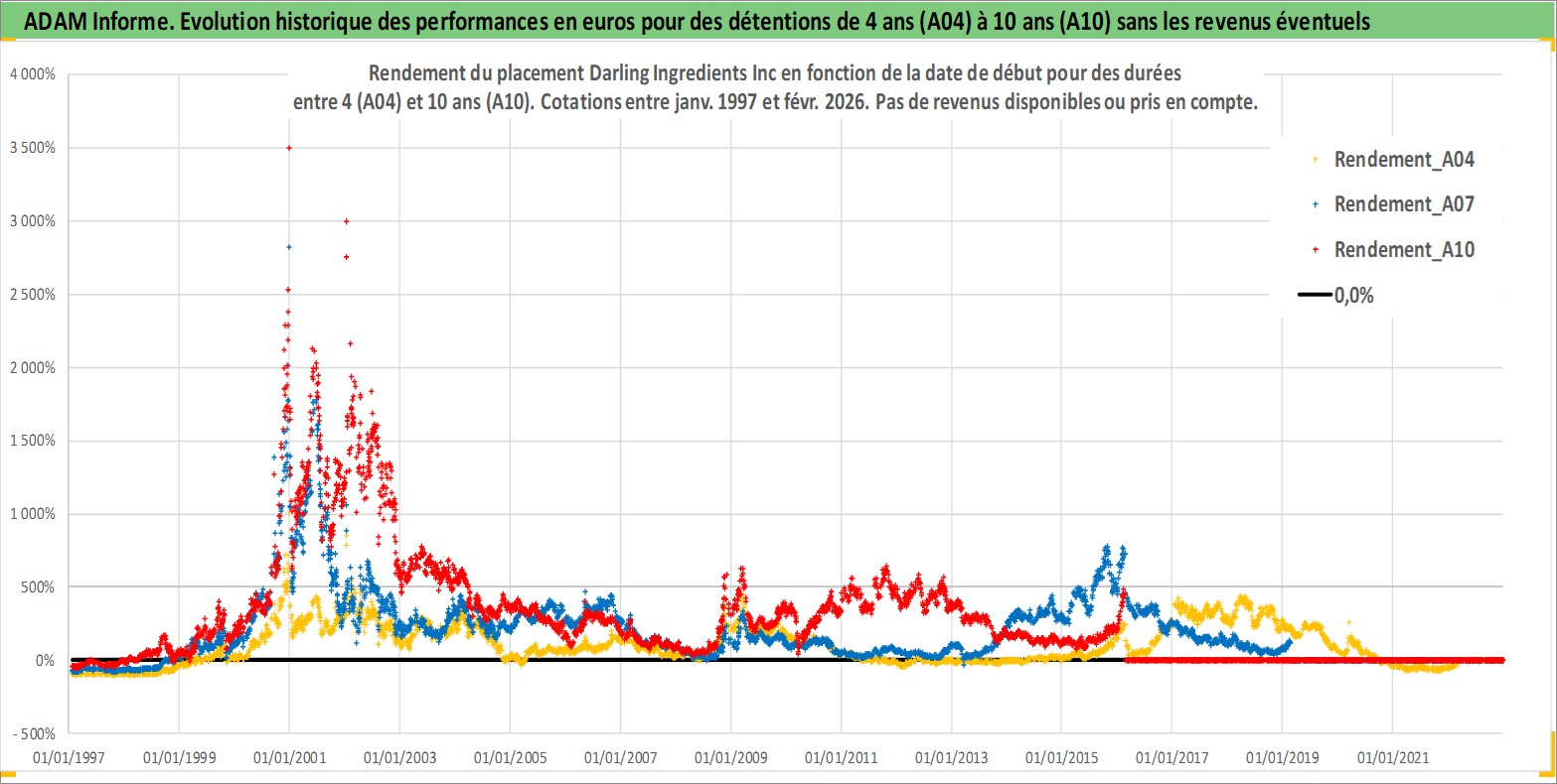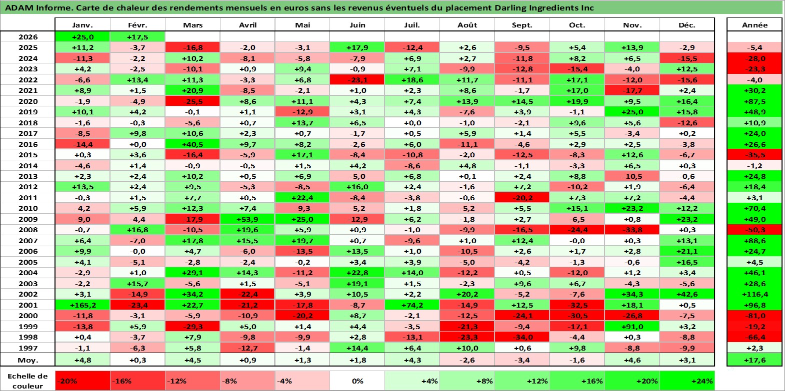 Site dédié aux investisseursPage dédiée sur site financeAnalyse des valorisations hebdomadaires de l'action Darling Ingredients Inc. Cet actif est cote en USD. Les valorisations sont en contrevaleur EURO et couvrent les semaines 1997W01 a 2026W09. Les revenus de cet actif financier ne sont pas connus car non existants ou non disponibles sur le site Yahoo Finance. La note ESG de cet actif n'est pas connue.