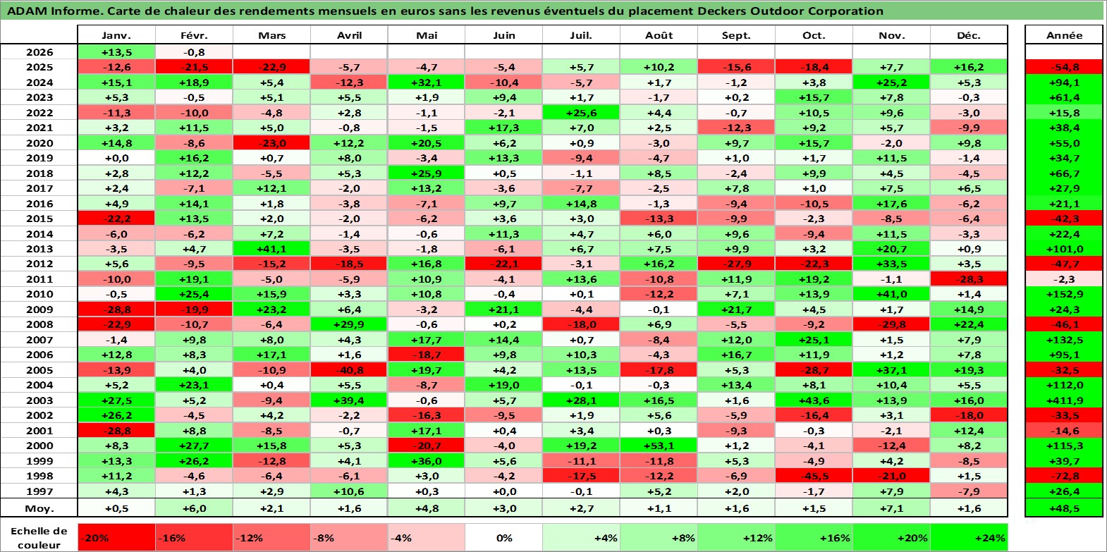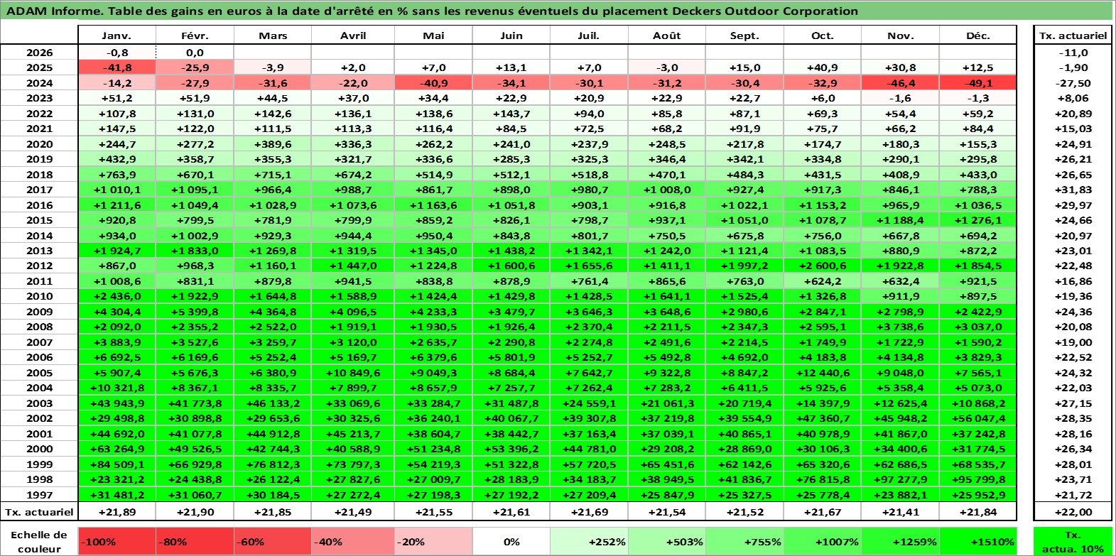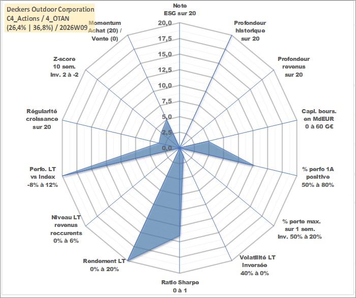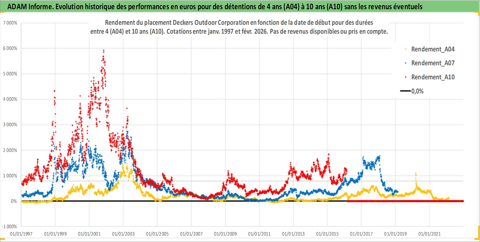 Site dédié aux investisseursPage dédiée sur site financeAnalyse des valorisations hebdomadaires de l'action Deckers Outdoor Corporation. Cet actif est cote en USD. Les valorisations sont en contrevaleur EURO et couvrent les semaines 1997W01 a 2026W09. Les revenus de cet actif financier ne sont pas connus car non existants ou non disponibles sur le site Yahoo Finance. La note ESG de cet actif n'est pas connue.