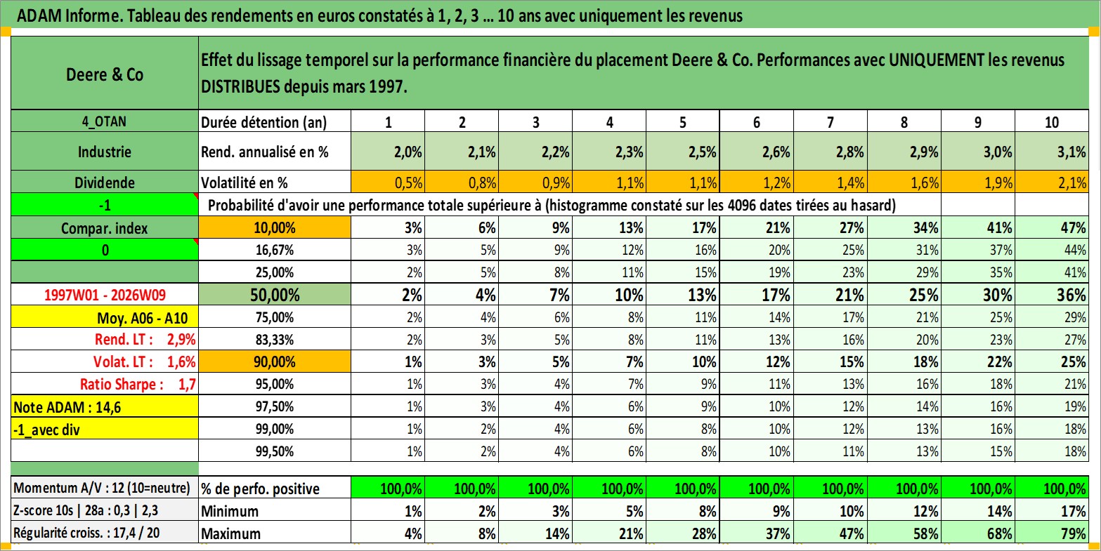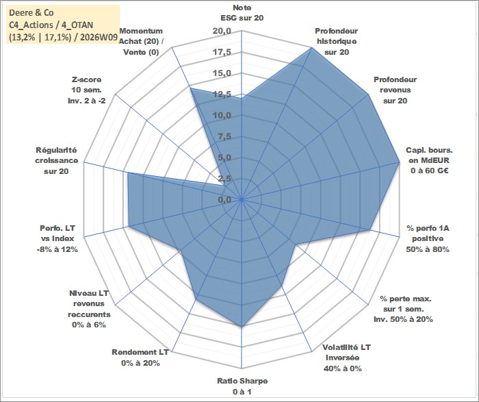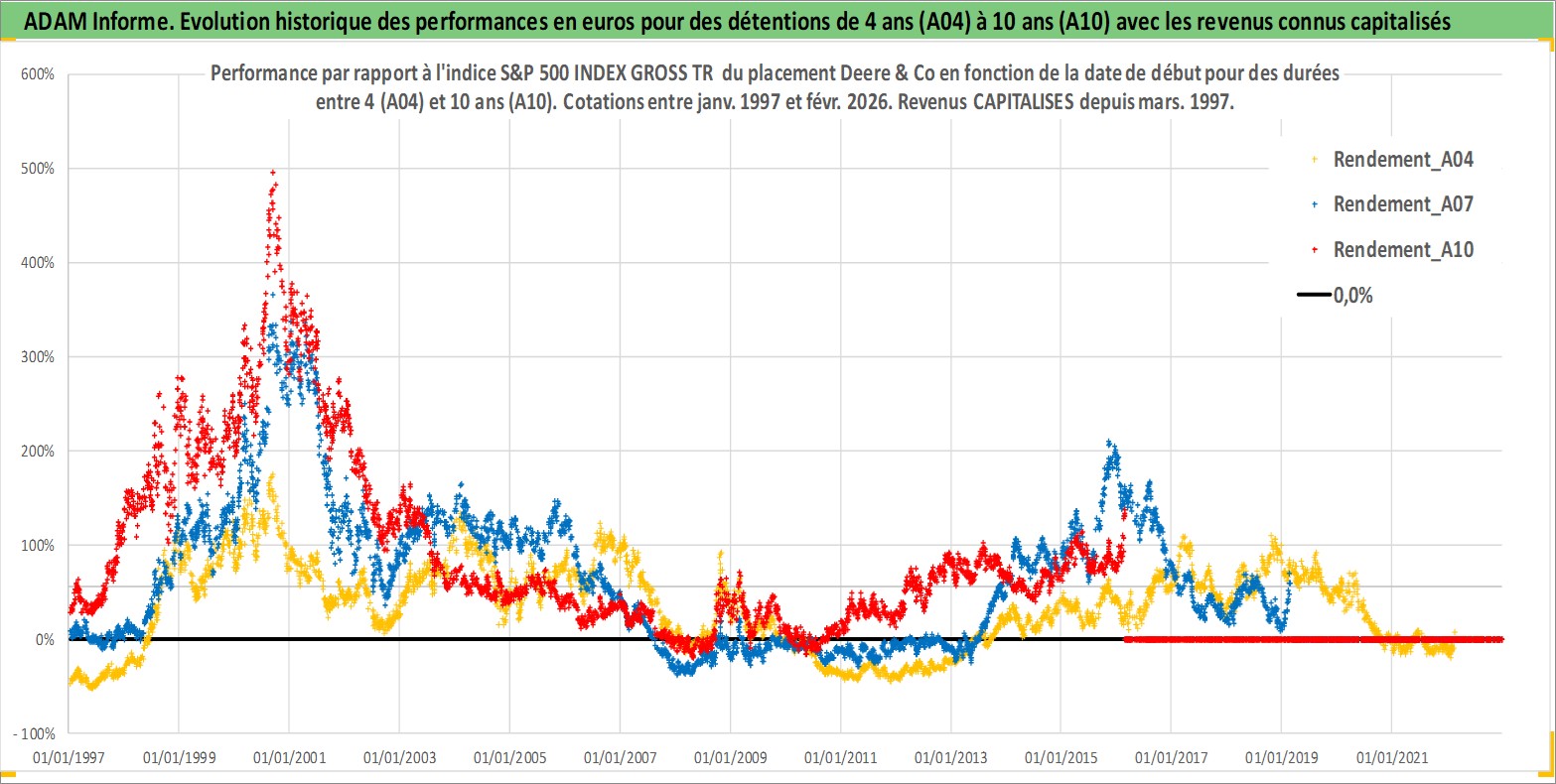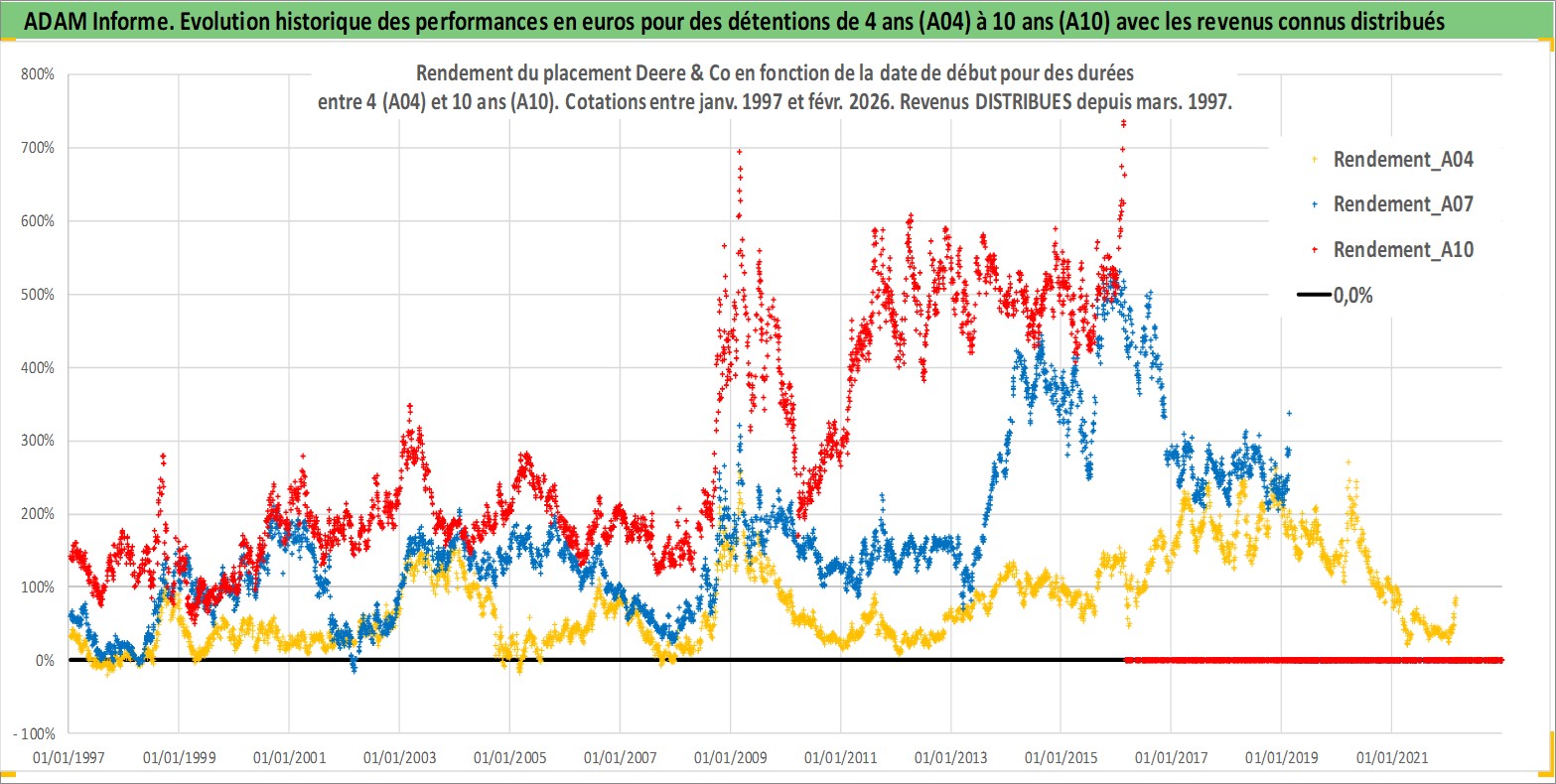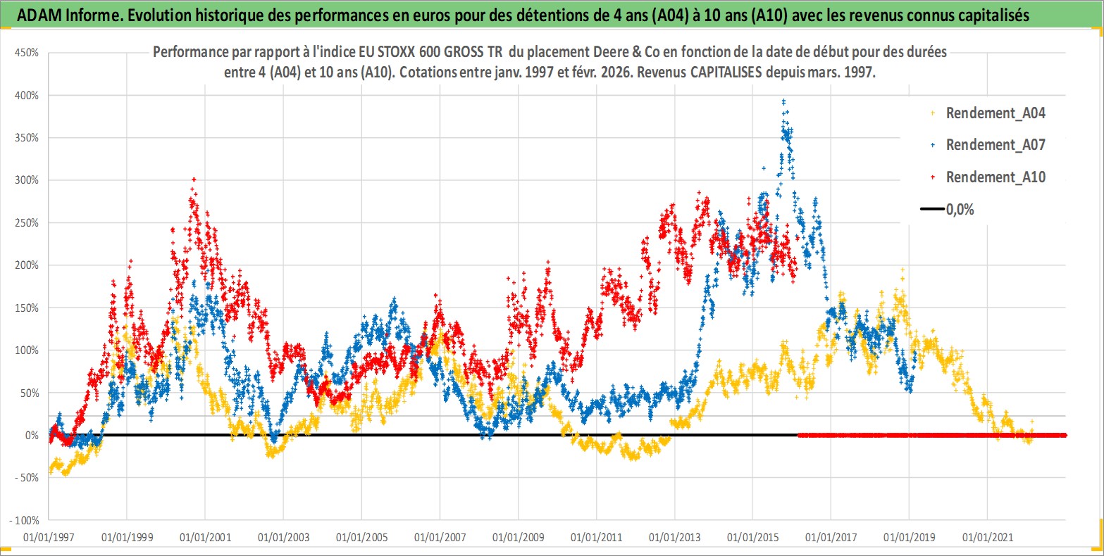 Site dédié aux investisseursPage dédiée sur site financeAnalyse des valorisations hebdomadaires de l'action Deere & Co. Cet actif est cote en USD. Les valorisations sont en contrevaleur EURO et couvrent les semaines 1997W01 a 2026W09. Les revenus de cet actif financier sont pris en compte depuis la semaine 1997W13. La note globale ESG de cet actif est estimee a 12.0 (apres rebasage entre 0 et 20).