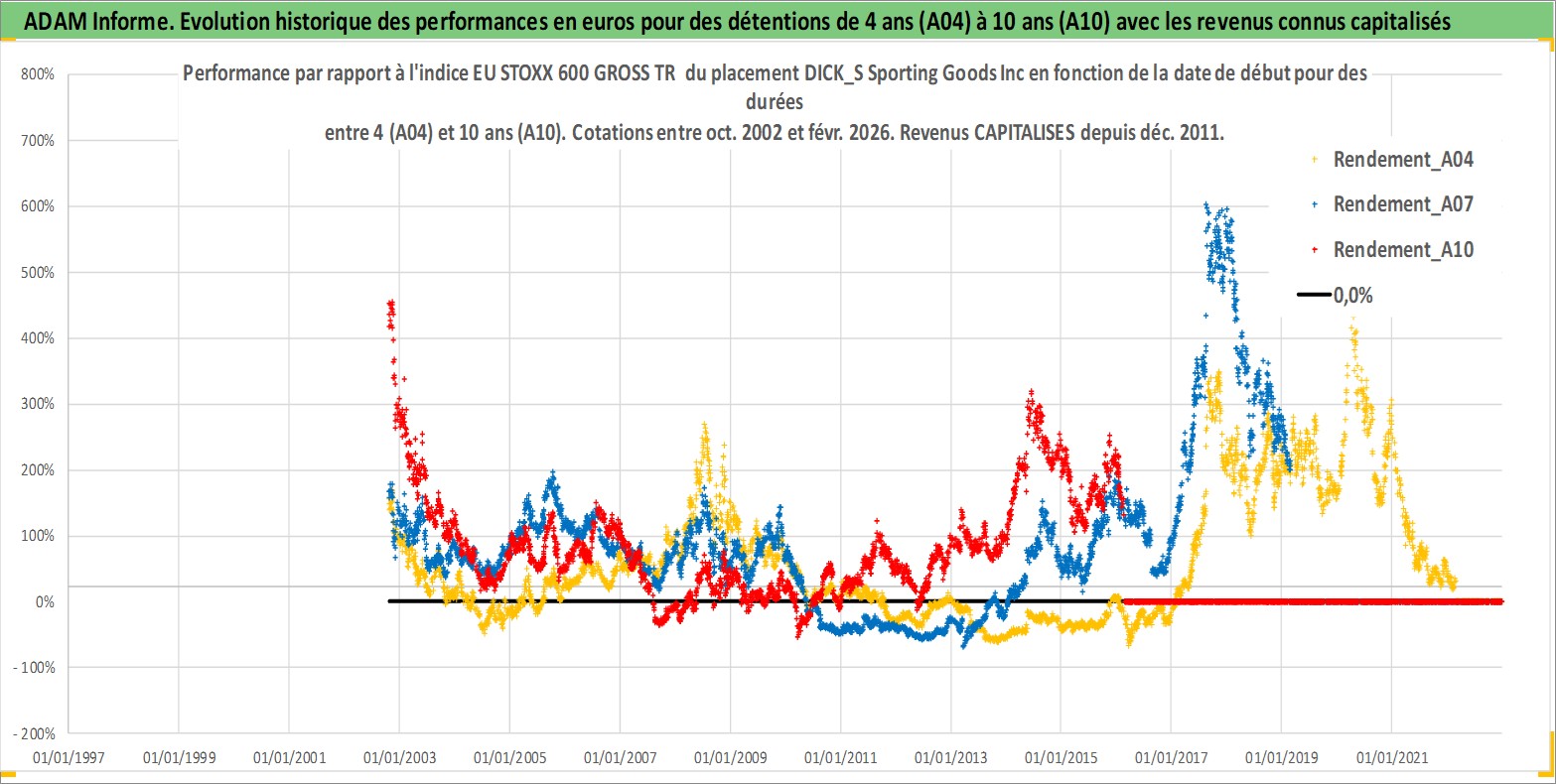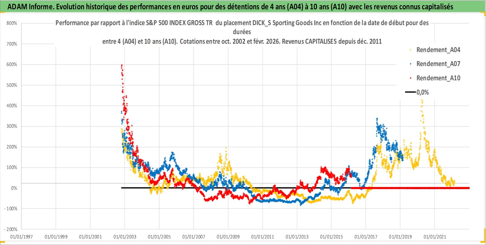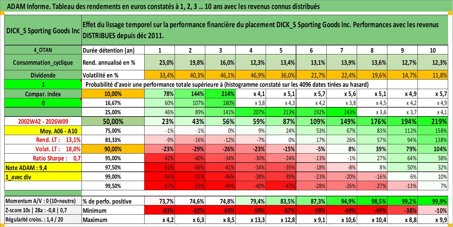 Site dédié aux investisseursPage dédiée sur site financeAnalyse des valorisations hebdomadaires de l'action DICK_S Sporting Goods Inc. Cet actif est cote en USD. Les valorisations sont en contrevaleur EURO et couvrent les semaines 2002W42 a 2026W09. Les revenus de cet actif financier sont pris en compte depuis la semaine 2011W49. La note globale ESG de cet actif est estimee a 13.0 (apres rebasage entre 0 et 20).