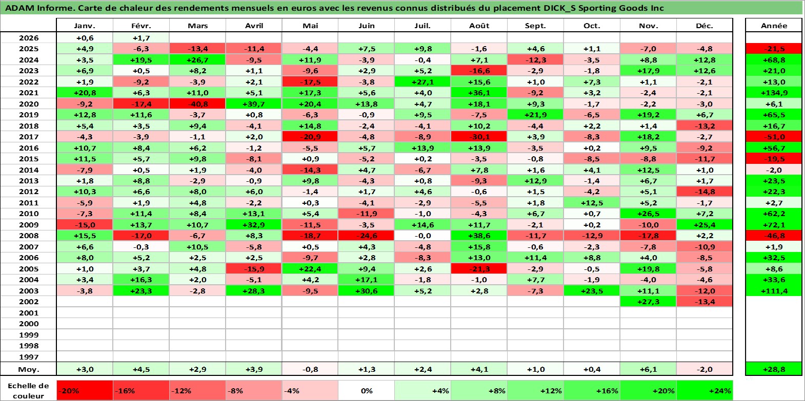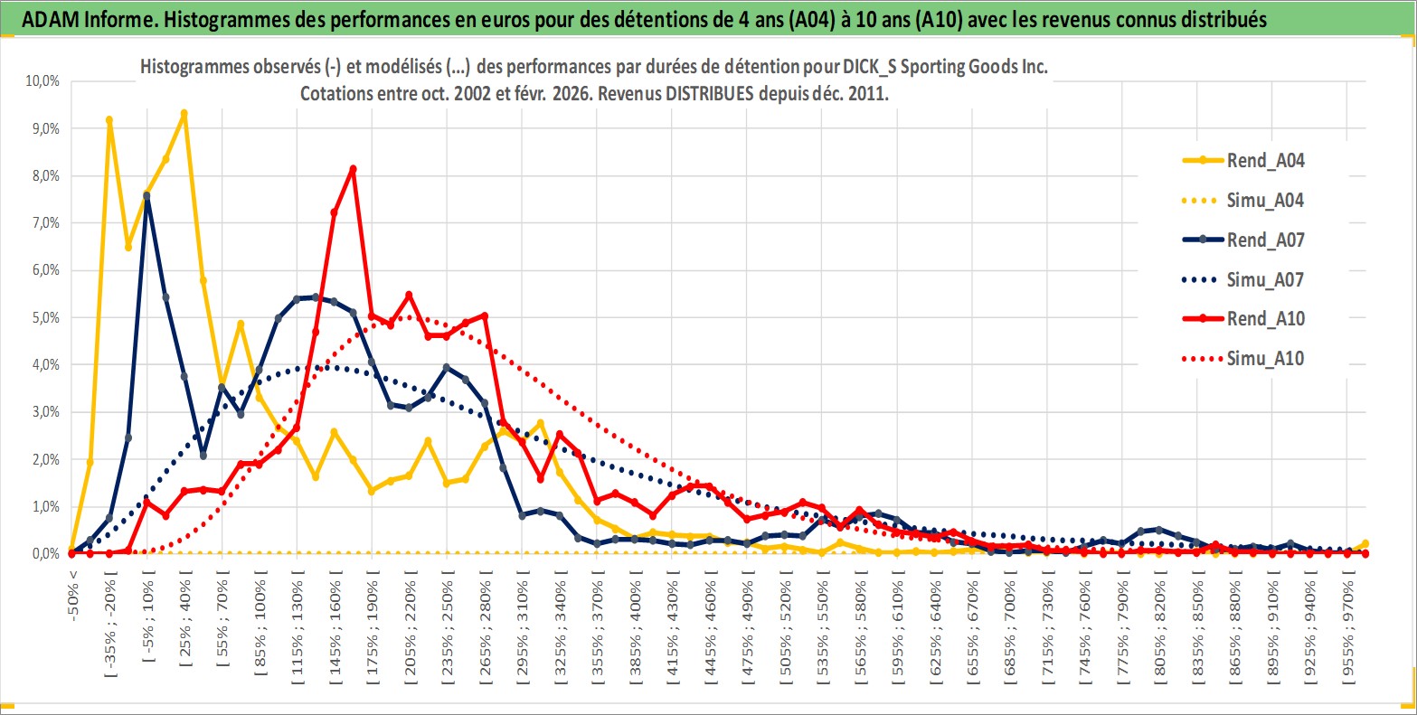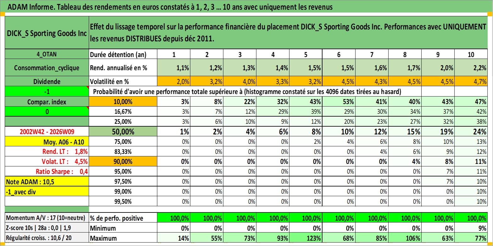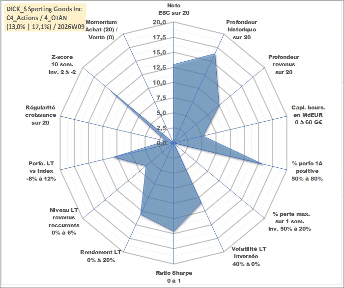 Site dédié aux investisseursPage dédiée sur site financeAnalyse des valorisations hebdomadaires de l'action DICK_S Sporting Goods Inc. Cet actif est cote en USD. Les valorisations sont en contrevaleur EURO et couvrent les semaines 2002W42 a 2026W09. Les revenus de cet actif financier sont pris en compte depuis la semaine 2011W49. La note globale ESG de cet actif est estimee a 13.0 (apres rebasage entre 0 et 20).