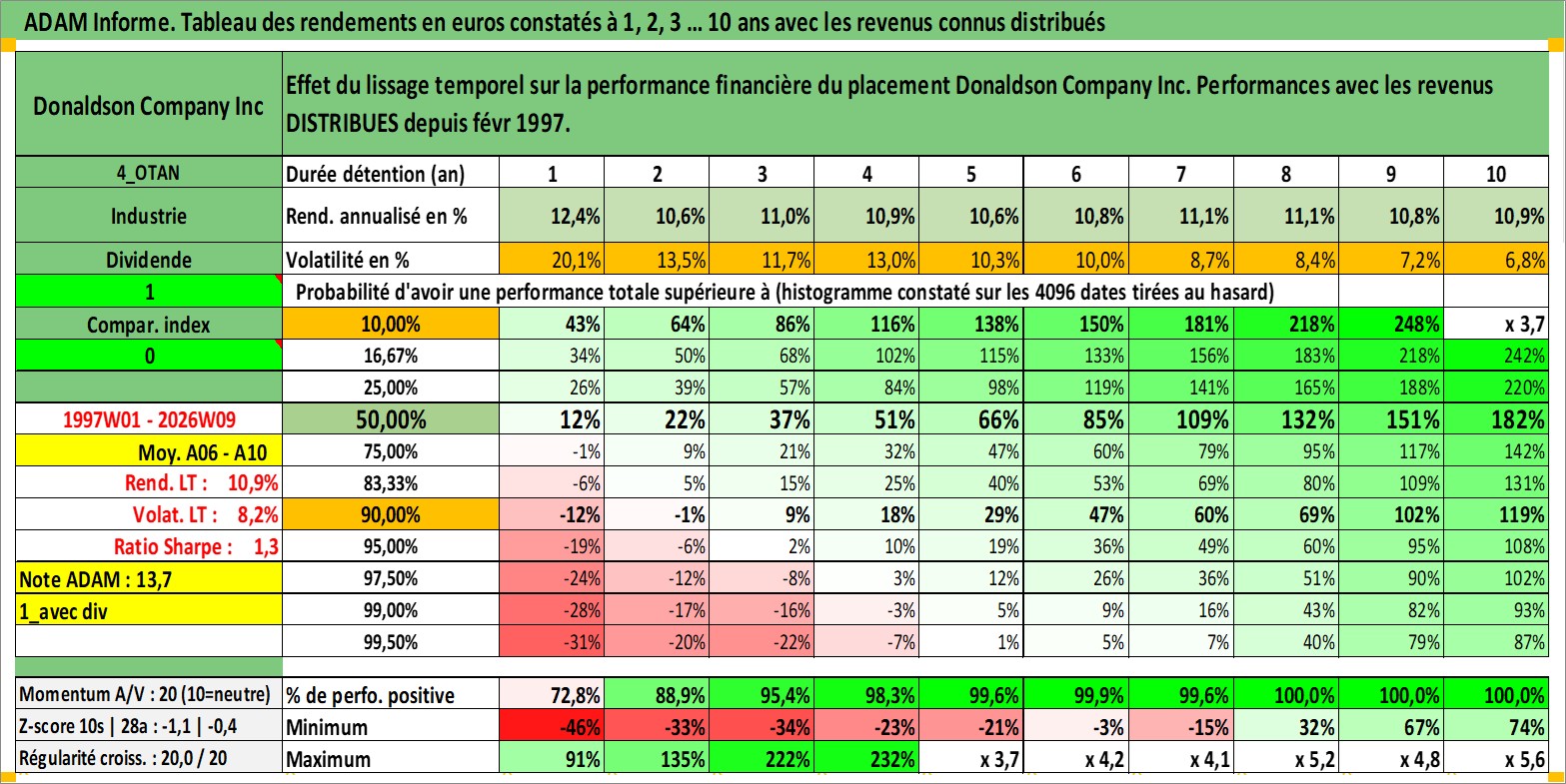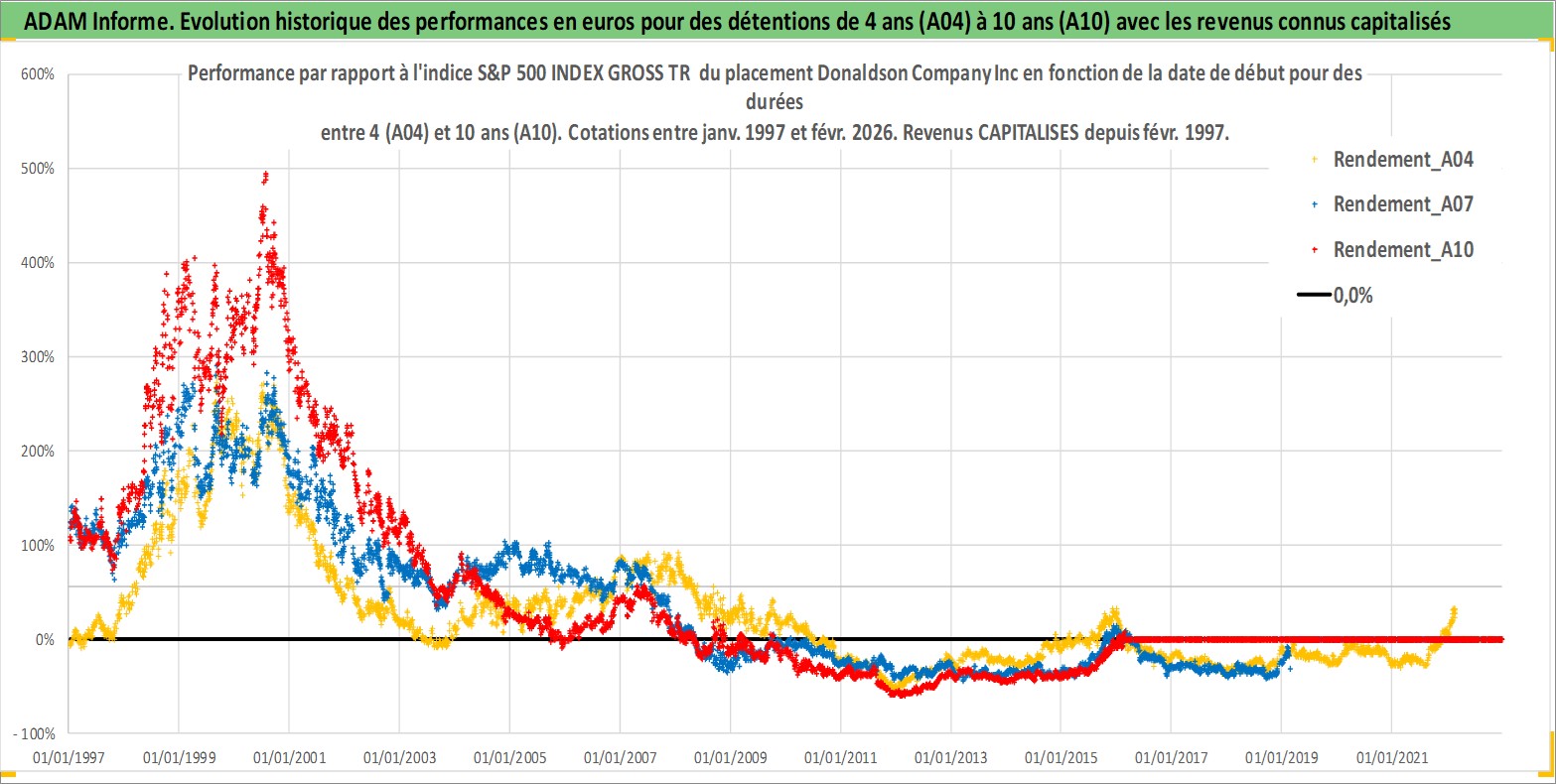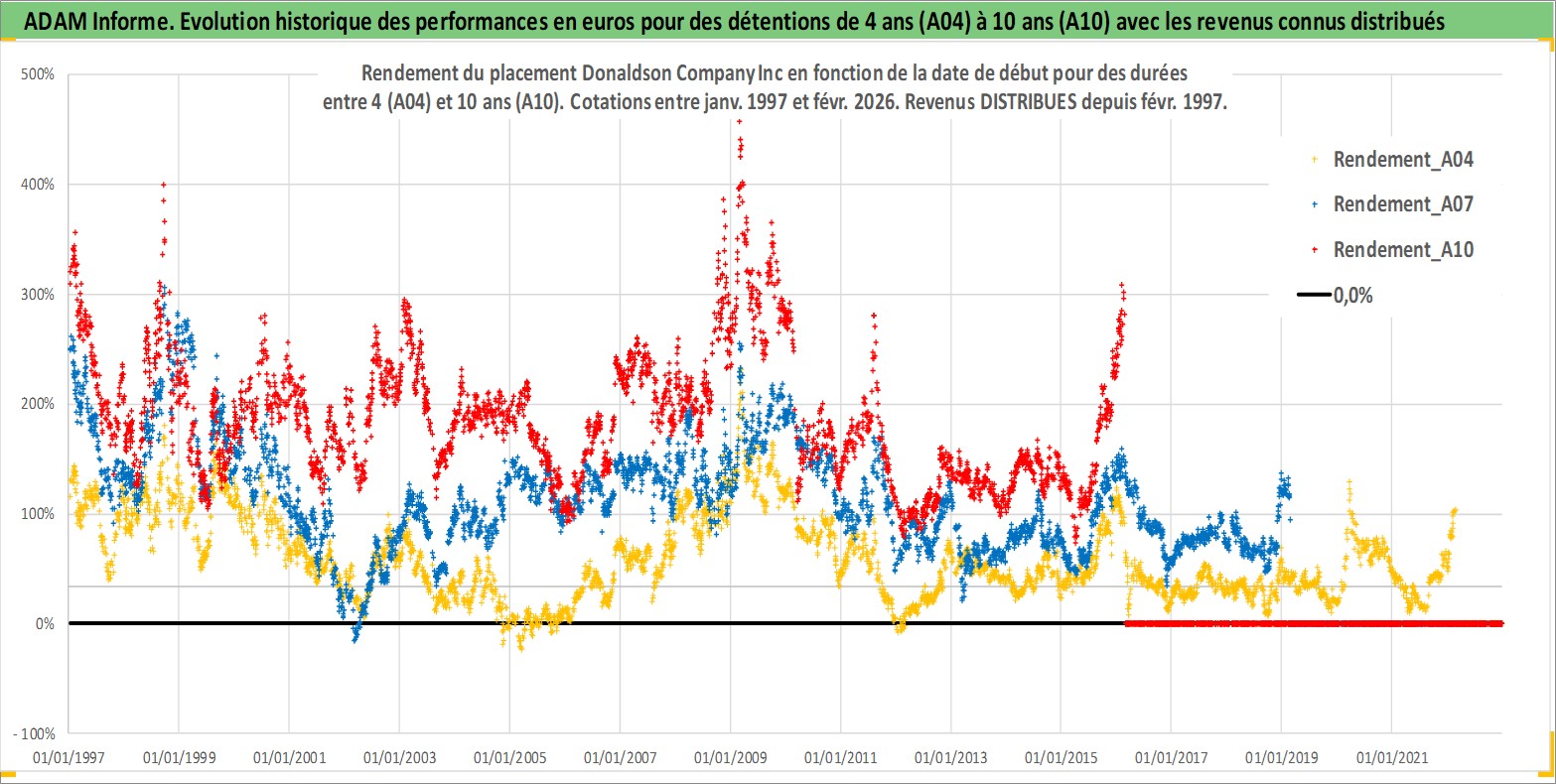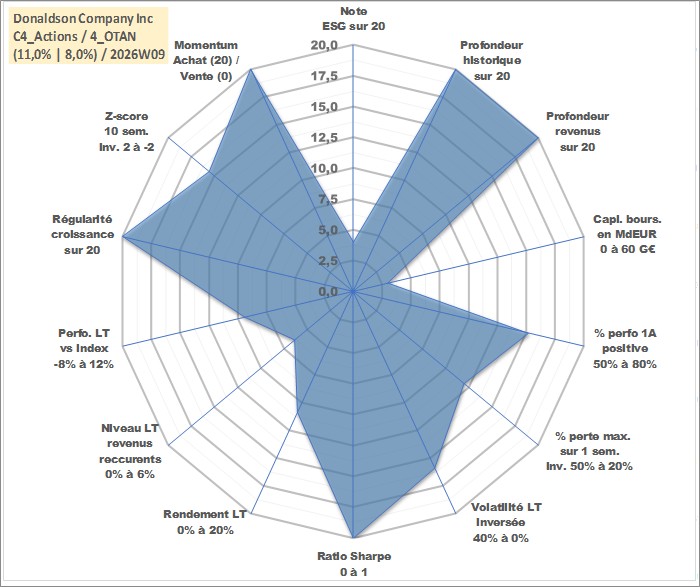 Site dédié aux investisseursPage dédiée sur site financeAnalyse des valorisations hebdomadaires de l'action Donaldson Company Inc. Cet actif est cote en USD. Les valorisations sont en contrevaleur EURO et couvrent les semaines 1997W01 a 2026W09. Les revenus de cet actif financier sont pris en compte depuis la semaine 1997W09. La note globale ESG de cet actif est estimee a 4.0 (apres rebasage entre 0 et 20).