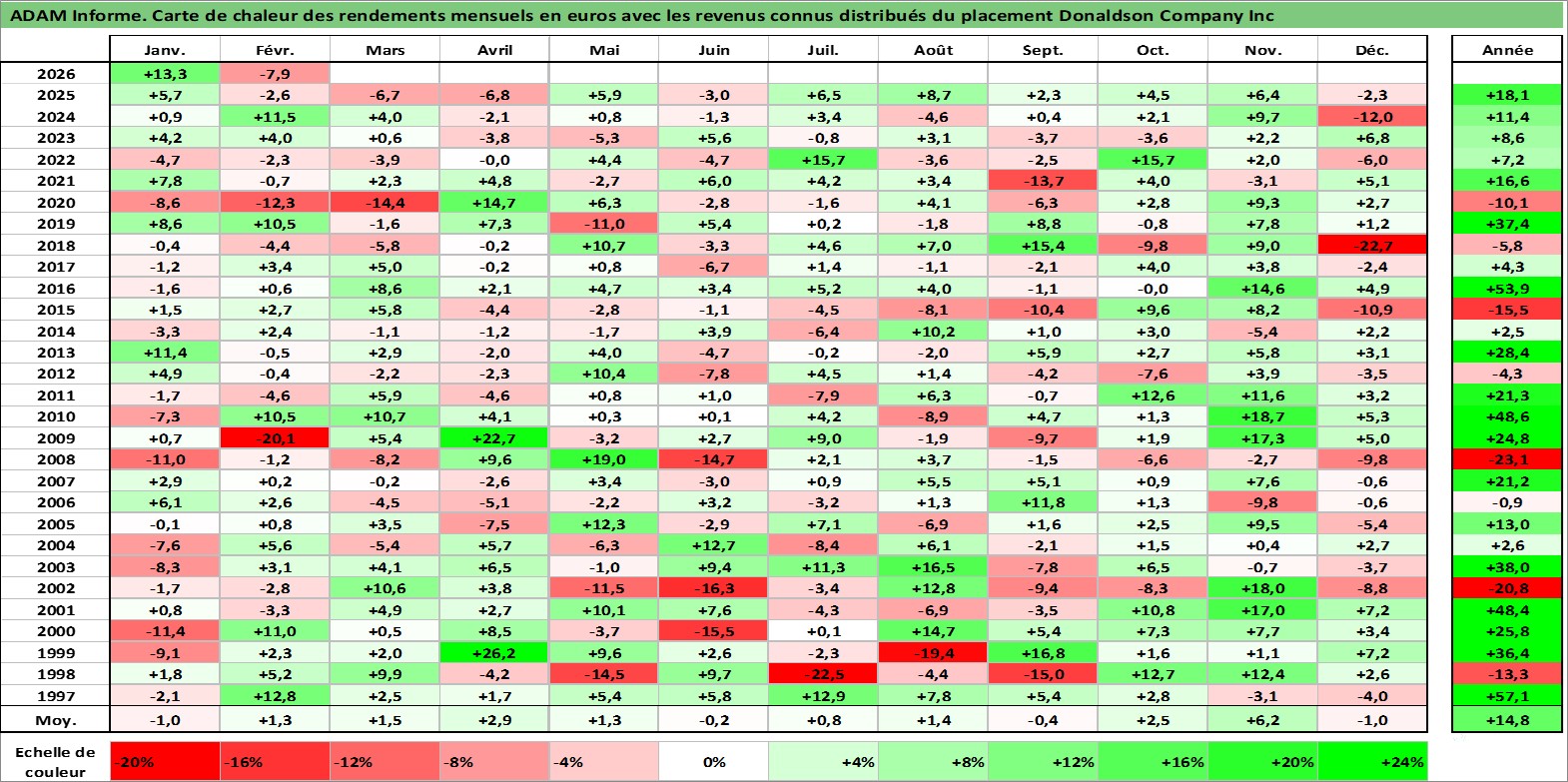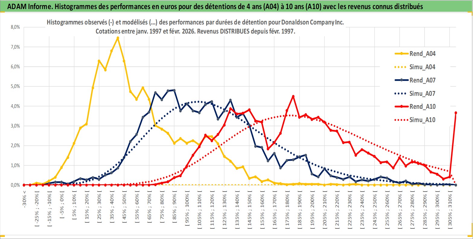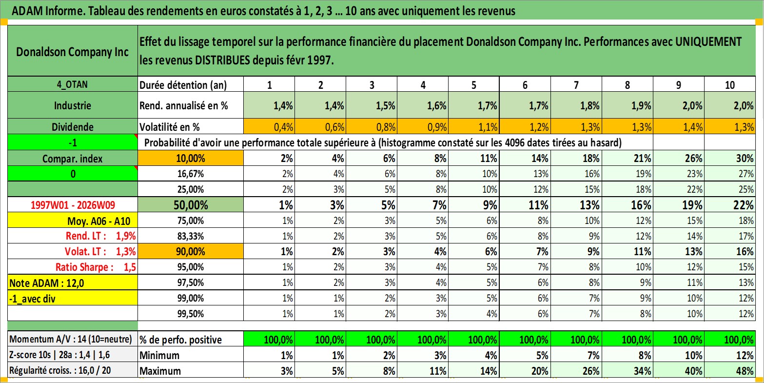 Site dédié aux investisseursPage dédiée sur site financeAnalyse des valorisations hebdomadaires de l'action Donaldson Company Inc. Cet actif est cote en USD. Les valorisations sont en contrevaleur EURO et couvrent les semaines 1997W01 a 2026W09. Les revenus de cet actif financier sont pris en compte depuis la semaine 1997W09. La note globale ESG de cet actif est estimee a 4.0 (apres rebasage entre 0 et 20).
