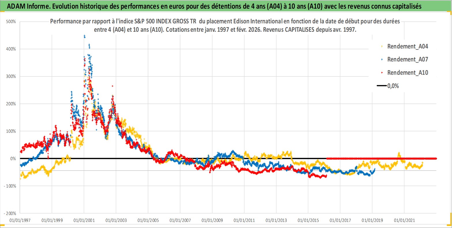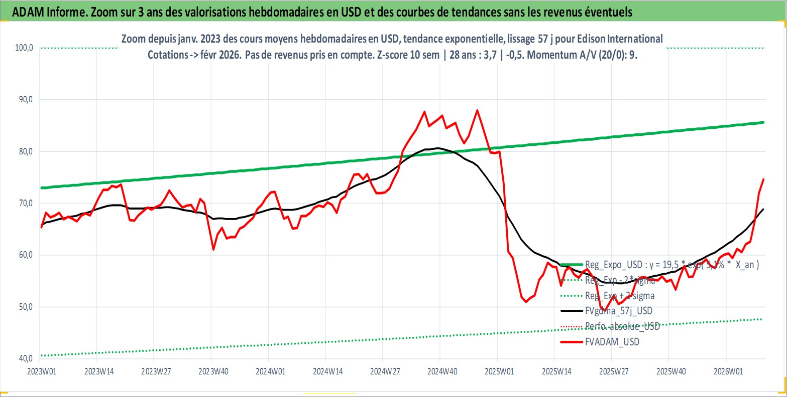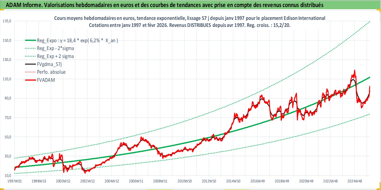 Site dédié aux investisseursPage dédiée sur site financeAnalyse des valorisations hebdomadaires de l'action Edison International. Cet actif est cote en USD. Les valorisations sont en contrevaleur EURO et couvrent les semaines 1997W01 a 2026W09. Les revenus de cet actif financier sont pris en compte depuis la semaine 1997W14. La note globale ESG de cet actif est estimee a 7.0 (apres rebasage entre 0 et 20).