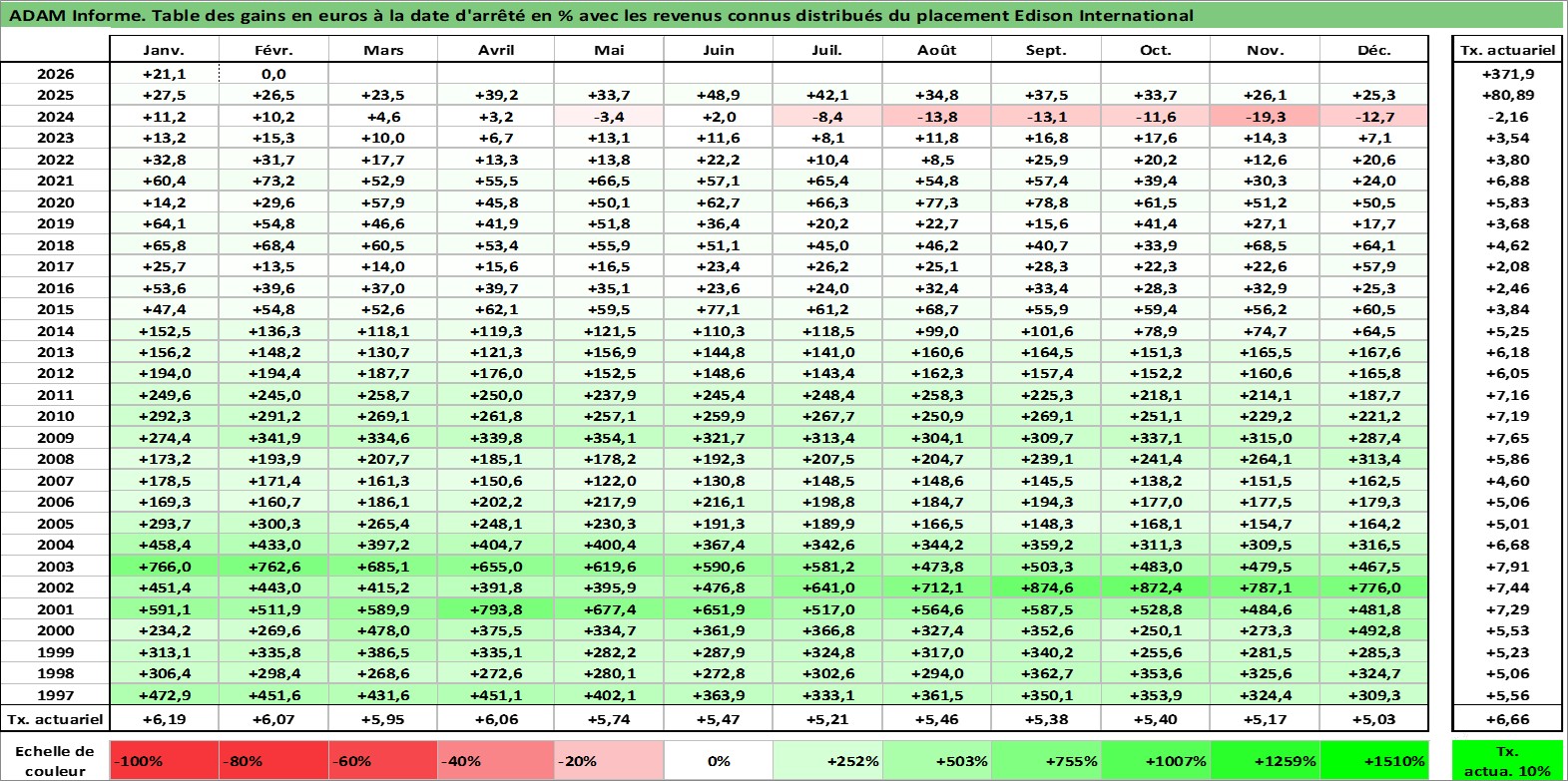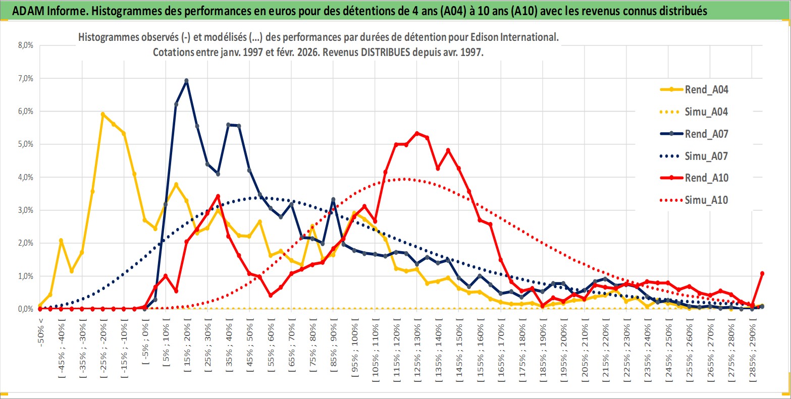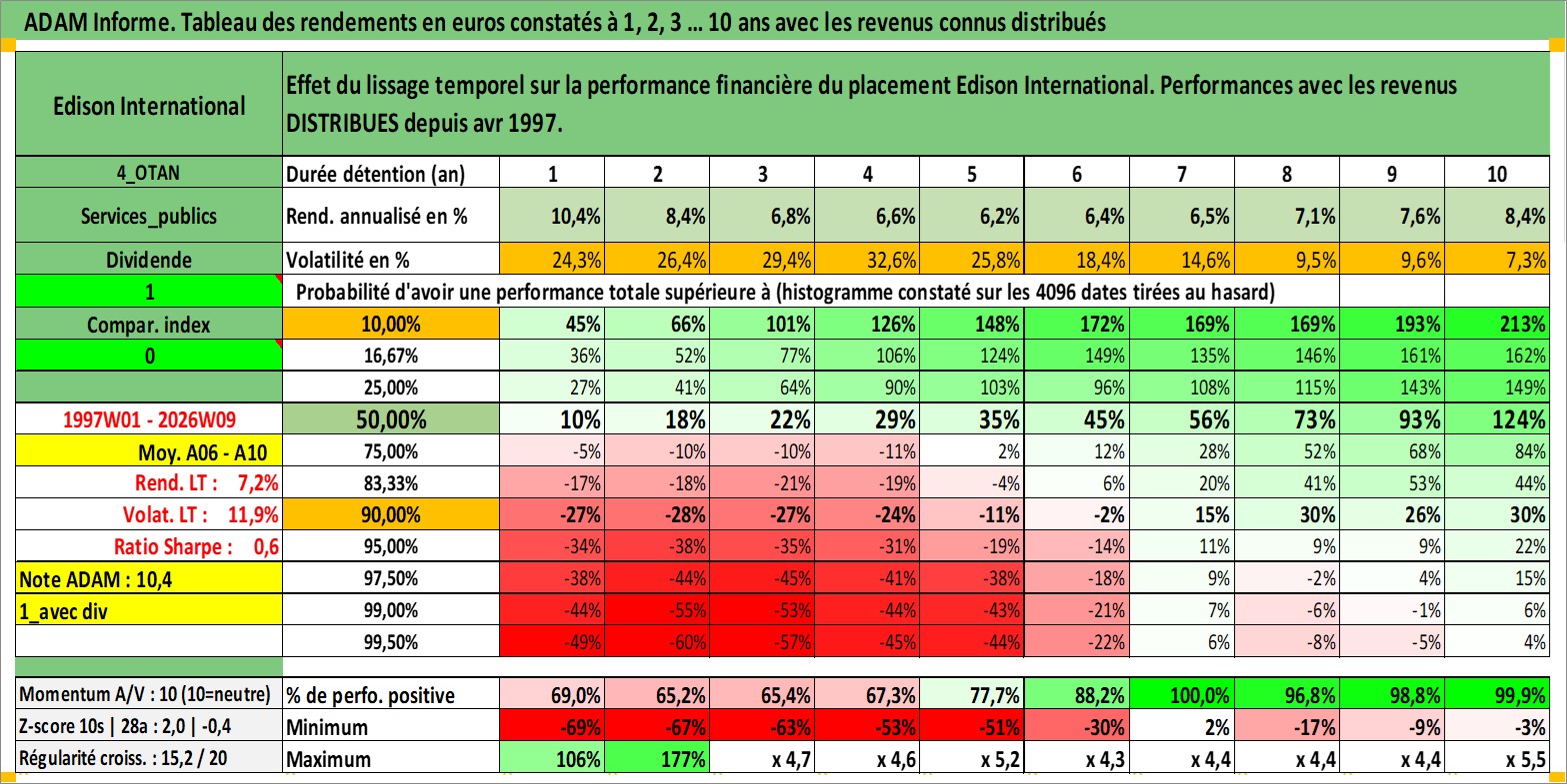 Site dédié aux investisseursPage dédiée sur site financeAnalyse des valorisations hebdomadaires de l'action Edison International. Cet actif est cote en USD. Les valorisations sont en contrevaleur EURO et couvrent les semaines 1997W01 a 2026W09. Les revenus de cet actif financier sont pris en compte depuis la semaine 1997W14. La note globale ESG de cet actif est estimee a 7.0 (apres rebasage entre 0 et 20).