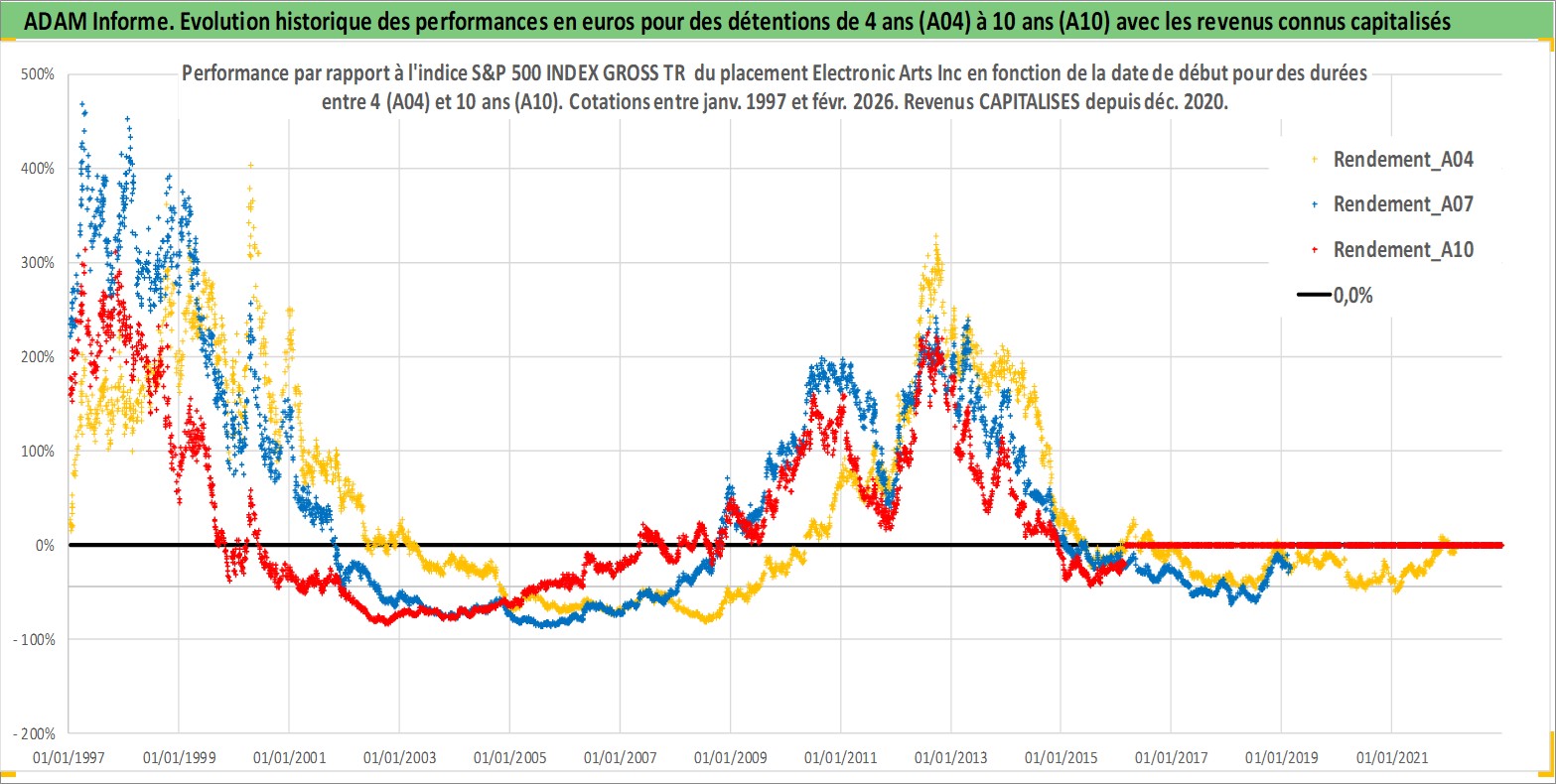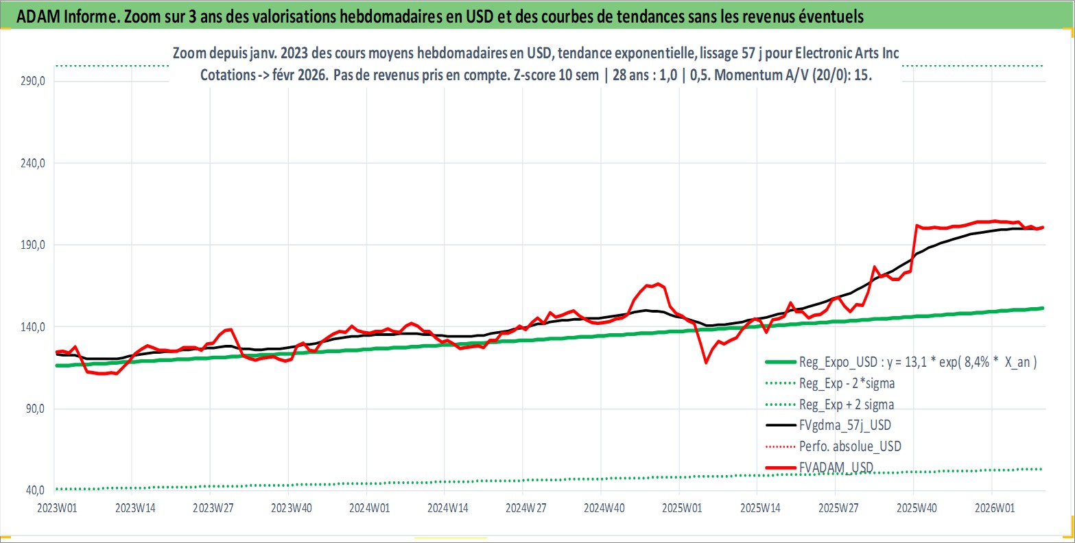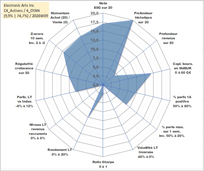 Site dédié aux investisseursPage dédiée sur site financeAnalyse des valorisations hebdomadaires de l'action Electronic Arts Inc. Cet actif est cote en USD. Les valorisations sont en contrevaleur EURO et couvrent les semaines 1997W01 a 2026W09. Les revenus de cet actif financier sont pris en compte depuis la semaine 2020W49. La note globale ESG de cet actif est estimee a 17.0 (apres rebasage entre 0 et 20).