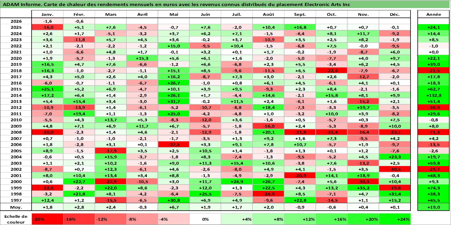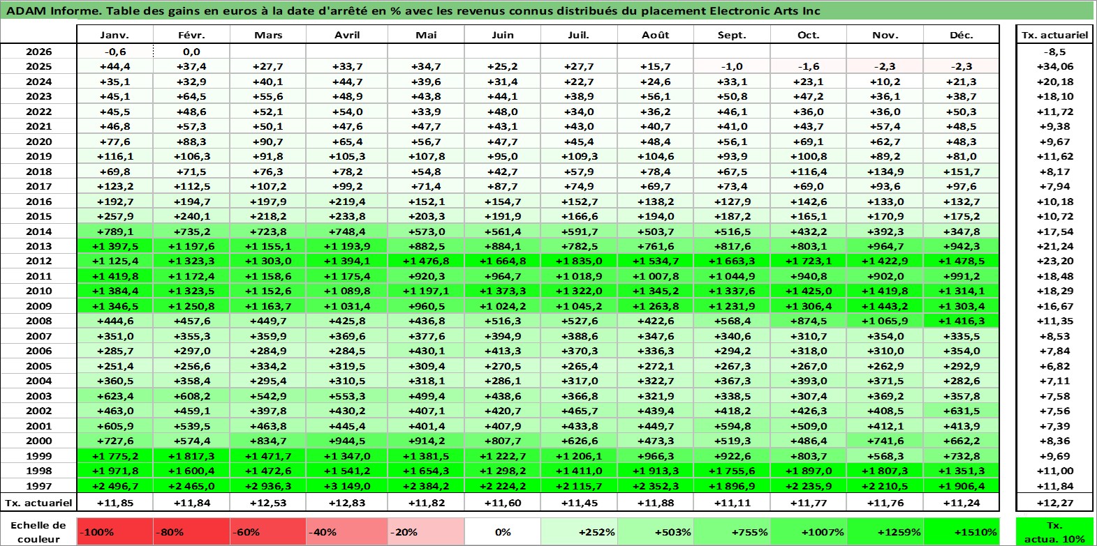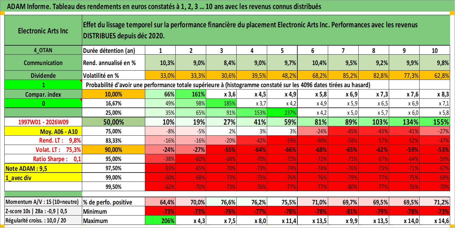 Site dédié aux investisseursPage dédiée sur site financeAnalyse des valorisations hebdomadaires de l'action Electronic Arts Inc. Cet actif est cote en USD. Les valorisations sont en contrevaleur EURO et couvrent les semaines 1997W01 a 2026W09. Les revenus de cet actif financier sont pris en compte depuis la semaine 2020W49. La note globale ESG de cet actif est estimee a 17.0 (apres rebasage entre 0 et 20).